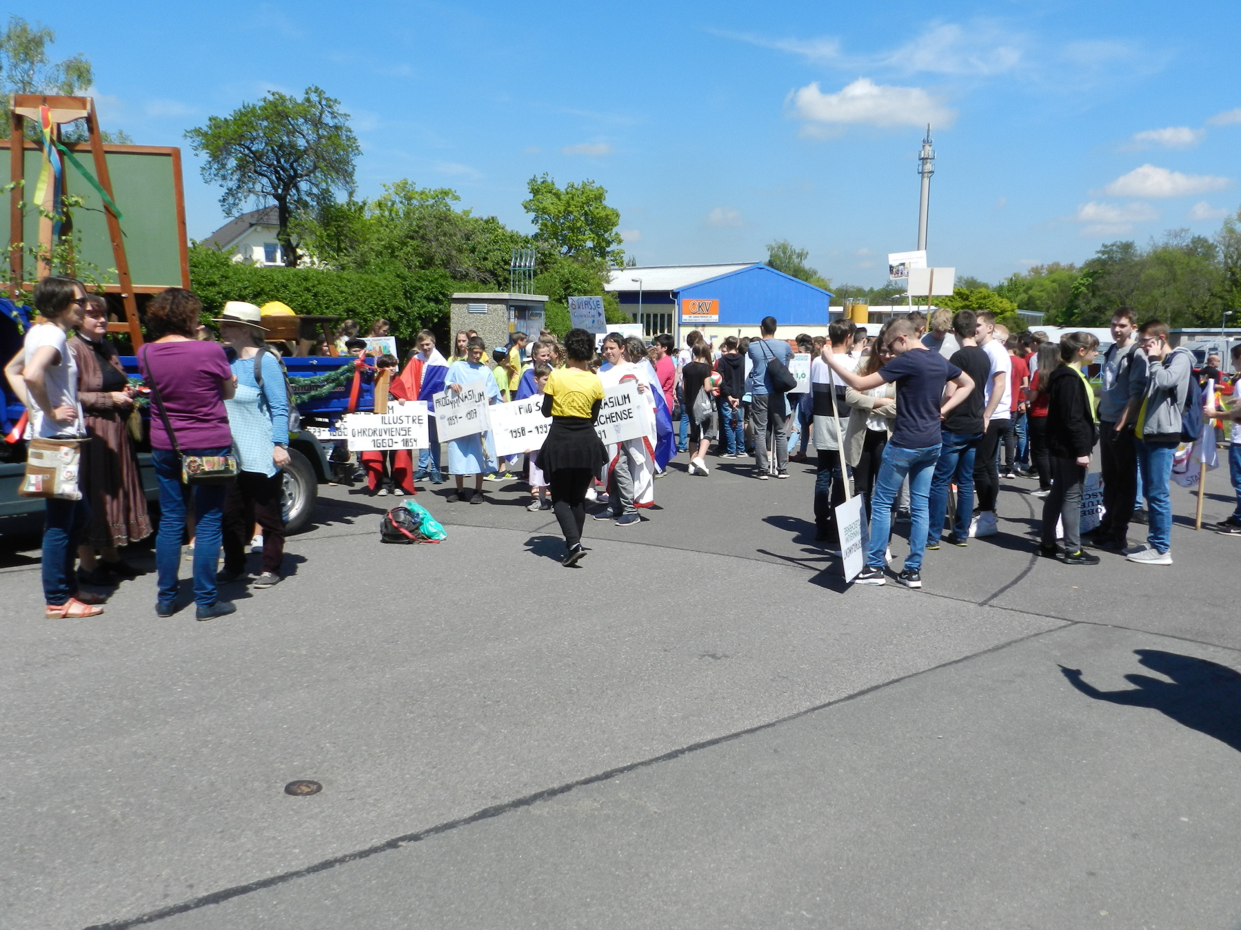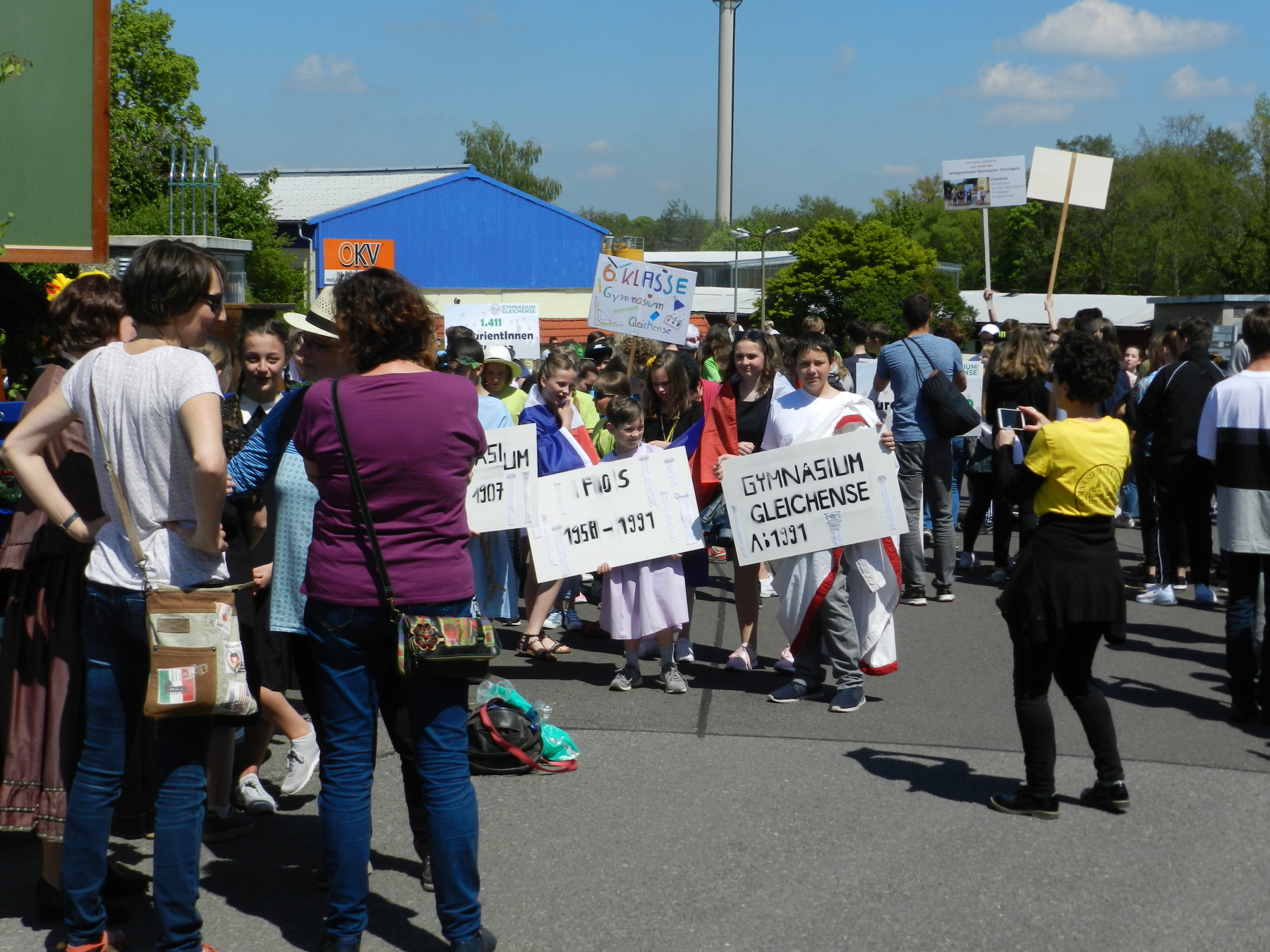 Klassen 5 bis 11, teils in ihren Klassen-Shirts, teils in Römerkleidung oder Sportoutfits. Viele mitgeführten Schilder verwiesen die Zuschauer auf besondere Leistungen (z.B. historische Schulnamen, Sieger in Wettbewerben, Projekte). Der Zuspruch an den Straßenrändern war entsprechend groß.