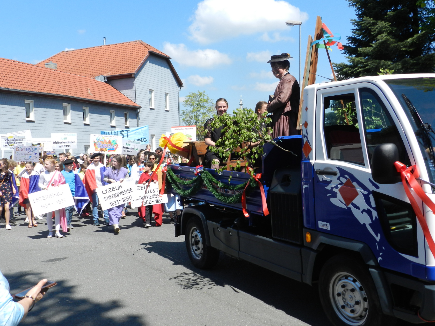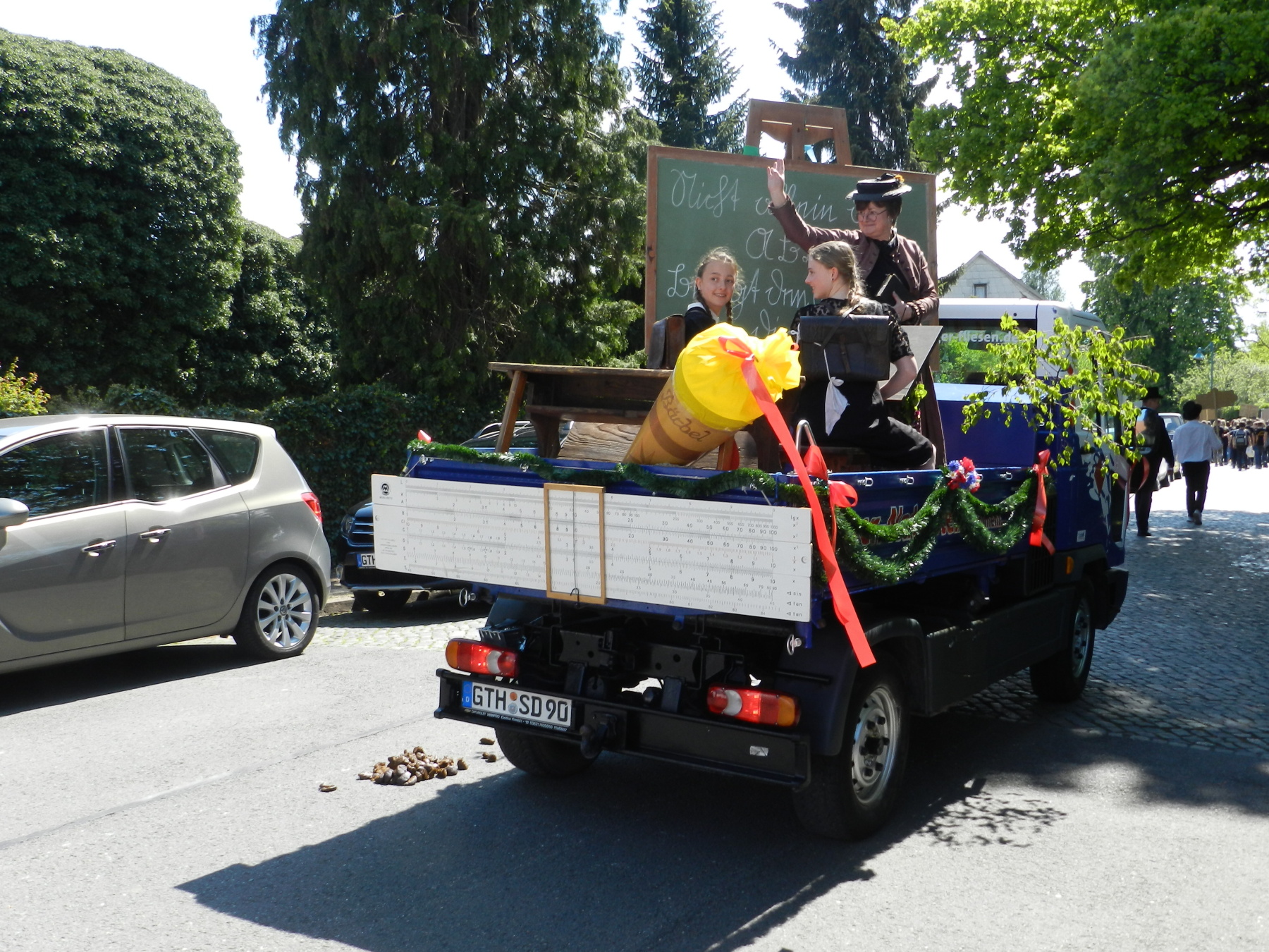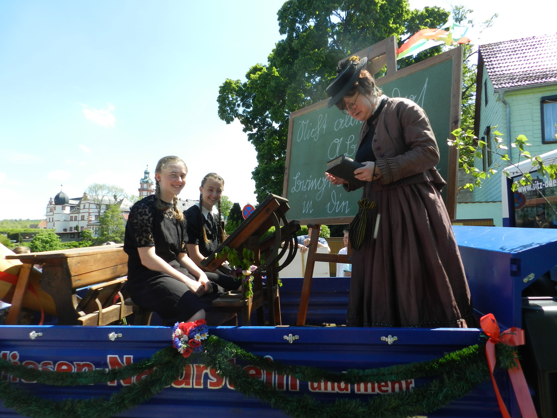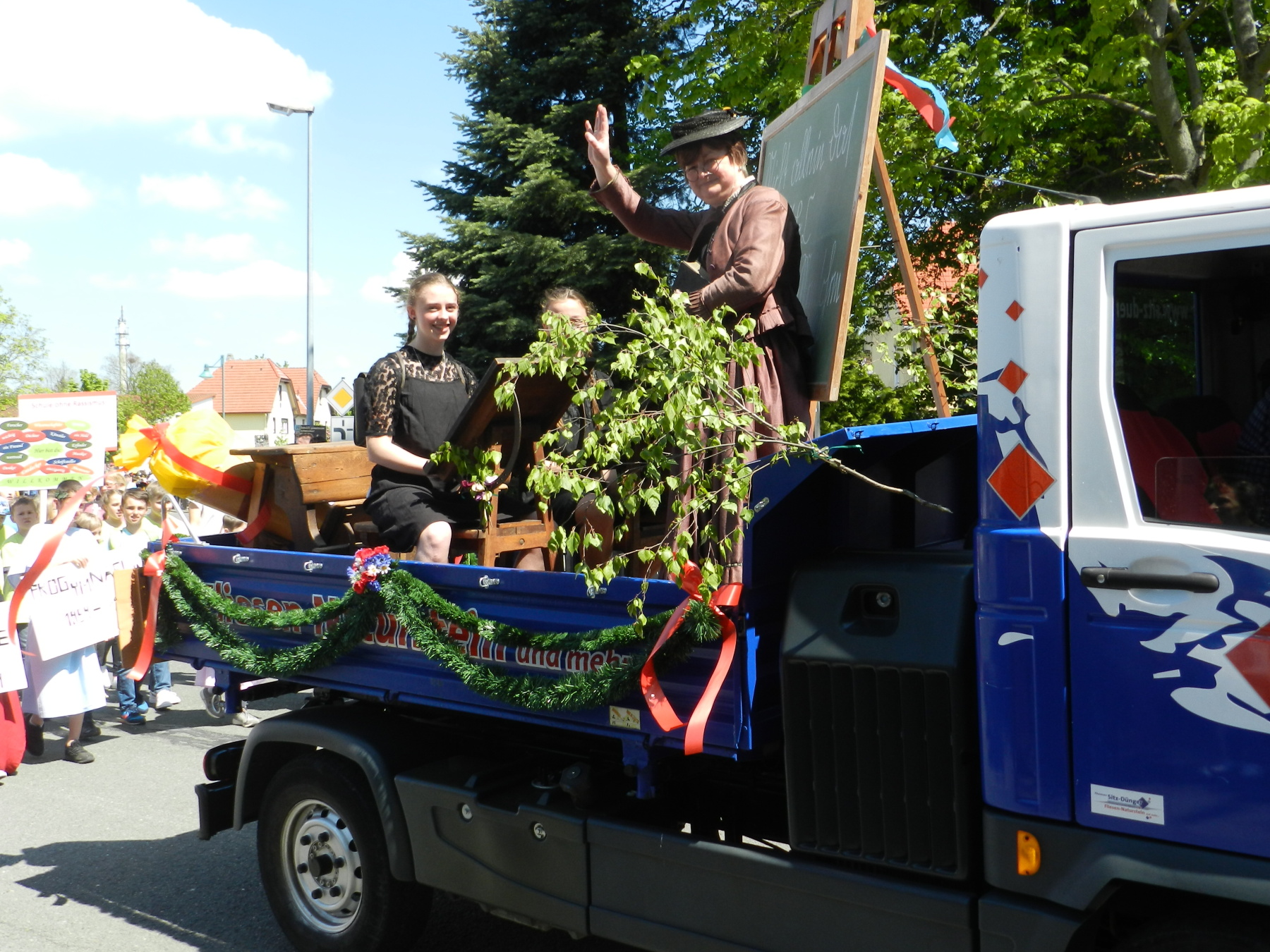 Einem liebevoll geschmückter Festwagen (Schüler und Lehrerin in historischer Kleidung mit alten Schulbänken und Tafel) folgten Schüler und Lehrer der