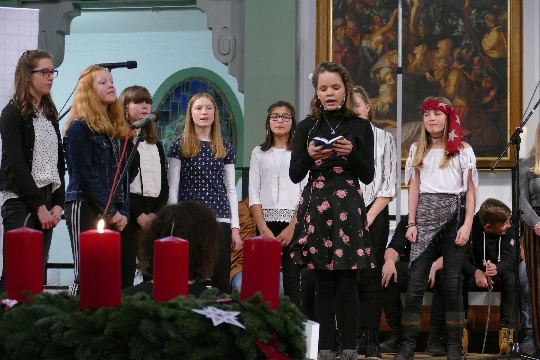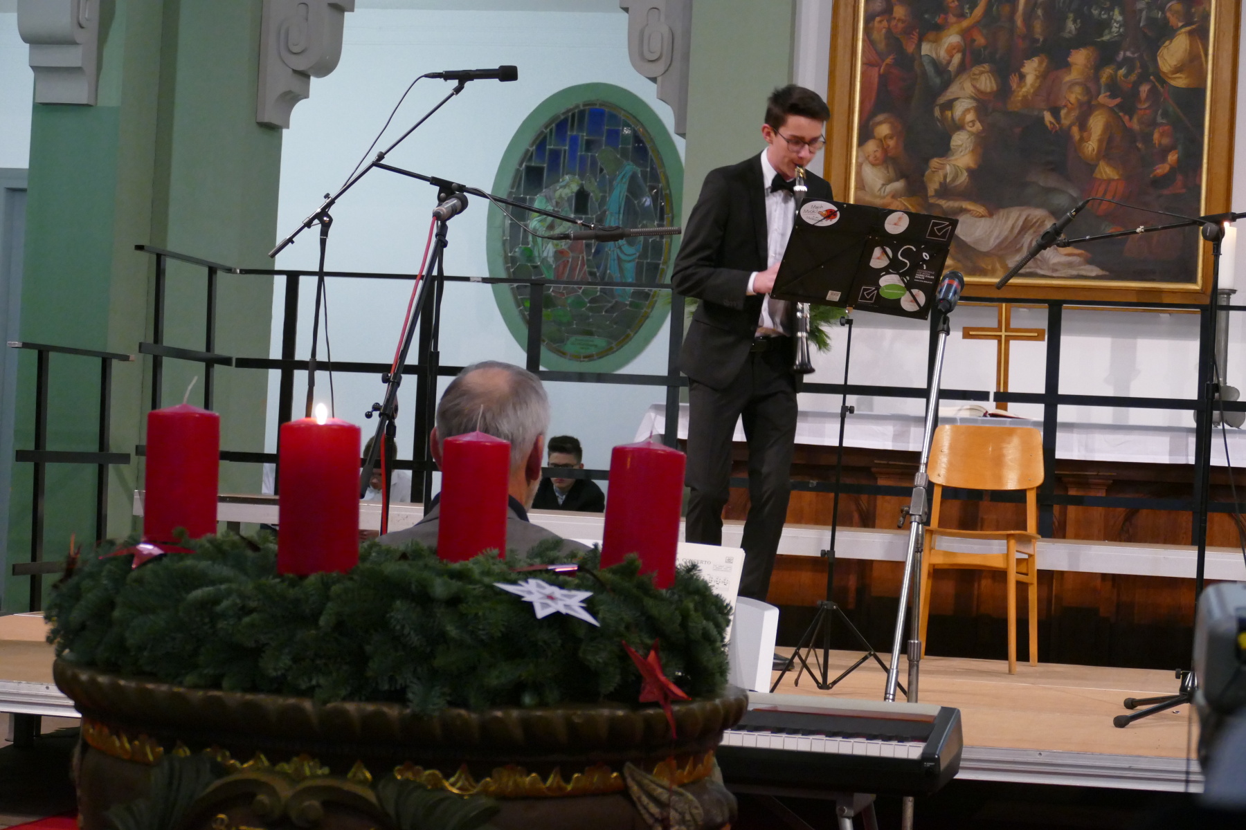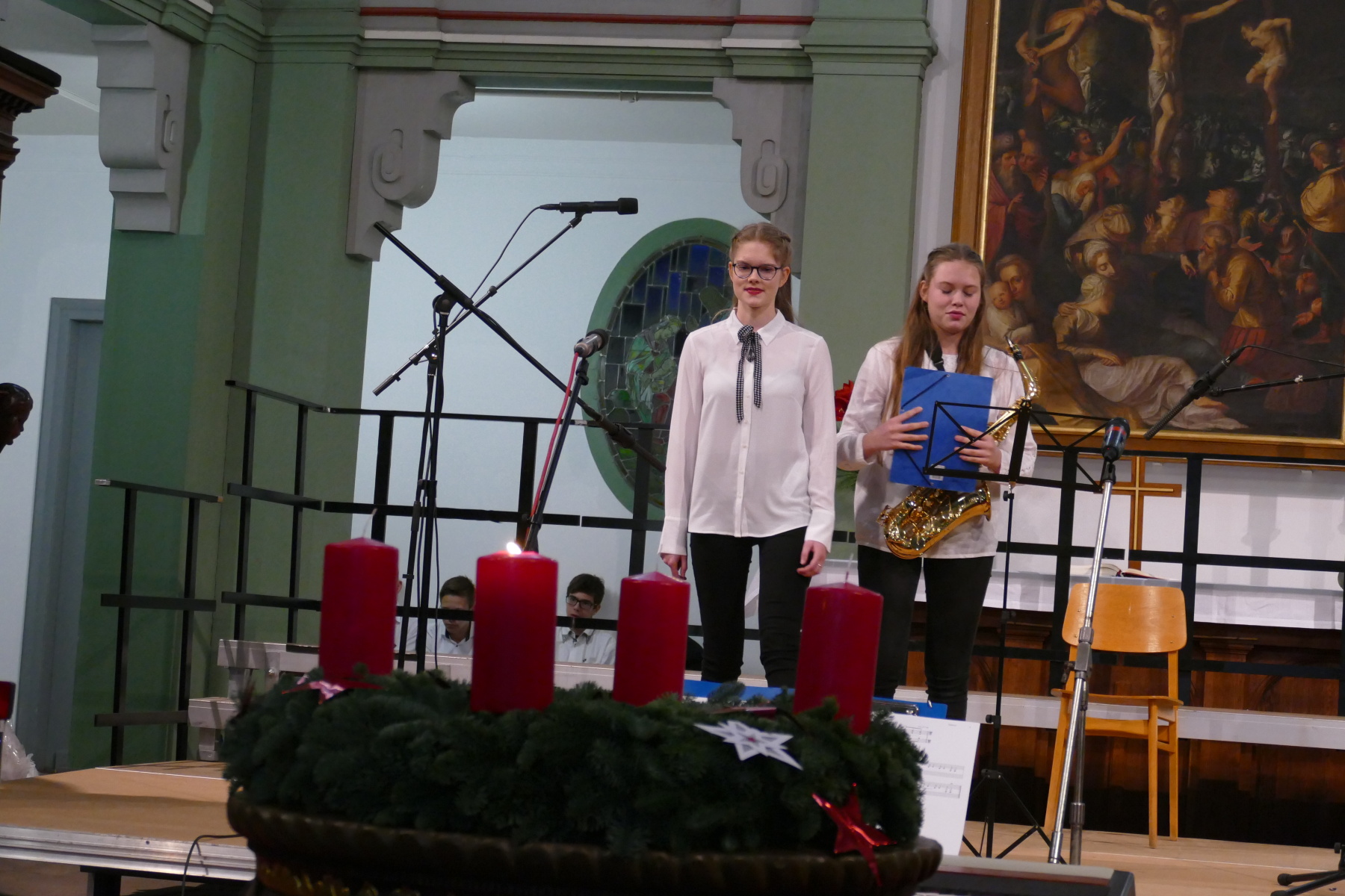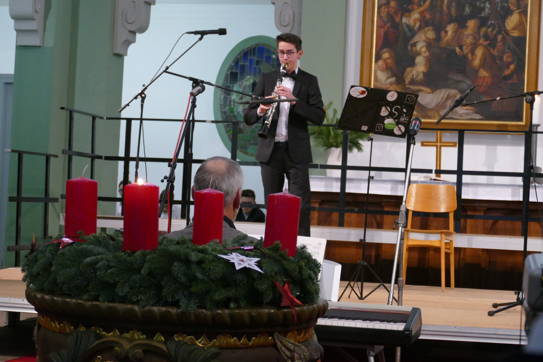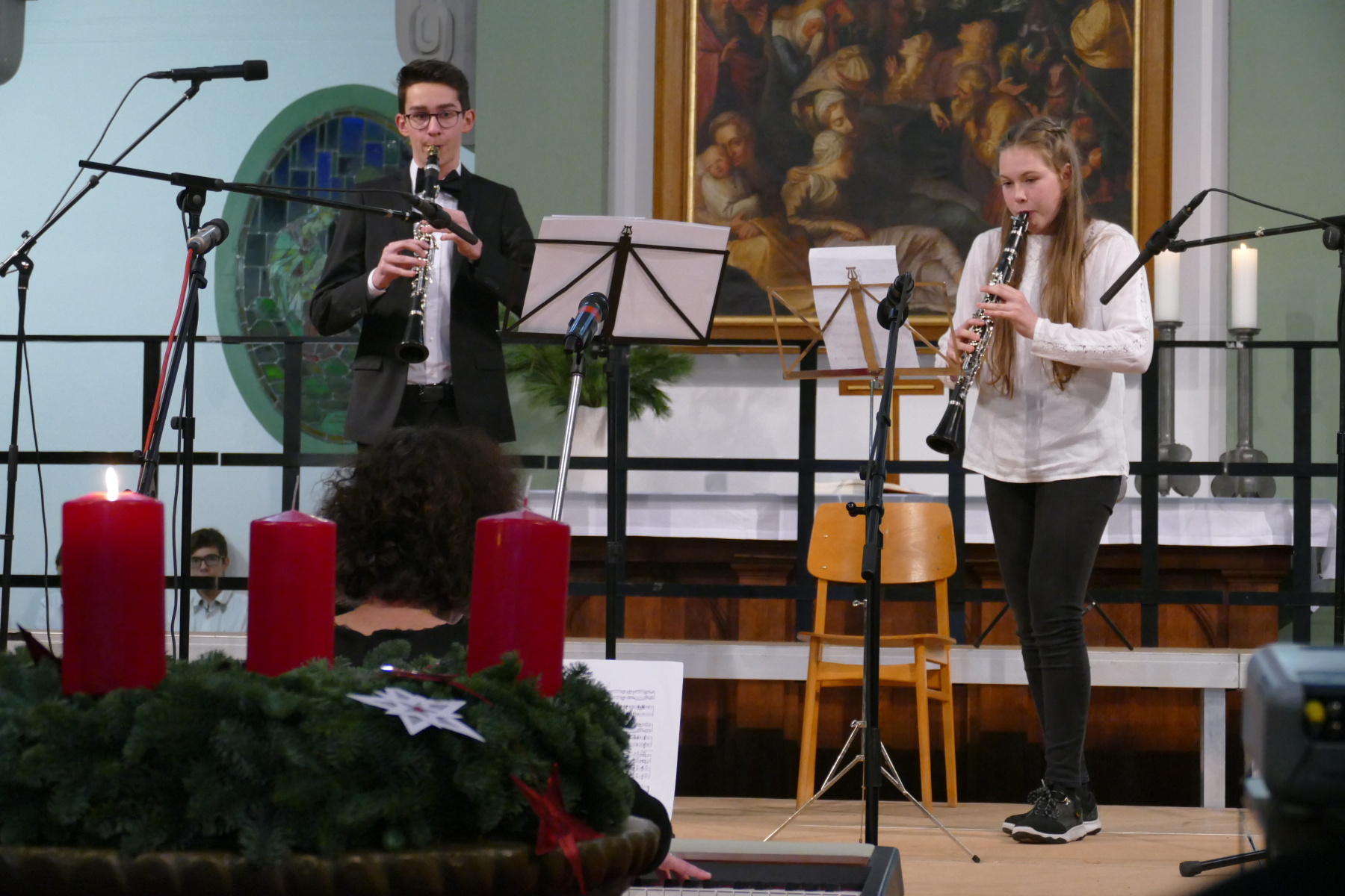 Nach den Grußworten der Pfarrerin Bomm (Impulse), setzten das Duo Klarinette/Klavier (Amelie und Fidelia Hesse) sowie Conrad Hähnlein an der Klarinette (begleitet von seinem Vater am Klavier) meisterhaft besondere Akzente des Konzertes. Dieser Teil wurde die Klassenchöre der 8 und 9 abgeschlossen.