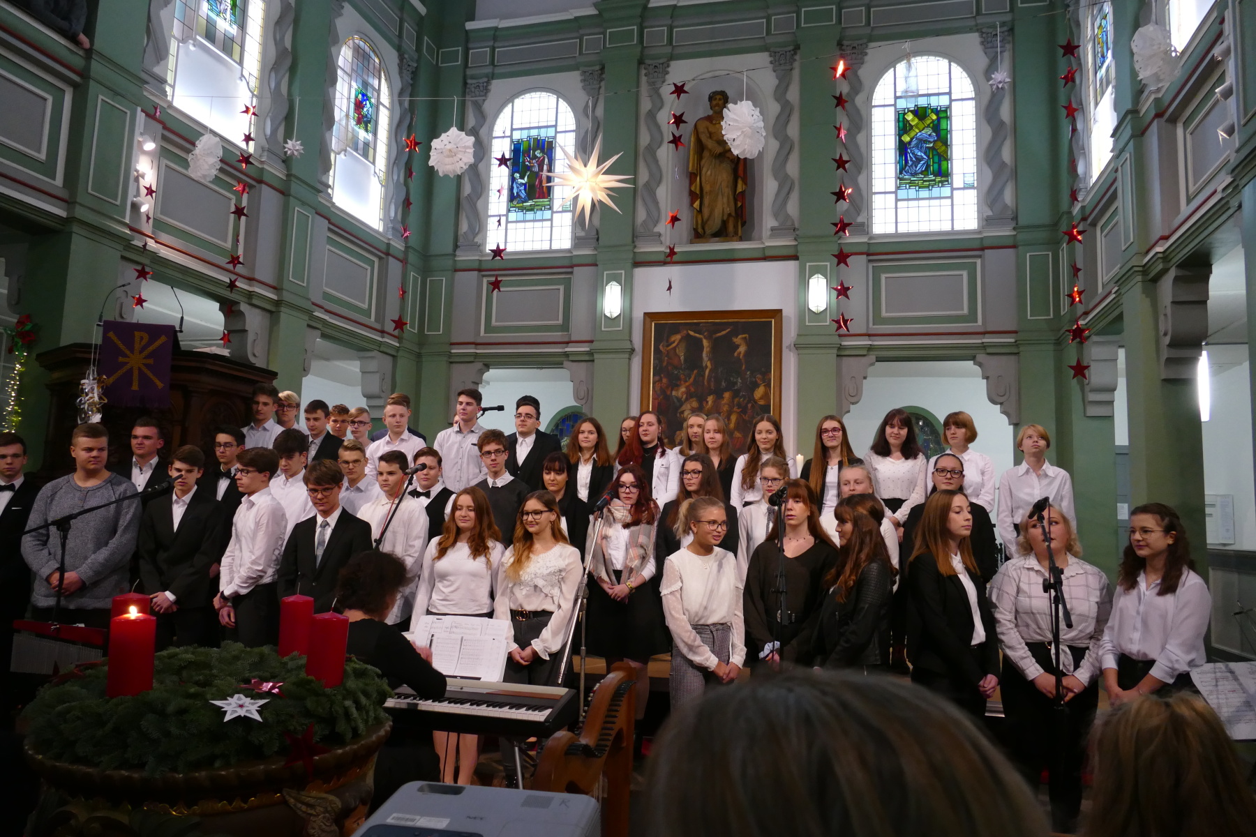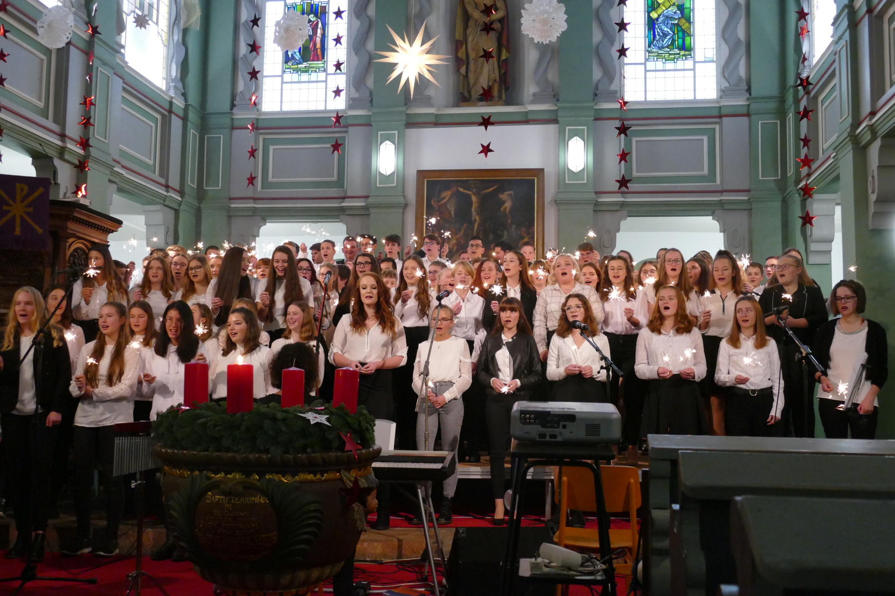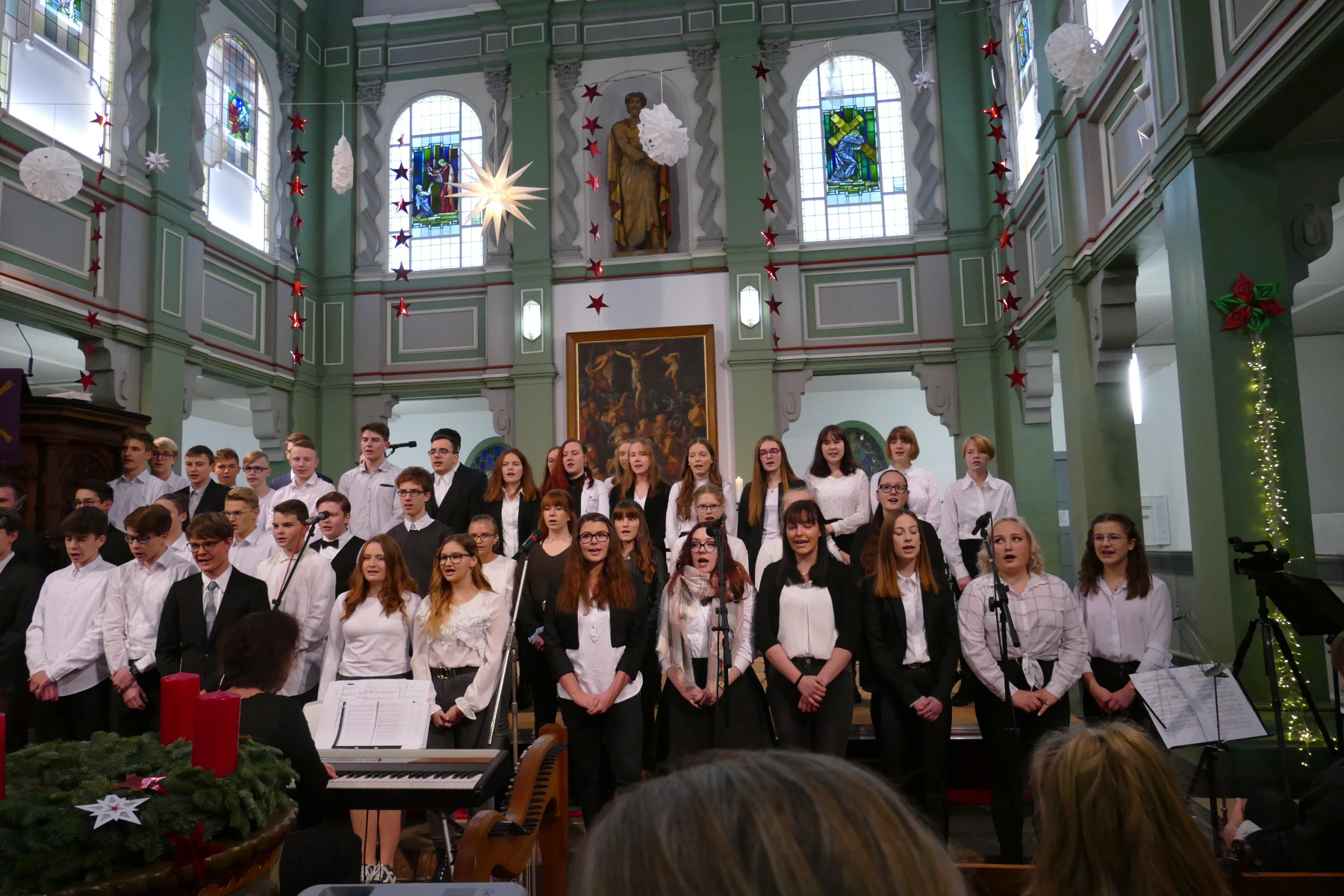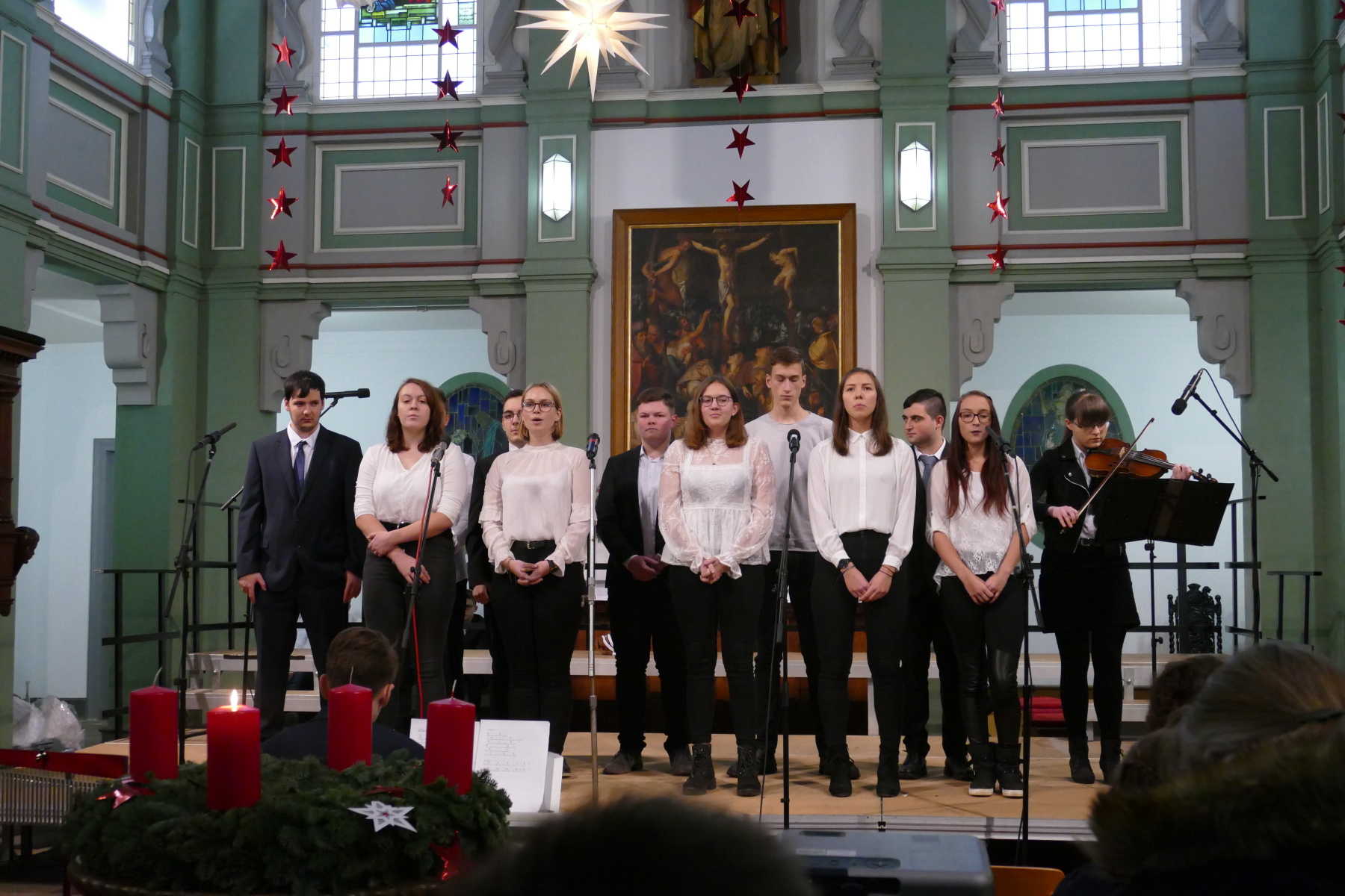 Den 3. Teil gestalteten die Klasse 12 (Halleluja), ein Duo Violine/Ukulele (Anna Patricia Bergk und Jonas Hölzl) sowie das Chorensemble der 10 (aus „Elias“ von Felix Mendelsohn Bartholdy; Gospellieder), bevor das Finale durch den gesamten Chor „Sind die Lichter angezündet“ und „Feliz navidad“ das Konzert abschloss.