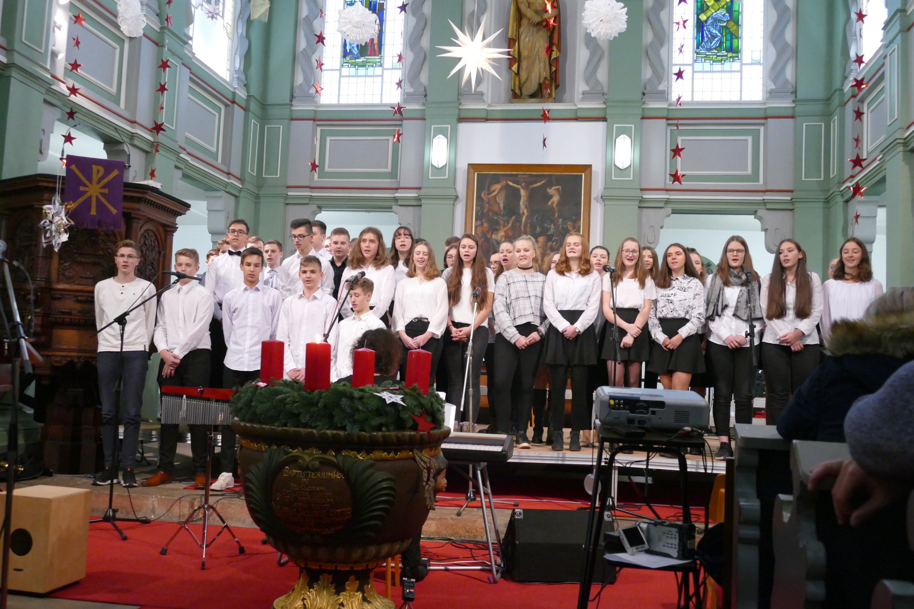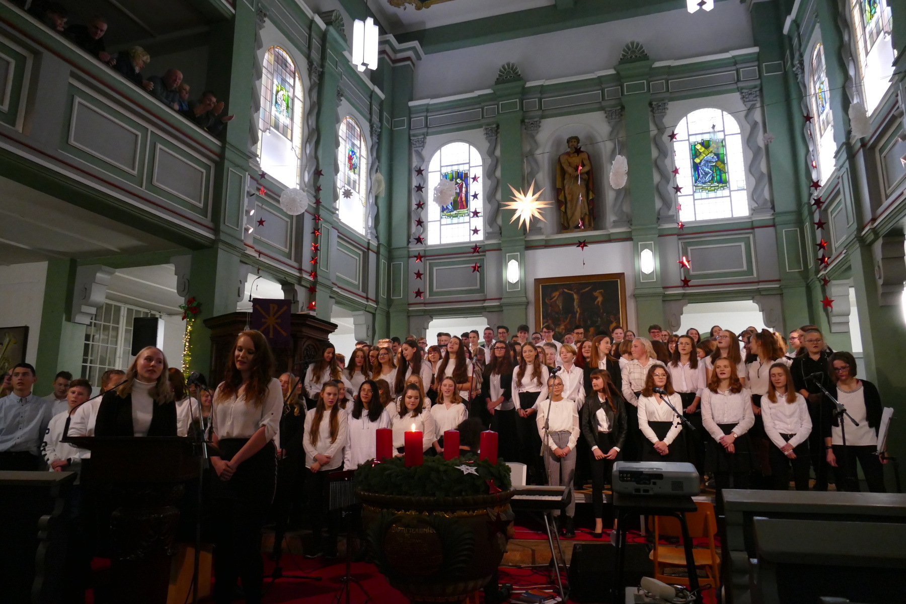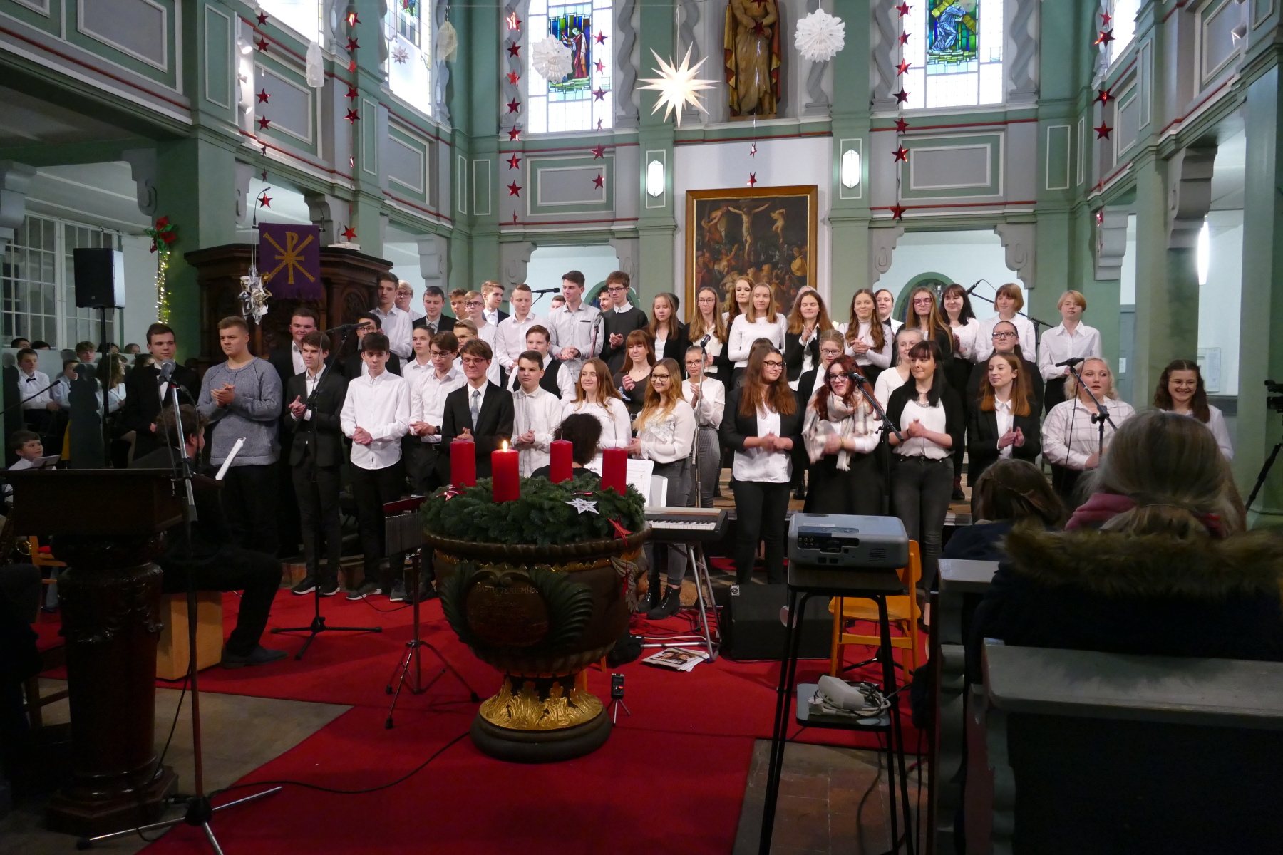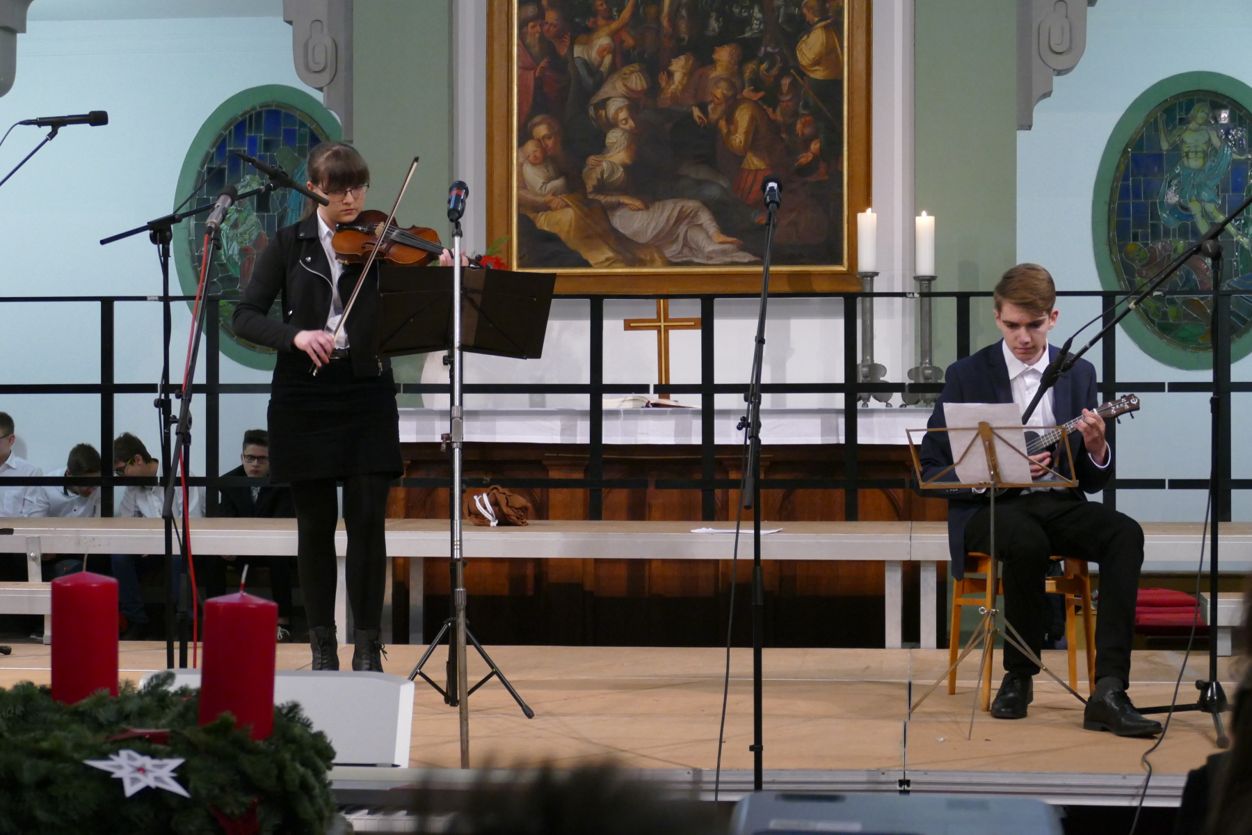 Den 3. Teil gestalteten die Klasse 12 (Halleluja), ein Duo Violine/Ukulele (Anna Patricia Bergk und Jonas Hölzl) sowie das Chorensemble der 10 (aus „Elias“ von Felix Mendelsohn Bartholdy; Gospellieder), bevor das Finale durch den gesamten Chor „Sind die Lichter angezündet“ und „Feliz navidad“ das Konzert abschloss.