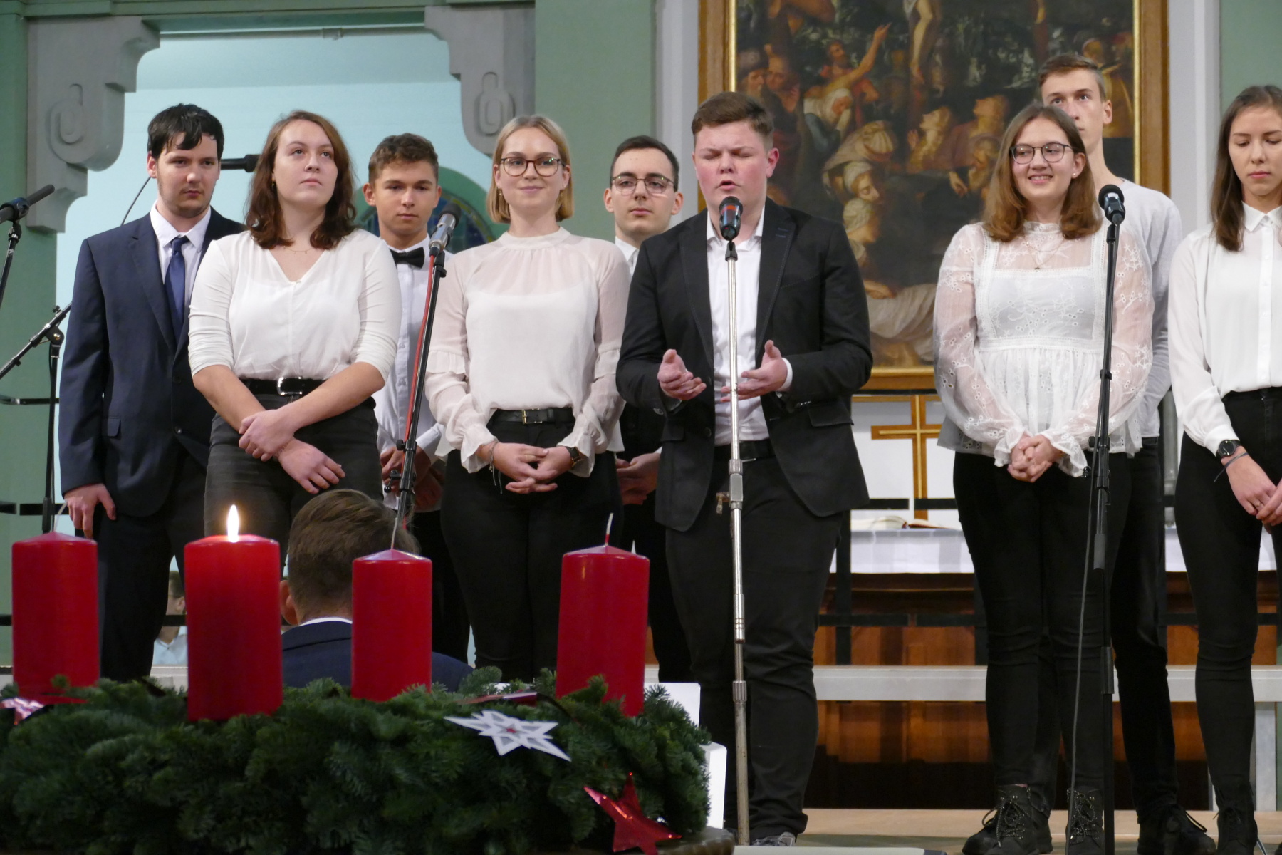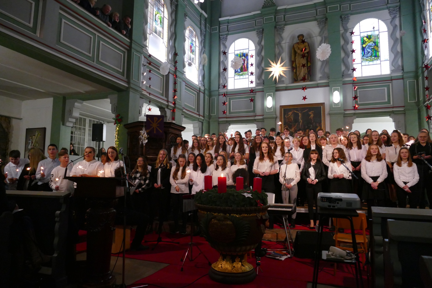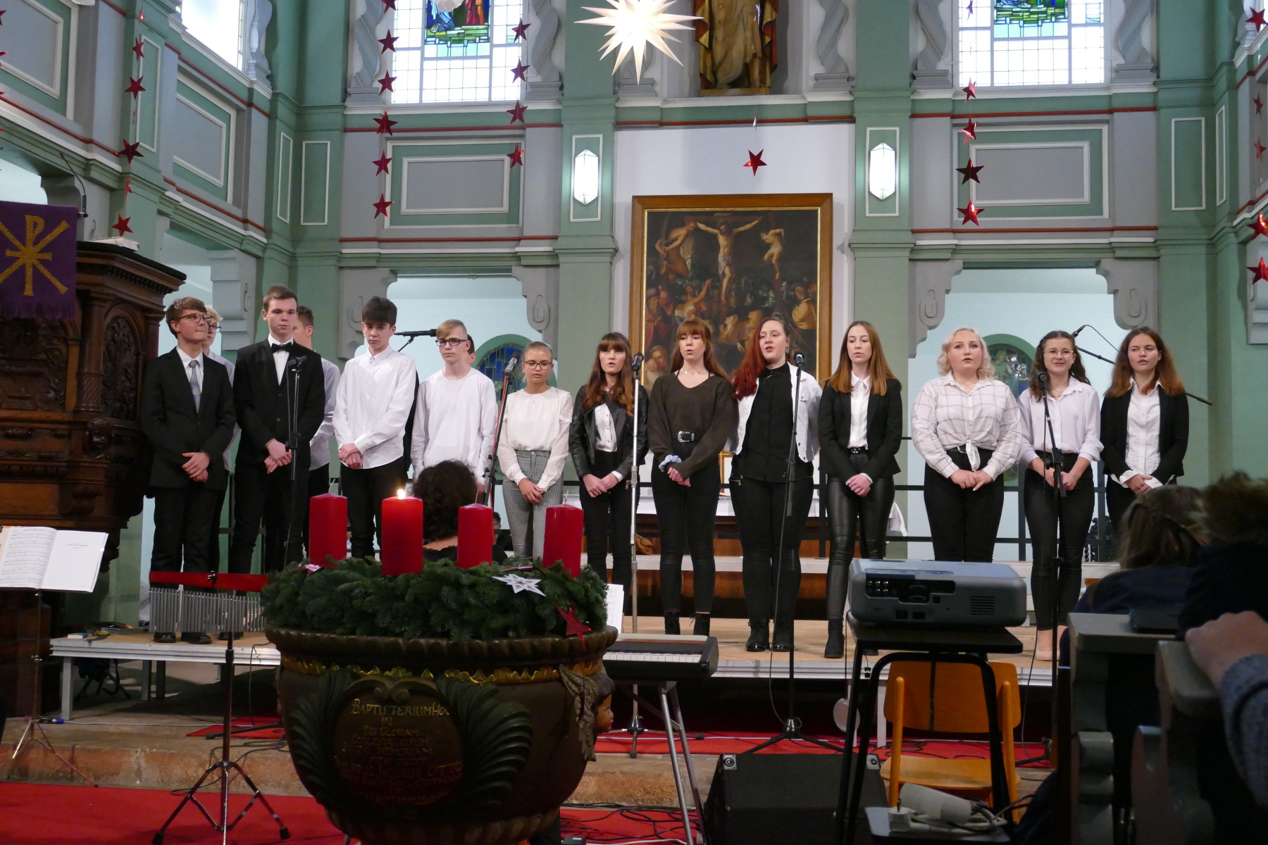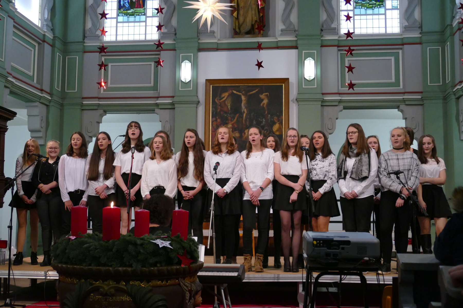 Den 3. Teil gestalteten die Klasse 12 (Halleluja), ein Duo Violine/Ukulele (Anna Patricia Bergk und Jonas Hölzl) sowie das Chorensemble der 10 (aus „Elias“ von Felix Mendelsohn Bartholdy; Gospellieder), bevor das Finale durch den gesamten Chor „Sind die Lichter angezündet“ und „Feliz navidad“ das Konzert abschloss.