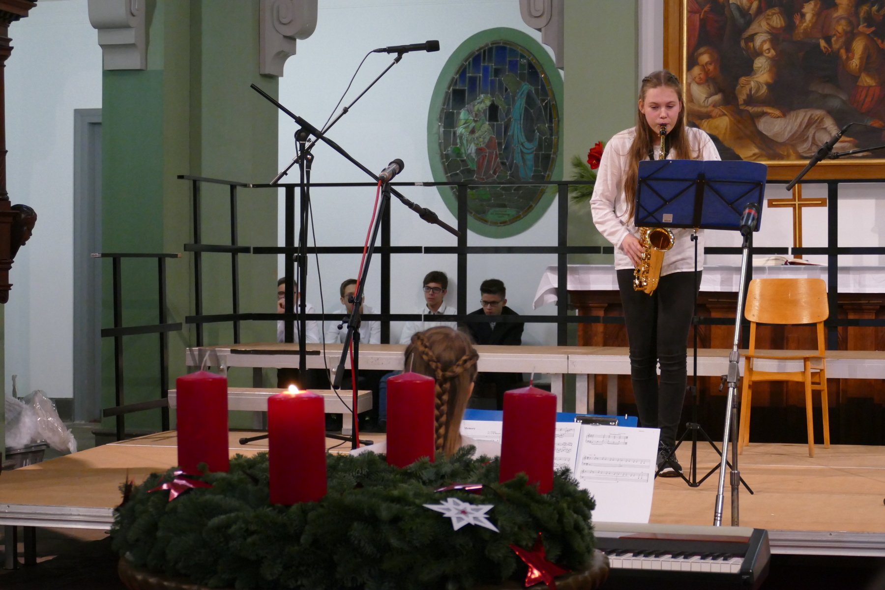 ein Klarinettenduo (Fidelia Hesse und Conrad Hähnlein), Chorlieder des Oberstufenchores, ein Sololied Melissa Stötzers sowie ein Duo Geige/Harfe (die bezaubernde Merle Erdenberger und Margarete Pohl) den Auftakt des 1. Teiles.