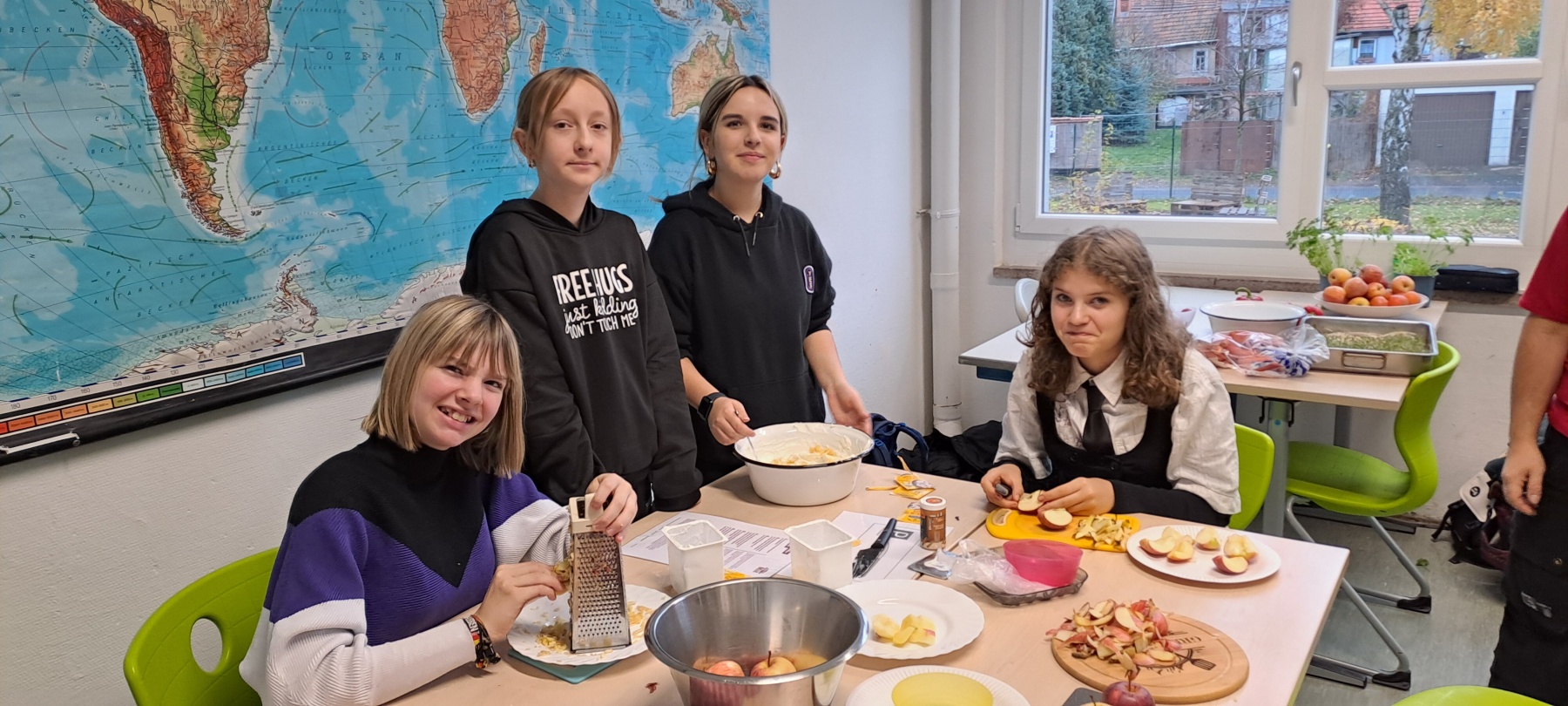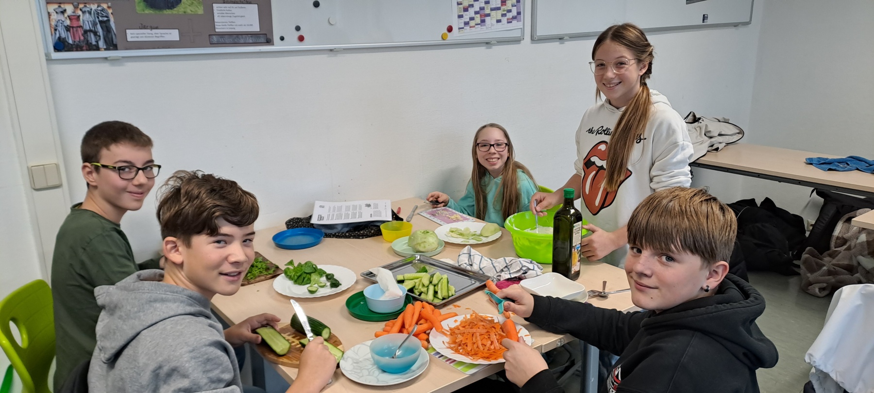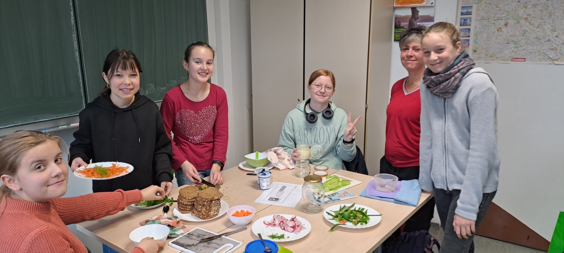 Am Freitag, den 15.11.2024, trafen sich die SchülerInnen der Klasse 7/3 gemeinsam mit ihrer Klassenleiterin Frau Wittek zu einem gesunden Frühstück unter der Leitung der Schulsozialarbeiterin Frau Bezold. Ziele dieser Aktion waren das selbständige Zubereiten eines gesunden Frühstücks, das Auspropieren und Besprechen verschiedener Rezepte mit gesunden Nahrungsmitteln, das Stärken des sozialen Miteinander, aber vor allem auch das Kennenlernen von Frau Bezold und ihrer beruflichen Tätigkeit als Schulsozialarbeiterin an unserer Schule.