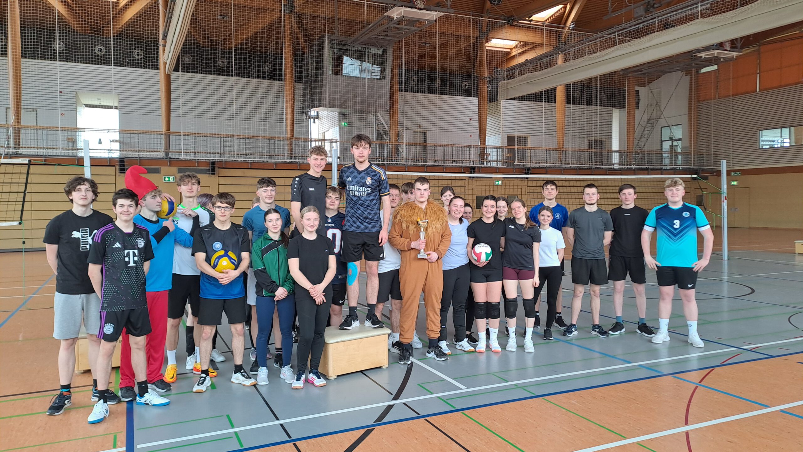 Trotz der überschaubaren Beteiligung entwickelte sich ein spannender Wettkampf mit großem Einsatz und fairer Atmosphäre, jeder Ball wurde hart umkämpft und bei Punktgewinn umjubelt. Besonders hervorzuheben ist das Siegerteam, das mit beeindruckender Leistung und klarer Dominanz alle Spiele für sich entschied. Im Team Blockbusters hatten sich Anton, Finn, Lena, Leni, Alina aus den Klassenstufen 10 und 11sowie Marius als Verstärkung von der Regelschule zusammengefunden. Am Ende stand für sie ein verdienter, überragender Turniersieg, der mit dem Wanderpokal belohnt wurde. Doch auch die anderen Teams hatten alle Spaß am Spielen, so dass das Turnier ein gelungenes sportliches Ereignis wurde, im nächsten Jahr dann hoffentlich wieder mit größerer Beteiligung und dem Lehrer-Schüler-Spiel als Herausforderung.