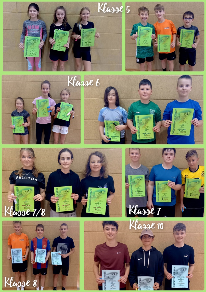 Am Mittwoch, dem 08.11.2023, fand das alljährliche Badminton-Turnier unserer Schule in der Goldberghalle Ohrdruf statt. Weit über 80 Sportfreundinnen und Sportfreunde aus den Klassen 5-10 hatten sich hierfür im Vorfeld bereits angemeldet. Nachdem sich gegen 12.30 Uhr alle diese Schülerinnen und Schüler in die Spielerlisten eingeschrieben hatten, ging es hochmotiviert an das Einspielen. Wettkämpfe im Einzel und Doppel sollten dafür sorgen, die besten Badmintonspieler und -spielerinnen der jeweiligen Klassenstufe herauszufinden. Aufgrund der zahlreichen Anmeldungen musste oft in mehreren Gruppen gespielt werden. Viele Elftklässler und weitere freiwillige Helfer unterstützten tatkräftig die Wettkämpfe mit ihrer Schiedsrichtertätigkeit, dem Protokolle und Urkunden schreiben bzw. organisatorischen Dingen. Nach einer beeindruckenden Wettkampfphase voller Spannung, Spaß, Disziplin, Motivation und Fairness ertönte gegen 14.40 Uhr der Schlusspfiff. Es folgte ein weiterer sehr aufregender Teil der Sportveranstaltung: die Siegerehrung! Oft waren es die kleinen Punkte, die am Ende entschieden. Wer hatte am besten gespielt? Wer konnte den Sieg mit nach Hause nehmen? Die jeweils 3 besten Spielerinnen und 3 besten Spieler einer jeder Klassenstufe wurden mit der begehrten Urkunde, Süßigkeiten, einem kleinen Preis und lautem Applaus geehrt. Somit war unser diesjähriges Badminton-Turnier wieder eine sehr gelungene und erfolgreiche Veranstaltung in unserem Schulleben. Ein herzlicher Dank geht an die Fachschaft Sport!