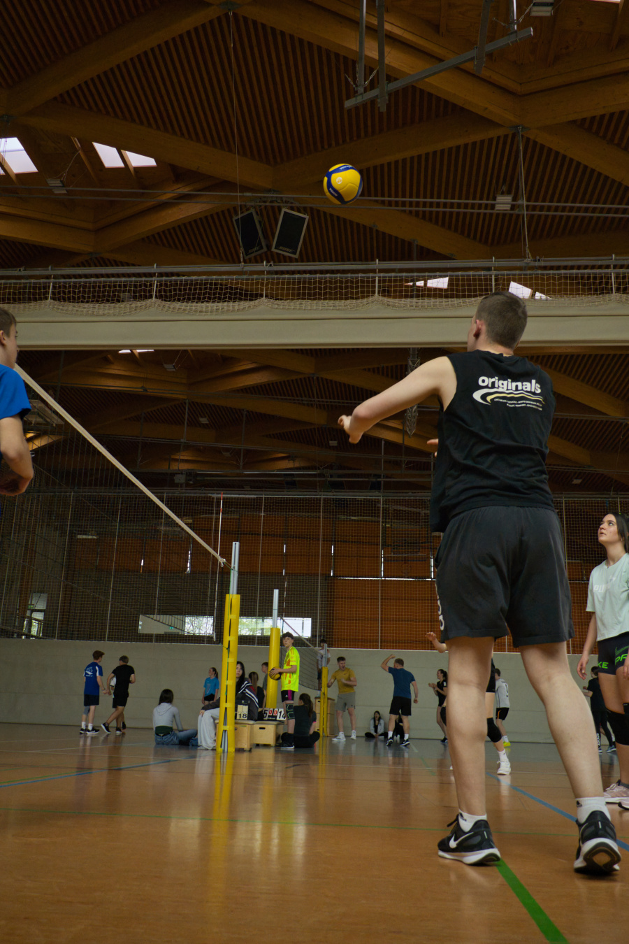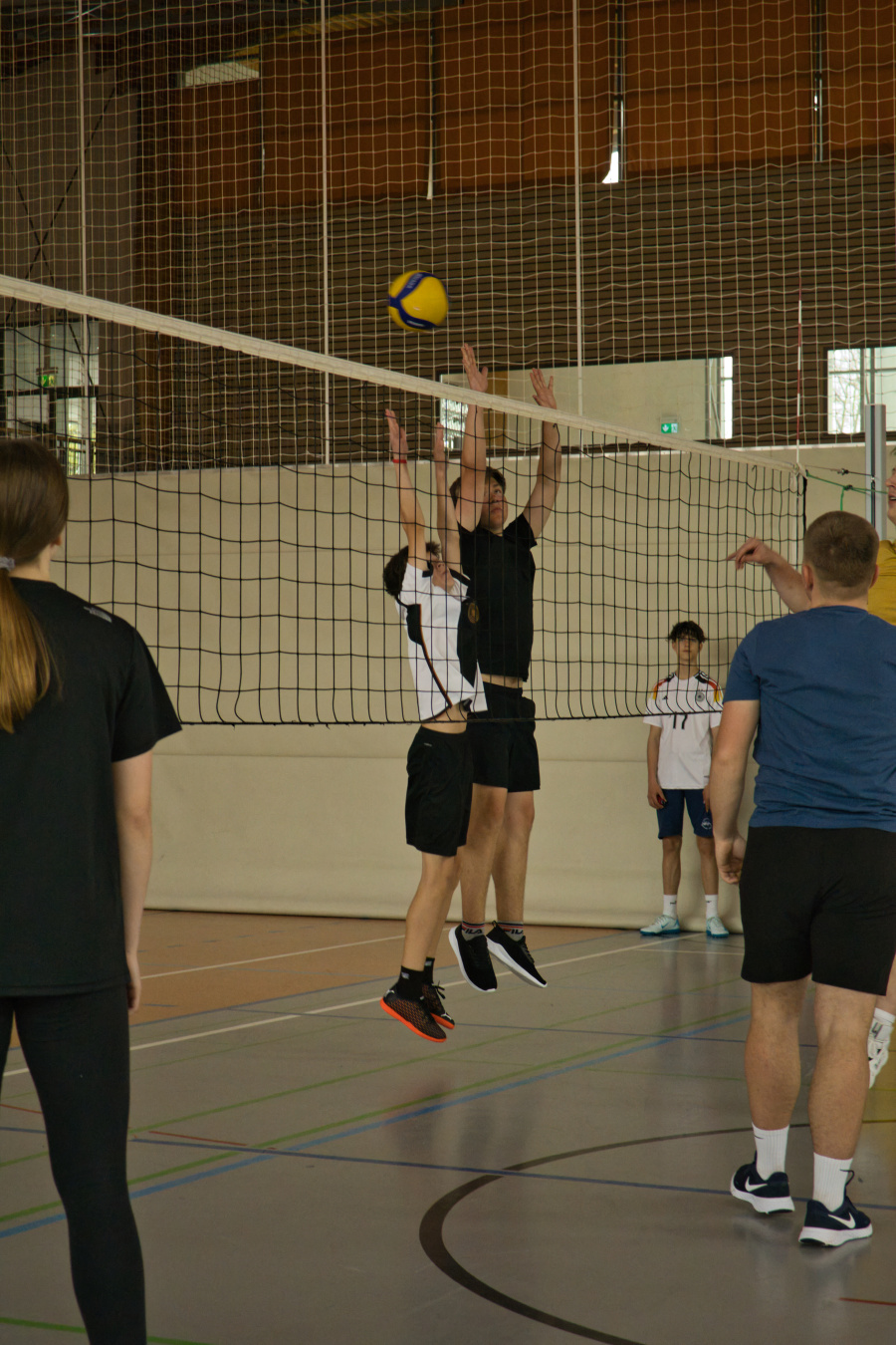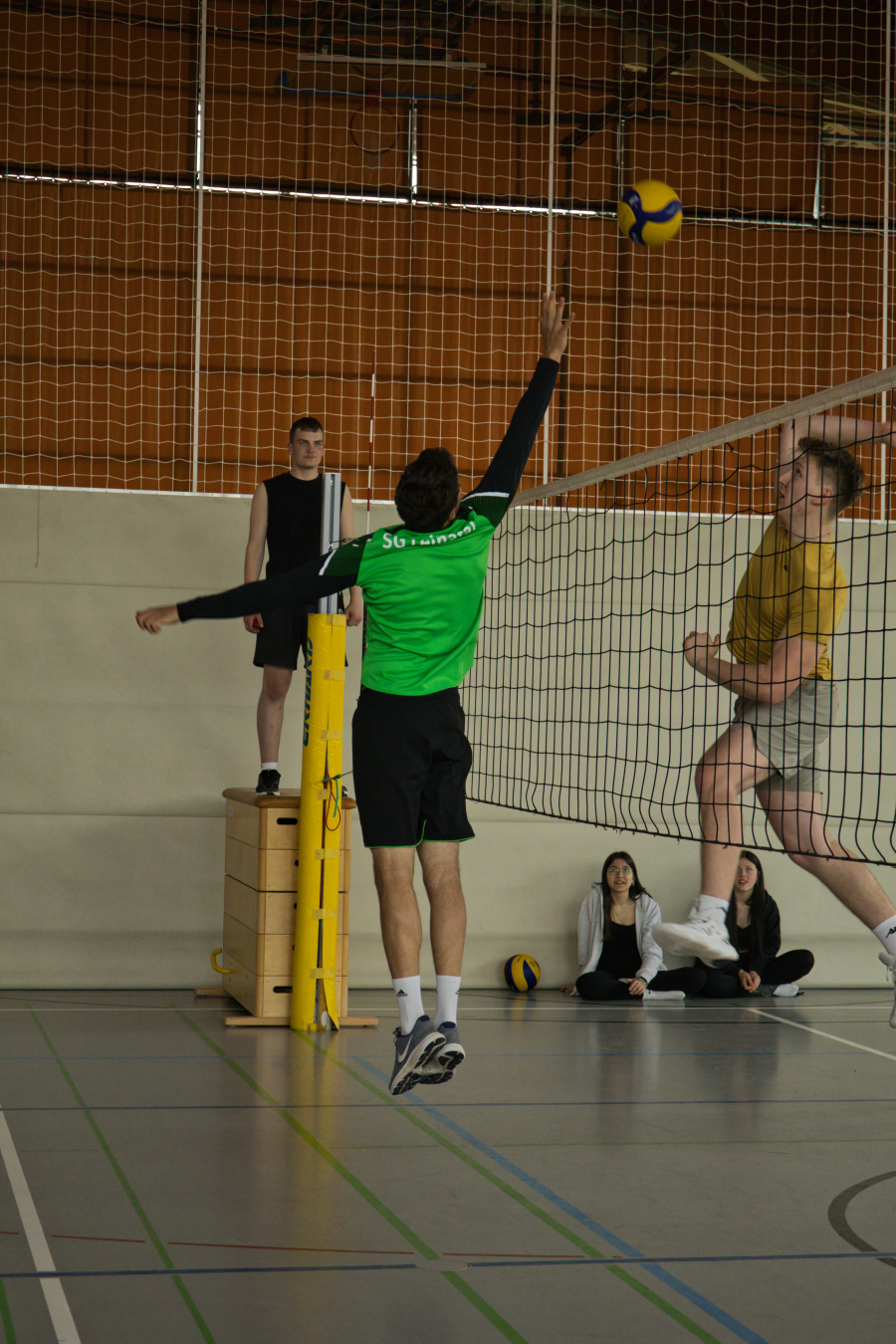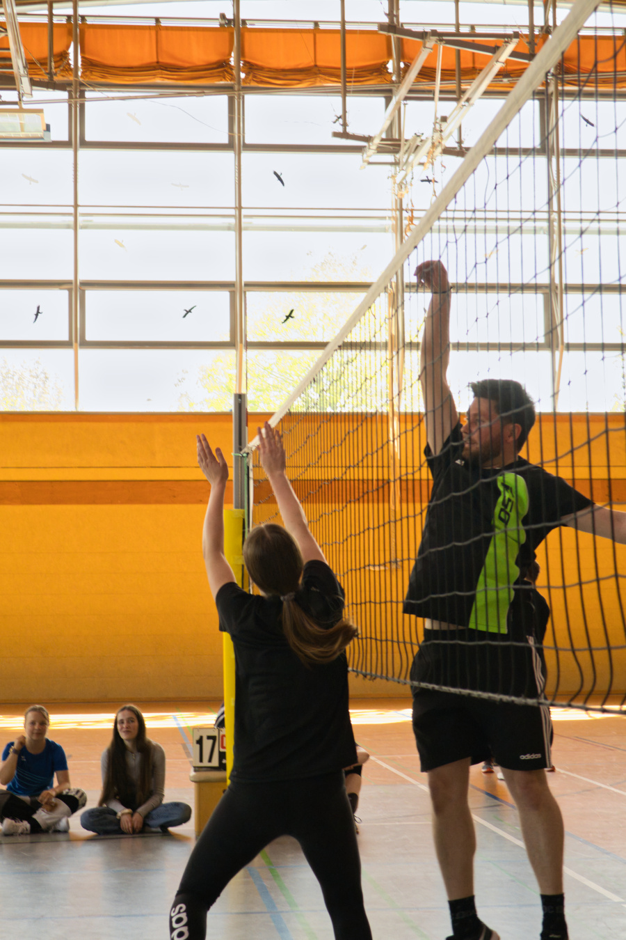 Die Ostereier sind zwar schon gefunden, alle Schokohasen vernascht und auch der Schmuck von den Zweigen abgehangen, das alljährige Osterturnier im Volleyball sollte aber dennoch stattfinden. Zwar stotterte die Anmeldung der verschiedenen Teams des Gymnasiums, weil vielleicht die Ferien die Sicht auf den Termin etwas verdeckten, doch pünktlich zum Anpfiff fanden sich gut 60 Spieler*Innen in der Goldberghalle ein und pritschen was das Zeug hielt.