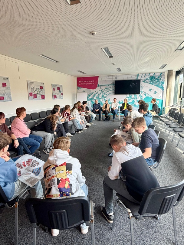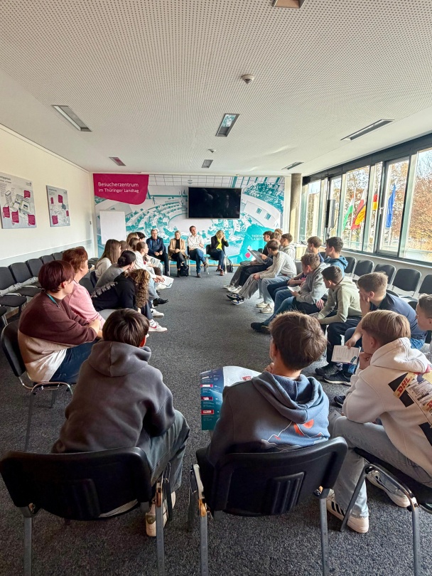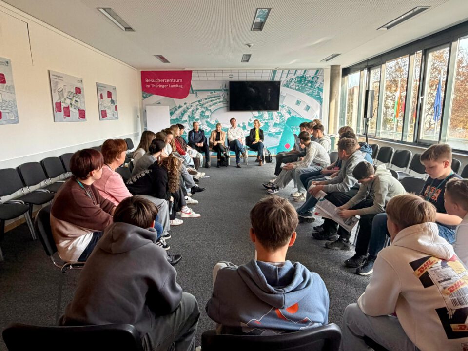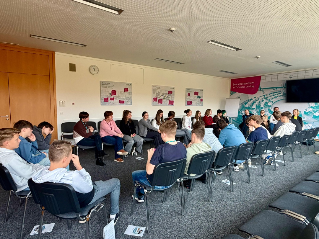 Nach einer 45 minütigen Fahrt wurden wir auch schon von unserem Begleiter an diesem Tag, Louis Michel begrüßt. Nachdem wir unsere Besucherausweise bekamen, führte uns Louis mit einer spannenden Tour durch die Landtagsgebäude. Am Anfang erzählte er uns von dem allgemeinen Alltag der Abgeordneten und gab uns auch einen Flyer mit einer Übersicht über alle Abgeordneten im Erfurter Landtag. Zunächst zeigte er uns einen Miniaturnachbau des Landtages, zu welchem er auch ein paar interessante Fakten auf Lager hatte. Weiter ging es für uns in den Keller zur einem damaligen Gefängnis, in dem Gefangene in völliger Dunkelheit festgehalten wurden. Dort hörten wir über einen Lautsprecher die Stimme eines ehemaligen Insassen, welcher über die schrecklichen Zeiten berichtete. Als vorletzten Anhaltepunkt unserer Tour führte uns Louis zum Raum der Stille, in welchem sich die Angestellten zur Ruhe setzten können, z.B. um zu beten. Unsere Tour endete im Plenarsaal des Landtaggebäudes in welchem wir etwas über die Aufteilung der Abgeordneten erfuhren und ein paar Gruppenbilder machten. Nach einer kurzen Pause war es auch schon Zeit für uns die Abgeordneten zu treffen, diese waren in unserem Fall Katja Wolf (BSW), Sascha Bilay (Linke), Marion Rosin (CDU) und Matthias Hey (SPD). Die nächsten 60 Minuten haben wir uns mit ihnen über ihren Berufsalltag, ihre Pflichten und auch über ihre Probleme und Anforderungen unterhalten.