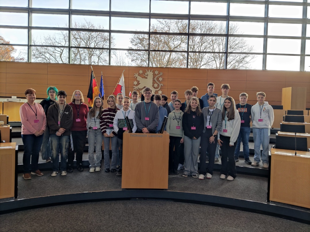 Am Donnerstag den 13. November ging es für uns frühs 7:30 Uhr mit dem Bus auf nach Erfurt in den Landtag. Gemeinsam mit der gesamten Klassenstufe neun, sowie auch mit Frau Tauscher und Frau Götzel durften wir ein Einblick in den Alltag der Abgeordneten bekommen.