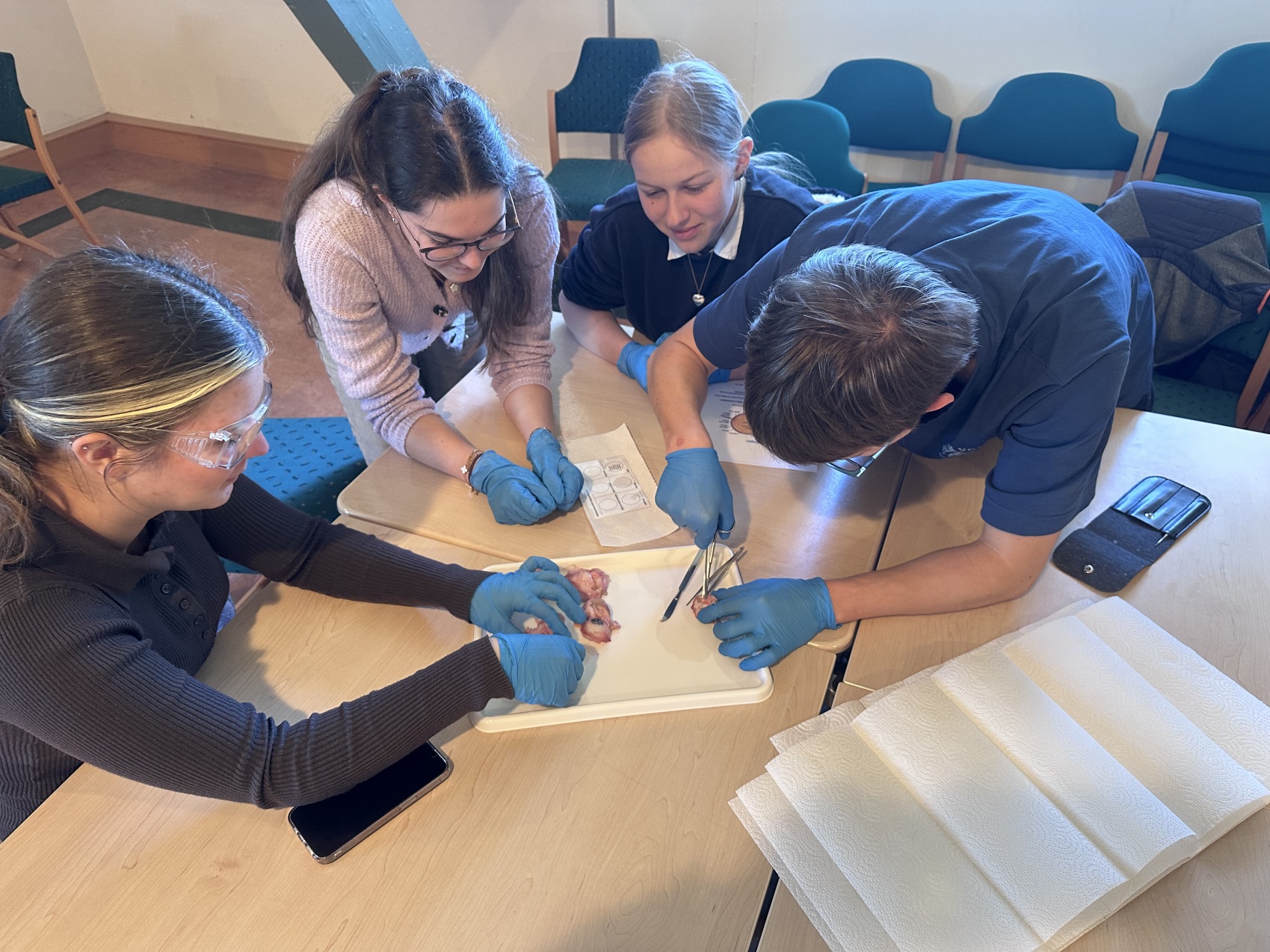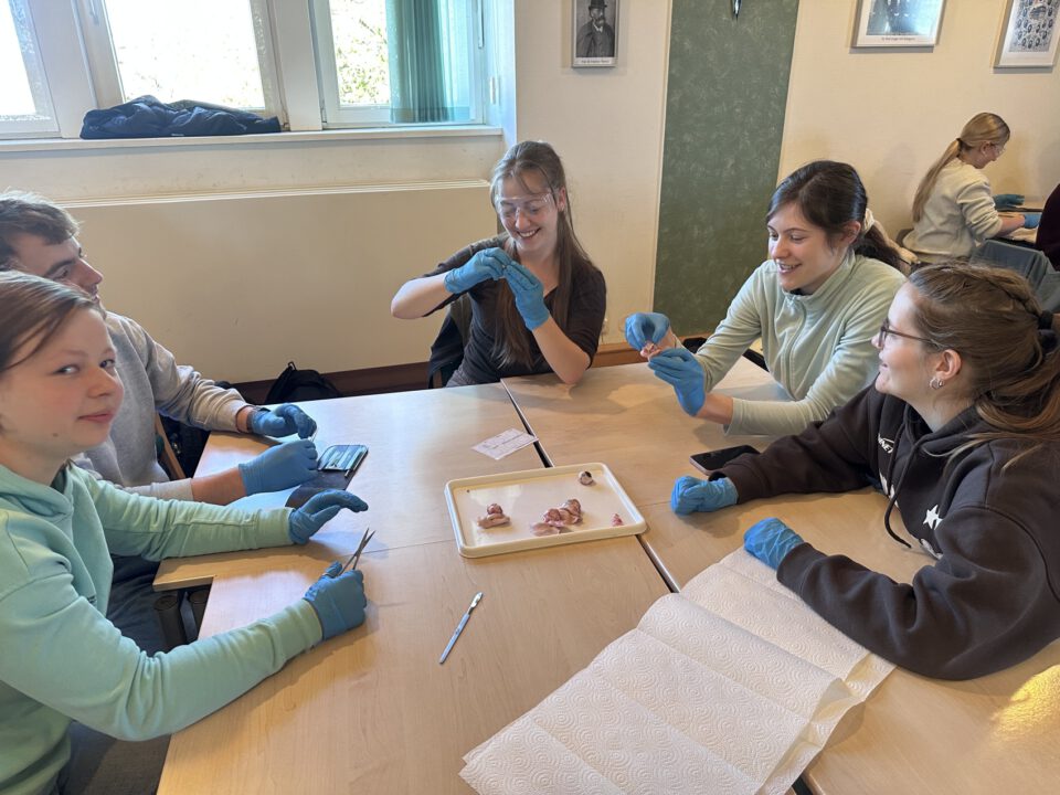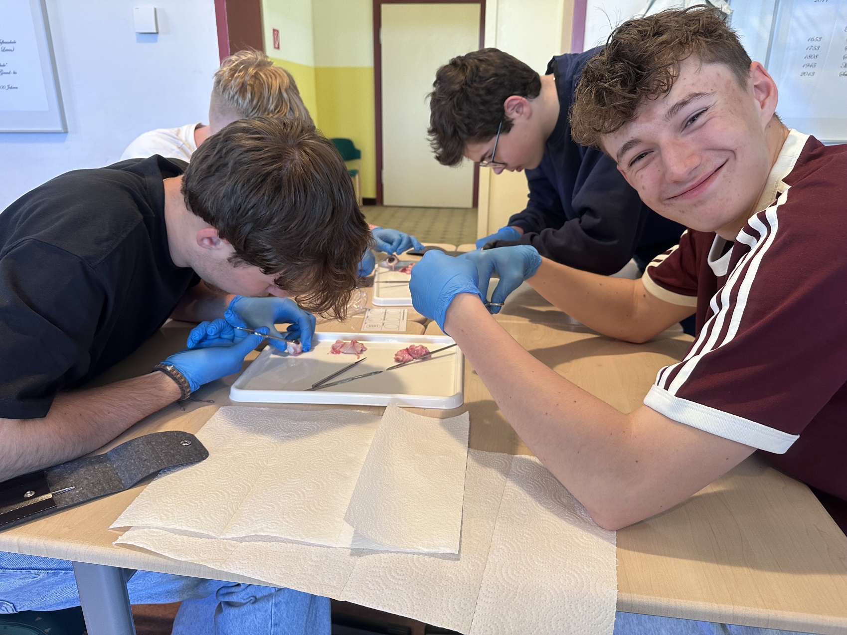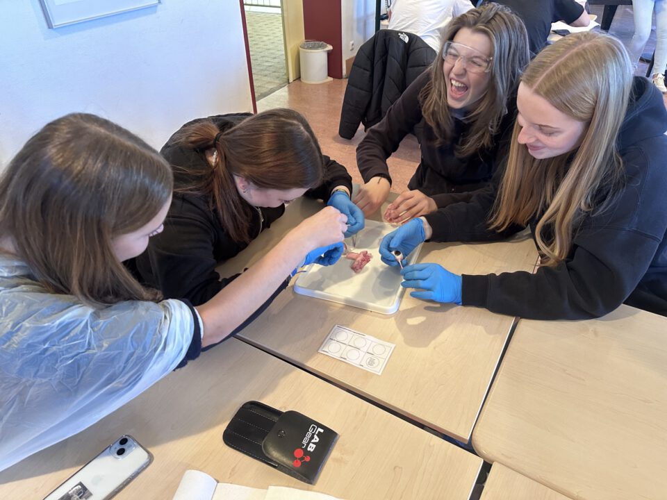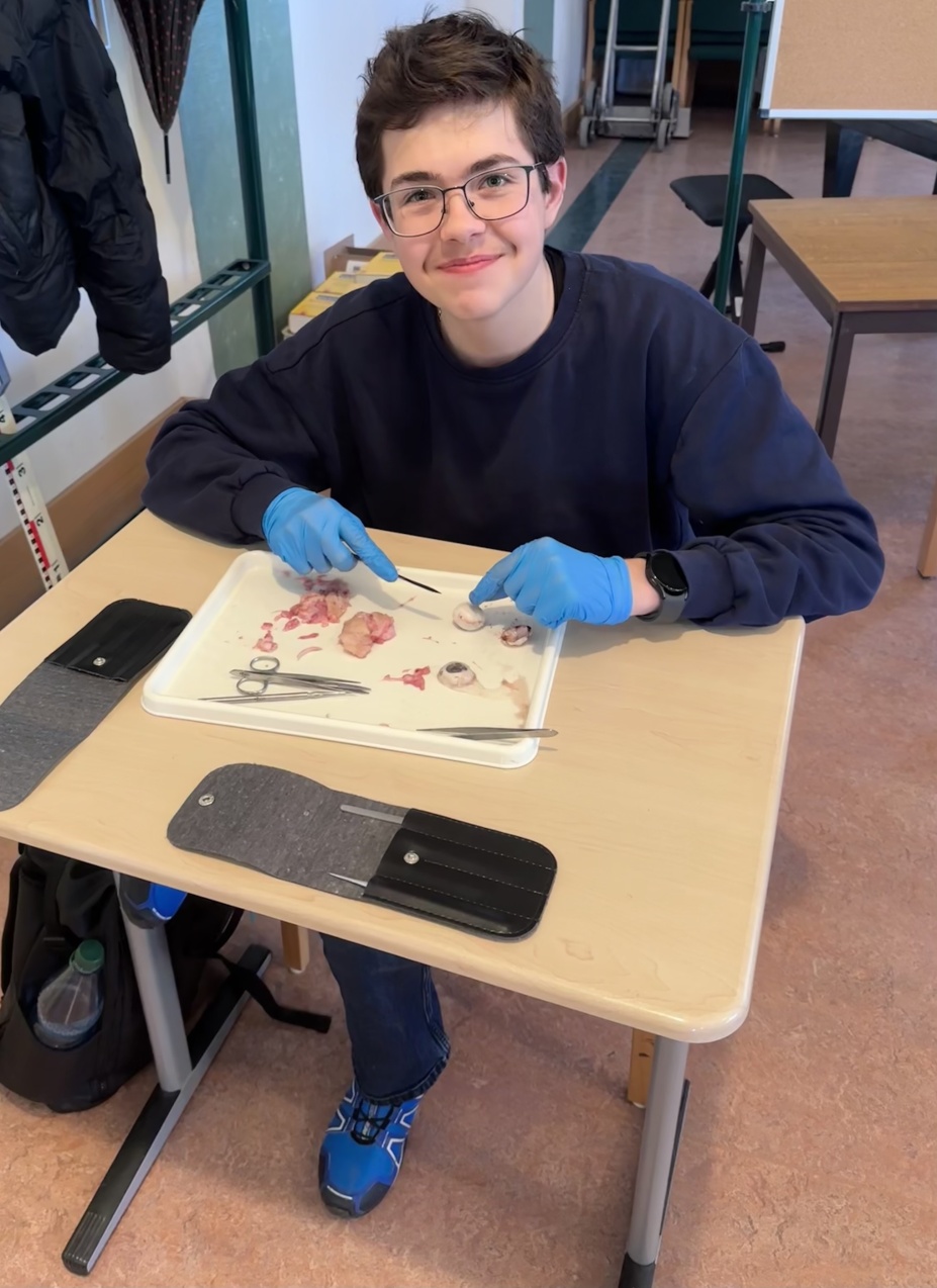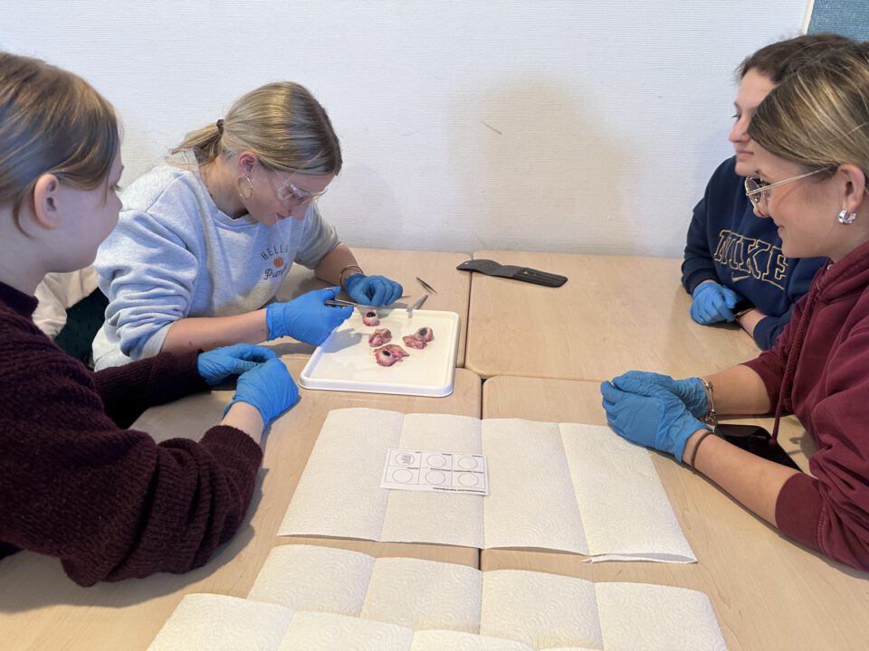 Am 23.04.2026 hatten wir, der Biologie-Leistungskurs der 11. Klasse, die Gelegenheit, in der Aula eine Schweineaugen-Präparation durchzuführen. Diese setzten wir mit unserem Biologielehrer Herrn Scheidemann und unserer Biologielehrerin Frau Ender, die die Schweineaugen zur Verfügung stellte, praktisch um. Nach einer kurzen Belehrung zu Sicherheitsregeln und wichtigen Hinweisen, die unter anderem das Tragen einer Schutzbrille oder den Umgang mit Präparations-Werkzeugen beinhalteten, wurden uns die Augen ausgeteilt. In Gruppen von vier Personen arbeiteten wir zusammen und jeder hatte die Möglichkeit, ein Schweineauge zu untersuchen.