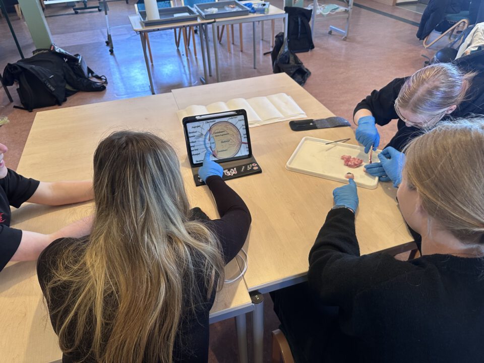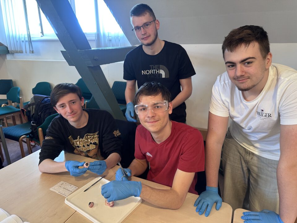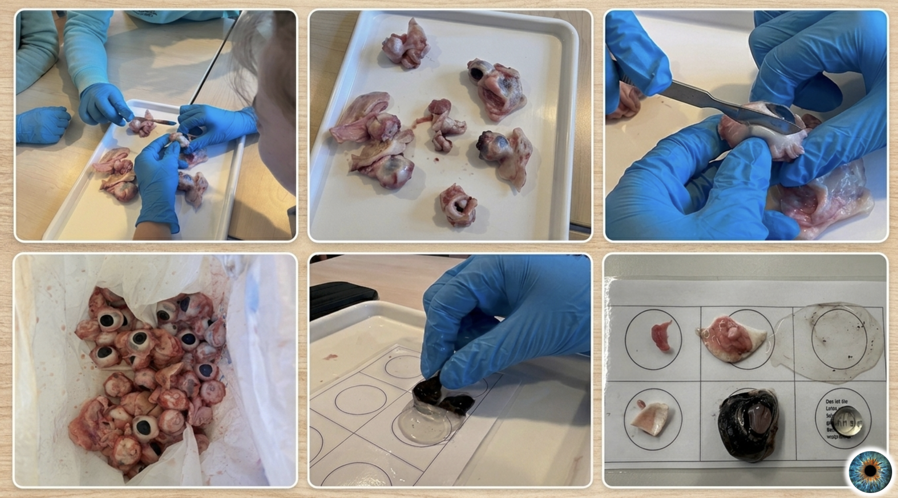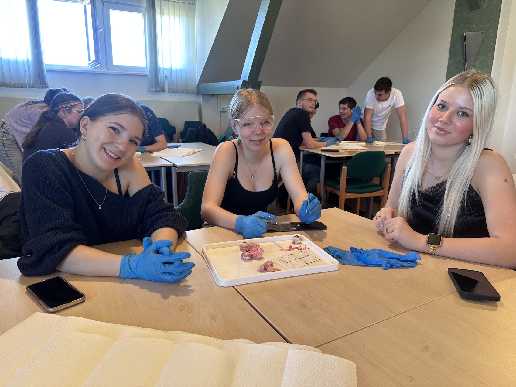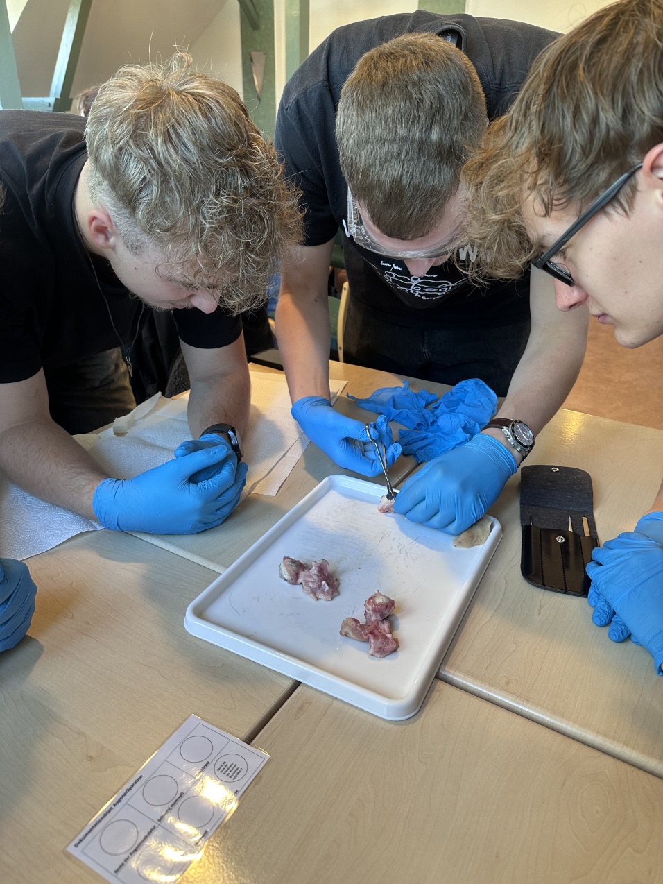 Am 23.04.2026 hatten wir, der Biologie-Leistungskurs der 11. Klasse, die Gelegenheit, in der Aula eine Schweineaugen-Präparation durchzuführen. Diese setzten wir mit unserem Biologielehrer Herrn Scheidemann und unserer Biologielehrerin Frau Ender, die die Schweineaugen zur Verfügung stellte, praktisch um. Nach einer kurzen Belehrung zu Sicherheitsregeln und wichtigen Hinweisen, die unter anderem das Tragen einer Schutzbrille oder den Umgang mit Präparations-Werkzeugen beinhalteten, wurden uns die Augen ausgeteilt. In Gruppen von vier Personen arbeiteten wir zusammen und jeder hatte die Möglichkeit, ein Schweineauge zu untersuchen.
