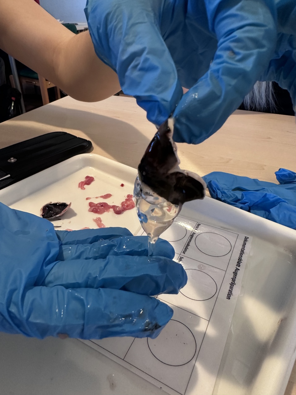 Ausgestattet mit Skalpell, spitzer Schere und Pinzette begannen wir, sehr vorsichtig und präzise zu arbeiten, da das Auge ein sehr detailreiches Sinnesorgan ist. Zunächst entfernten wir überschüssiges Gewebe sowie die äußeren Augenmuskeln, um den reinen Augapfel freizulegen. Dabei entdeckten wir auch den Sehnerv an der Rückseite des Schweineauges, welchen wir ebenfalls entfernten. Anschließend schnitten wir den Augapfel behutsam auf und konnten so einen Blick in das Innere des Auges werfen. Dabei wurde der Glaskörper sichtbar, eine gelartige Masse, die das Auge ausfüllt. Mit ihm verbunden war die Linse, die wir vorsichtig abtrennten.