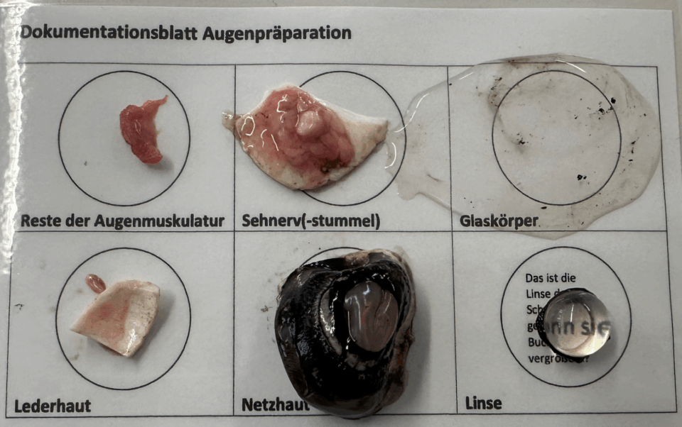 Alle herauspräparierten Bestandteile legten wir übersichtlich auf einer Präparationskarte ab. Dazu gehörten unter anderem die Linse, die Netzhaut (Retina) und die Lederhaut (Sklera). So konnten wir die einzelnen Strukturen des Auges gut erkennen und ihre Funktionen wurde klar ersichtlich.