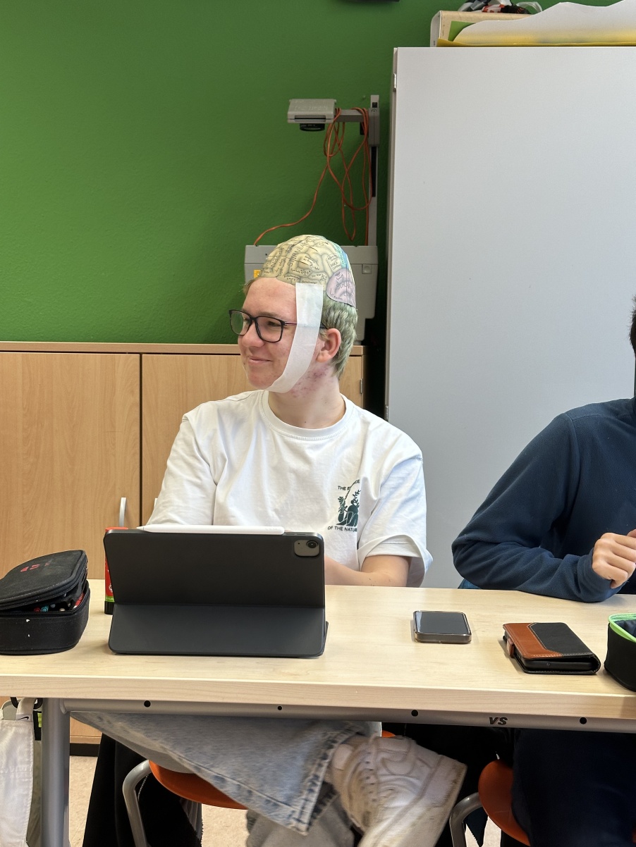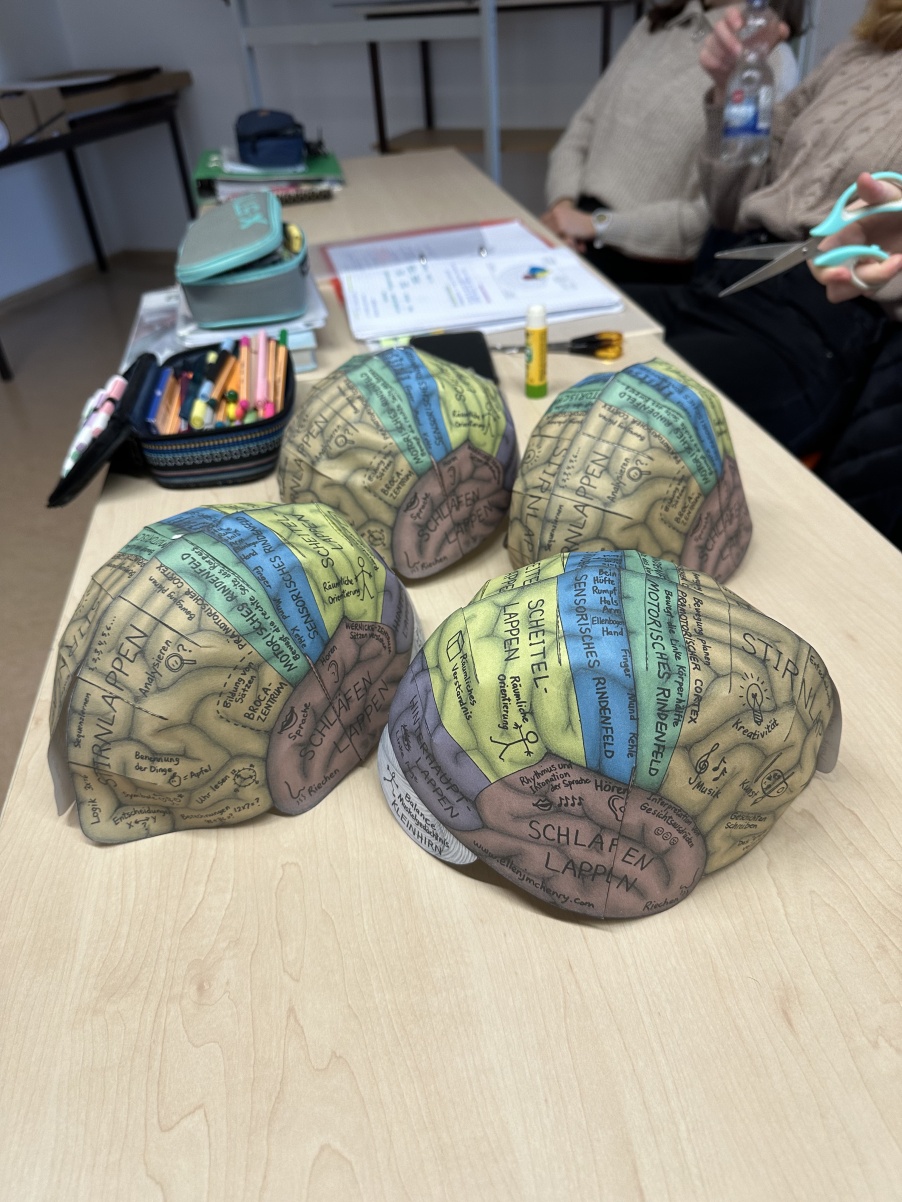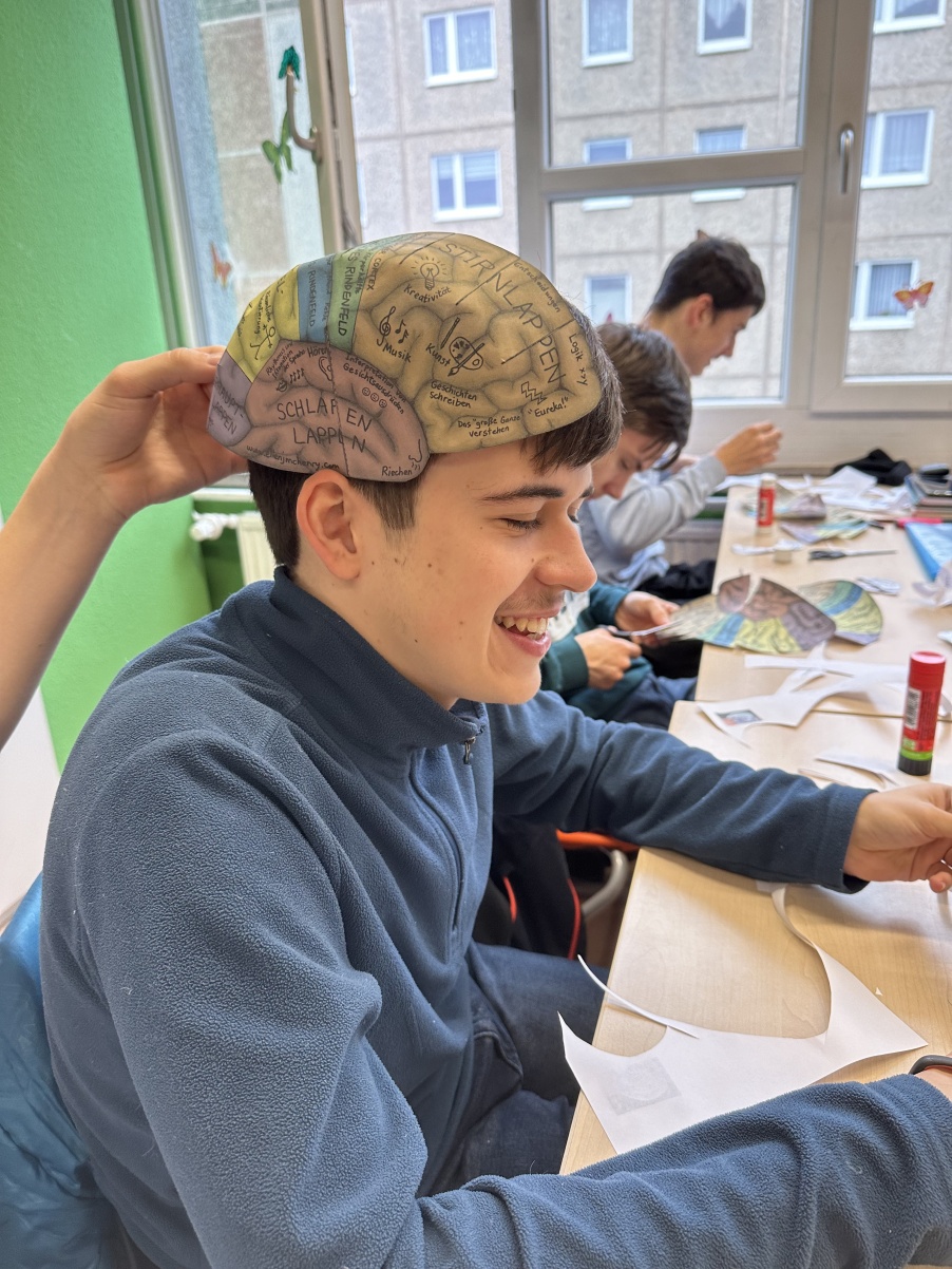 Am vergangenen Dienstag, dem 27.02.2024 bastelten wir, der Biologie-Leistungskurs des Gymnasiums „Gleichense“ Ohrdruf gemeinsam mit unserem Lehrer Herrn Scheidemann ein Gehirnmodell aus Papier. Aufgrund unseres aktuellen Themengebietes „Neurobiologie“, welches auch die Funktionen und Strukturen unserer Nervensysteme beinhaltet, wurde diese Praxisarbeit in den Unterricht mit einbezogen. Begonnen haben wir dieses Projekt mit zwei Bastelbögen, wo wir beide Gehirnhälften des Großhirns, sowie des Kleinhirns ausgeschnitten haben. Schon dabei konnten wir die einzelnen Areale des Groß-, Zwischen- und Kleinhirns detailliert betrachten, um unsere Vorstellungen eines Gehirns zu vertiefen. Beeindruckend fanden wir hierbei, dass alle Abbildungen den Originalgrößen eines echten Menschengehirns entsprachen. Des Weiteren wurden die einzelnen Funktionen der jeweiligen Areale auf dem Gehirnmodell hervorragend erklärt, wodurch unser Interesse an diesem Projekt intensiviert wurde. Während wir der Bastelanleitung folgten, schnitten wir behutsam weiter und klebten letztendlich beide Hälften des Großhirns sorgfältig zusammen, sodass dieses wie bei einem echten Gehirn ihre rundliche Form erhielt. Abschließend befestigten wir das Kleinhirn an unserem Modell, da dieses sich unterhalb des Hinterhauptlappens des Großhirns befindet. Somit waren unsere Gehirnmodelle in Originalgröße vollendet. Die Wölbungen konnten wir nun bestens erkennen, auch die Areale waren in verschiedenen Farben gekennzeichnet und deren jeweilige Funktionen für uns sehr gut verständlich erklärt. Nach lehrreichen Erkenntnissen, sowie jeder Menge Spaß konnten wir unsere Modelle nun endlich selbst aufsetzen. Dabei haben wir ganz genau sehen können, welcher Bereich sich mit welcher Funktion exakt an einer gewissen Stelle unseres Gehirns befindet. So wurde uns ein „Einblick“ in unser eigenes Gehirn ermöglicht. Diese Unterrichtsstunden waren für uns sehr lehrreich, sowie interessant, da sie unser Theoriewissen mittels praxisnaher Erkenntnisse vertieft und verständlicher gemacht haben. Nach viel Spaß und Abwechslung möchten wir uns bei unserem Biologielehrer Herrn Scheidemann recht herzlich für dieses Highlight und den  praxisnahen Unterricht bedanken.   Nun blicken wir den weiteren Unterrichtsstunden voller Motivation und Vorfreude entgegen.