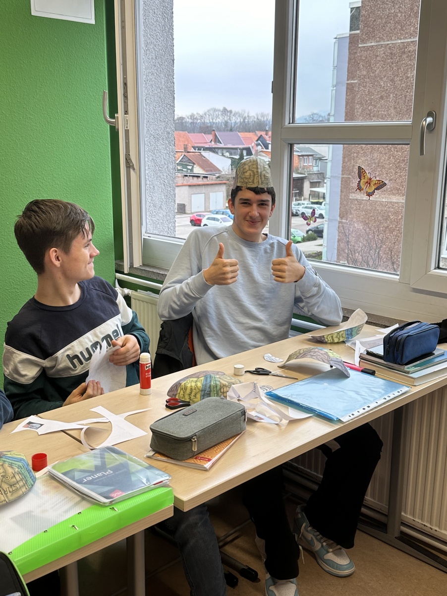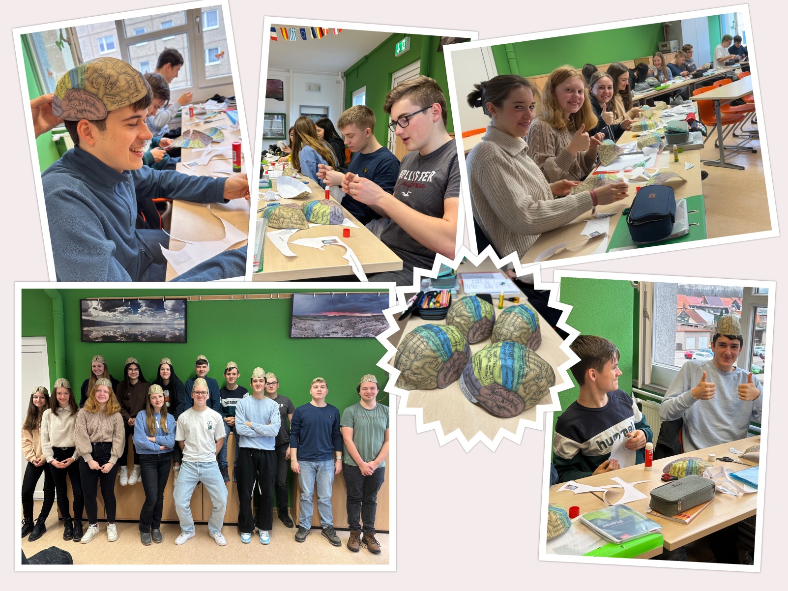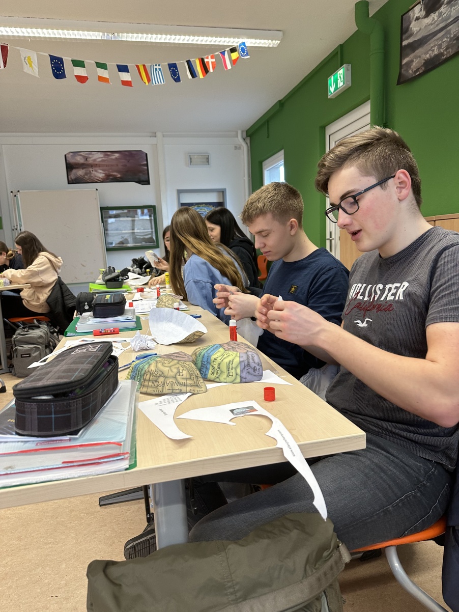 Am vergangenen Dienstag, dem 27.02.2024 bastelten wir, der Biologie-Leistungskurs des Gymnasiums „Gleichense“ Ohrdruf gemeinsam mit unserem Lehrer Herrn Scheidemann ein Gehirnmodell aus Papier. Aufgrund unseres aktuellen Themengebietes „Neurobiologie“, welches auch die Funktionen und Strukturen unserer Nervensysteme beinhaltet, wurde diese Praxisarbeit in den Unterricht mit einbezogen. Begonnen haben wir dieses Projekt mit zwei Bastelbögen, wo wir beide Gehirnhälften des Großhirns, sowie des Kleinhirns ausgeschnitten haben. Schon dabei konnten wir die einzelnen Areale des Groß-, Zwischen- und Kleinhirns detailliert betrachten, um unsere Vorstellungen eines Gehirns zu vertiefen. Beeindruckend fanden wir hierbei, dass alle Abbildungen den Originalgrößen eines echten Menschengehirns entsprachen. Des Weiteren wurden die einzelnen Funktionen der jeweiligen Areale auf dem Gehirnmodell hervorragend erklärt, wodurch unser Interesse an diesem Projekt intensiviert wurde. Während wir der Bastelanleitung folgten, schnitten wir behutsam weiter und klebten letztendlich beide Hälften des Großhirns sorgfältig zusammen, sodass dieses wie bei einem echten Gehirn ihre rundliche Form erhielt. Abschließend befestigten wir das Kleinhirn an unserem Modell, da dieses sich unterhalb des Hinterhauptlappens des Großhirns befindet. Somit waren unsere Gehirnmodelle in Originalgröße vollendet. Die Wölbungen konnten wir nun bestens erkennen, auch die Areale waren in verschiedenen Farben gekennzeichnet und deren jeweilige Funktionen für uns sehr gut verständlich erklärt. Nach lehrreichen Erkenntnissen, sowie jeder Menge Spaß konnten wir unsere Modelle nun endlich selbst aufsetzen. Dabei haben wir ganz genau sehen können, welcher Bereich sich mit welcher Funktion exakt an einer gewissen Stelle unseres Gehirns befindet. So wurde uns ein „Einblick“ in unser eigenes Gehirn ermöglicht. Diese Unterrichtsstunden waren für uns sehr lehrreich, sowie interessant, da sie unser Theoriewissen mittels praxisnaher Erkenntnisse vertieft und verständlicher gemacht haben. Nach viel Spaß und Abwechslung möchten wir uns bei unserem Biologielehrer Herrn Scheidemann recht herzlich für dieses Highlight und den  praxisnahen Unterricht bedanken.   Nun blicken wir den weiteren Unterrichtsstunden voller Motivation und Vorfreude entgegen.