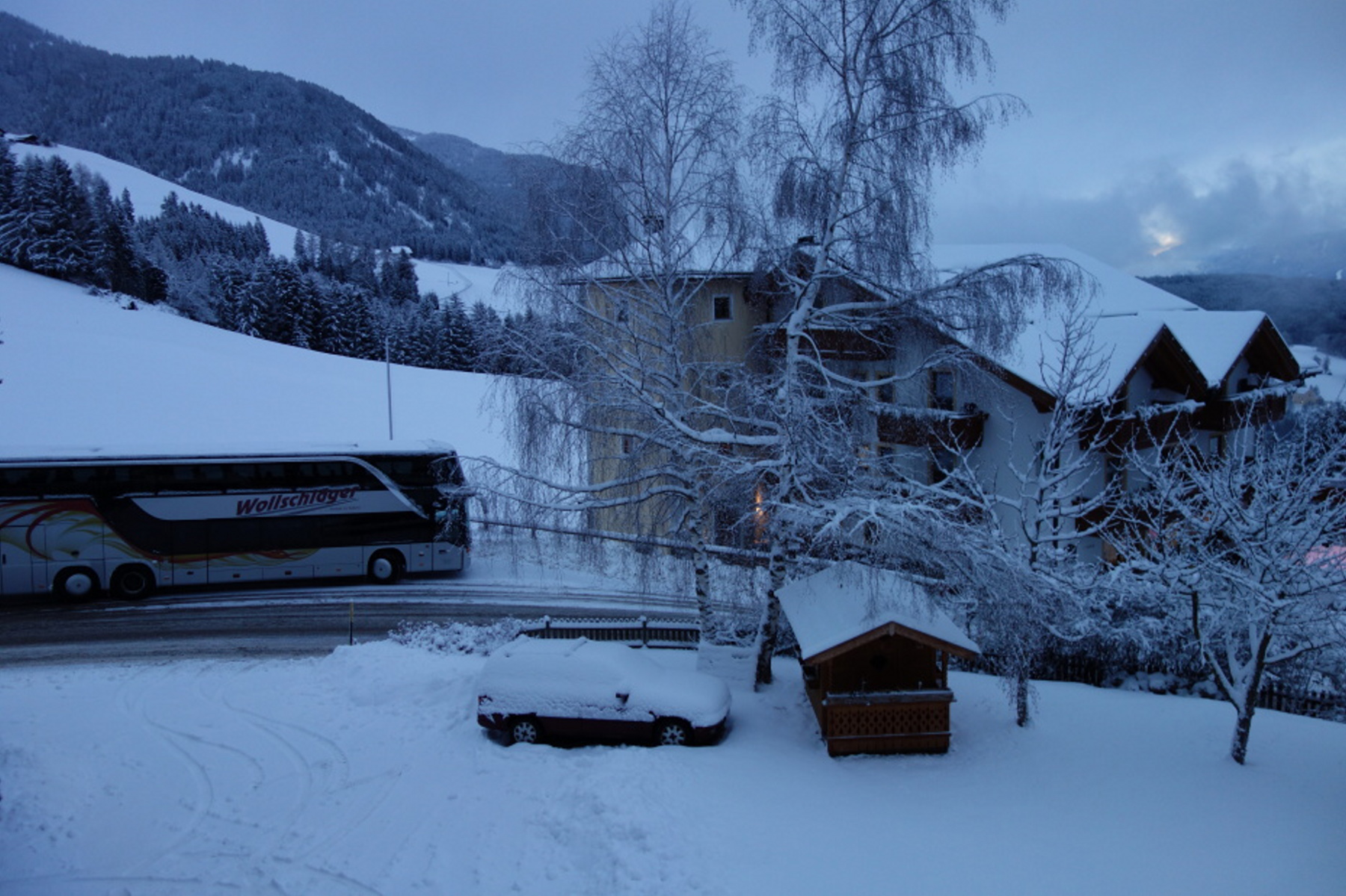 Unser Busfahrer brachte uns trotz schlechten Wetterbedingungen und turbulenter Fahrt sicher ans Ziel. Die letzten Meter stapften wir durch den Schnee. Der Gasthof „Hohenbichel“ in der Nähe von Terenten in Südtirol/Italien wurde für die nächsten vier Nächte unsere Unterkunft. Nach dem Abendessen folgte die Einteilung der Schüler in verschiedene Skigruppen. Alle freuten sich auf die kommende Woche.