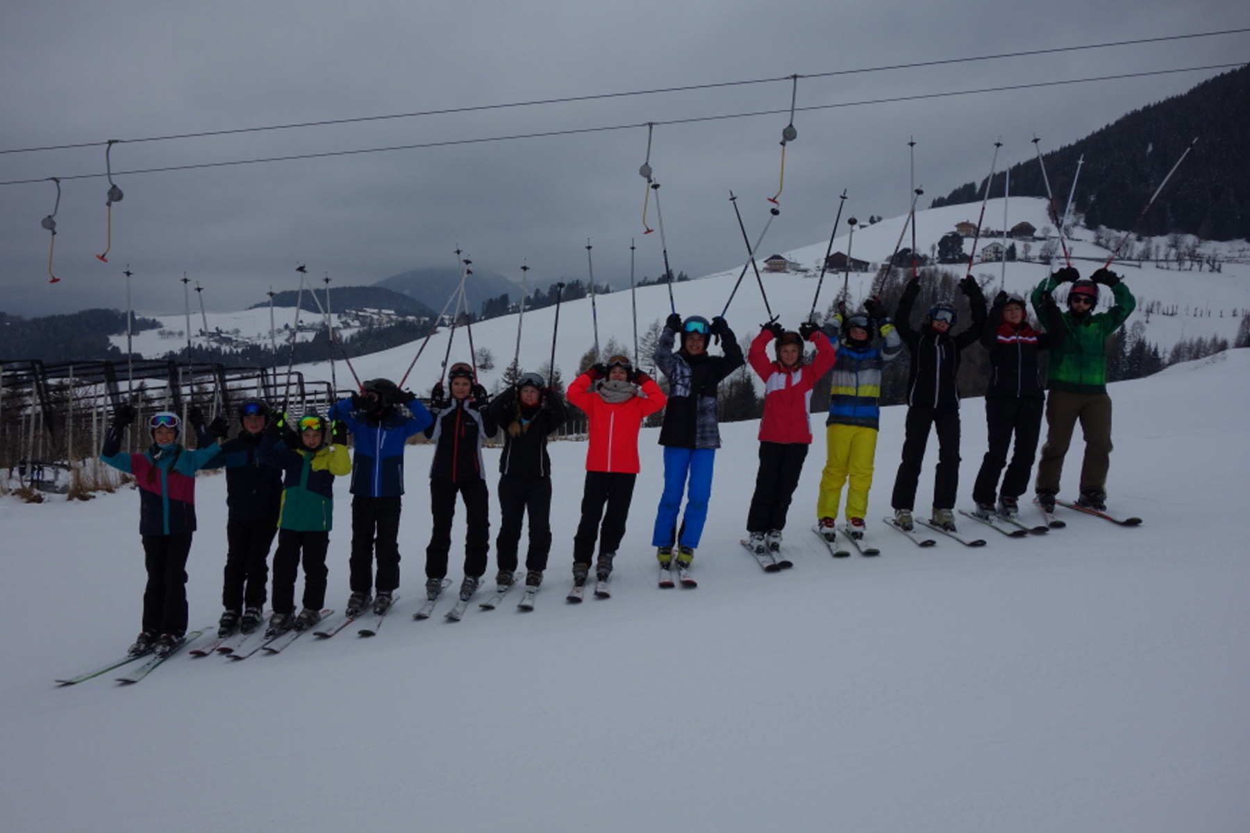 Am nächsten Morgen fuhren wir mit unserem Bus nach Pfalzen in unser Skigebiet. Dort liehen wir unsere Skiausrüstung aus. Anschließend liefen wir mit unseren Skiern zu den entsprechenden Pisten. Frau Hey, Frau Wittek und Herr Walter übernahmen die Gruppen der Anfänger. An einem flachen Hang übten sie Bremsen und Kurven fahren. Die Fortgeschrittenen wurden von Frau Backhaus betreut. Sie festigten ihre Fahrtechniken und lernten Neues dazu. Unsere beste Gruppe, die Profis, wurde von Frau Koppe und Herr Ender geleitet. Auch sie vertieften ihr Können und erhielten Tipps und Tricks.