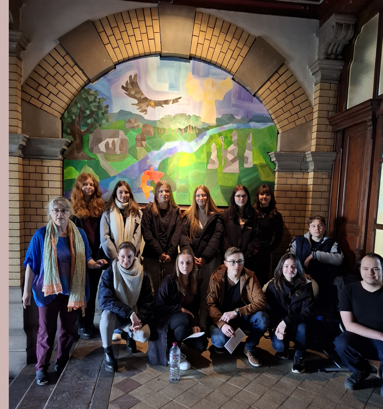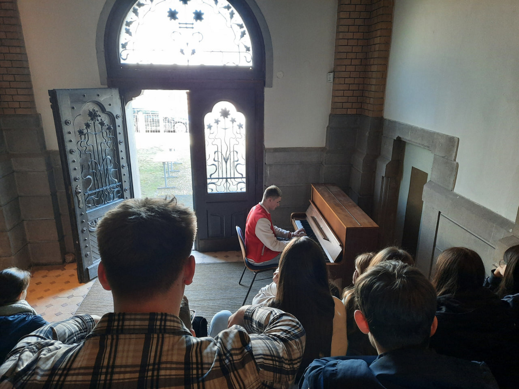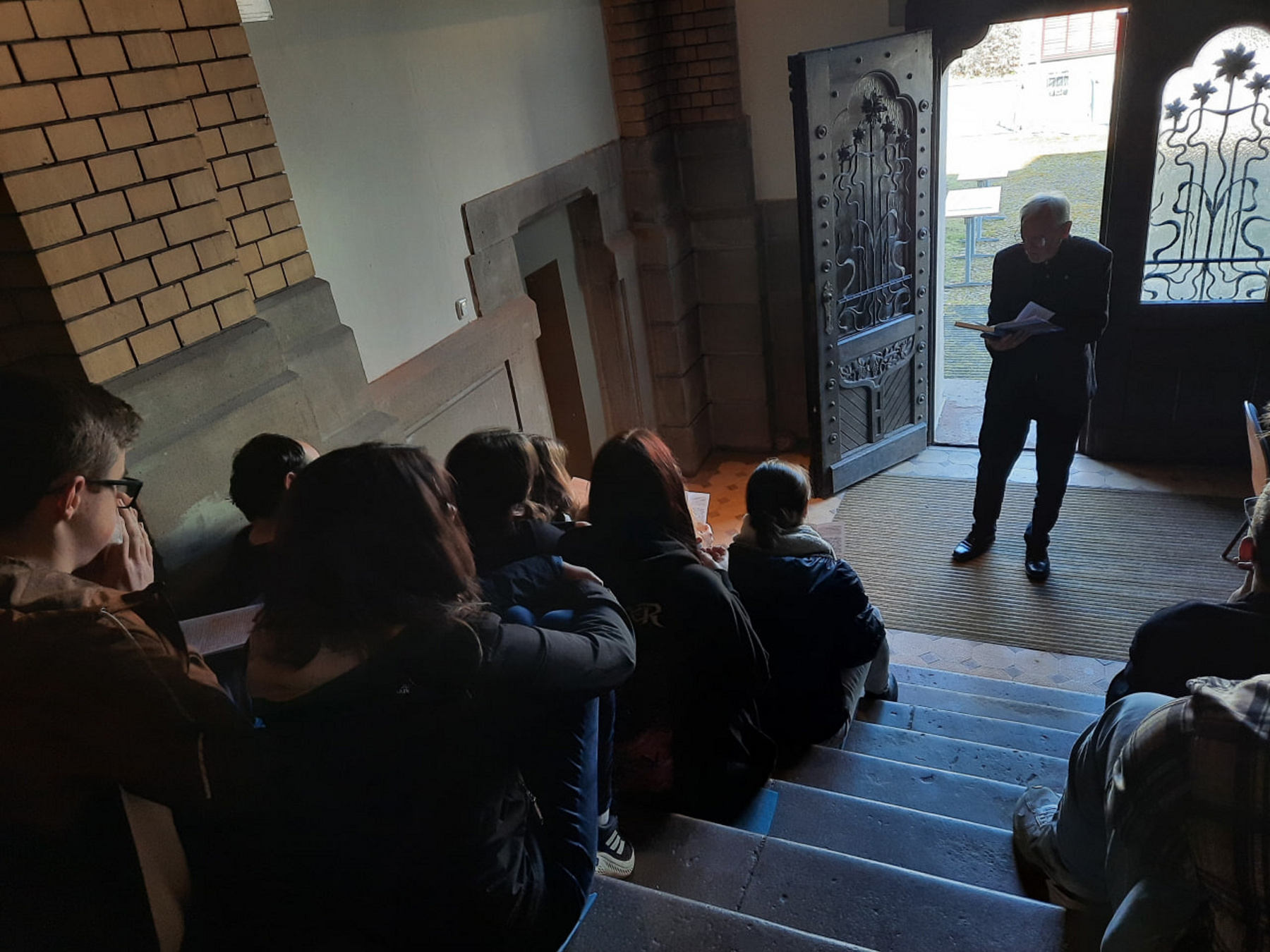 Zweiundzwanzig Kursschüler sitzen auf den Stufen des Treppenhauses auf extra beschafften Sitz-Isomatten. Denn oben auf den Stühlen ist Platz für die weiteren Gäste und Teilnehmer. Ohrdrufs Bürgermeister Stephan Schambach kann sich über ein weiteres Bonifatiusbild mitfreuen, was seinen Platz im Haupteingang des Trinitatishauses gegenüber zweier weiterer repräsentativer alter Gemälde erhalten hat. Ideengeber war Oberpfarrer i.R. Hans-Joachim Köhler, der als Ohrdrufer Bonifatiusexperte auf die schulhistorische Geschichte des 8ten Jahrhunderts vor Ort in kurzen Worten verweist. Schulleiter Stephan Marschner bedankt sich mit großer Freude bei den Mitwirkenden und Projektleiterin, Kunsterzieherin Margarete Pohl, für dieses außergewöhnliche Projekt. In der Laudatio auf der Basis von Texten der Zwölftklässler wird deutlich, wie besonders diese Teamarbeit den Teilnehmenden geworden ist. Karla Erdenberger und Darek Hanke, beide aus Klasse 7, umrahmen als junge Pianisten das Programm. Anschließend gibt es vor dem Portal noch Gelegenheit zur Begegnung.