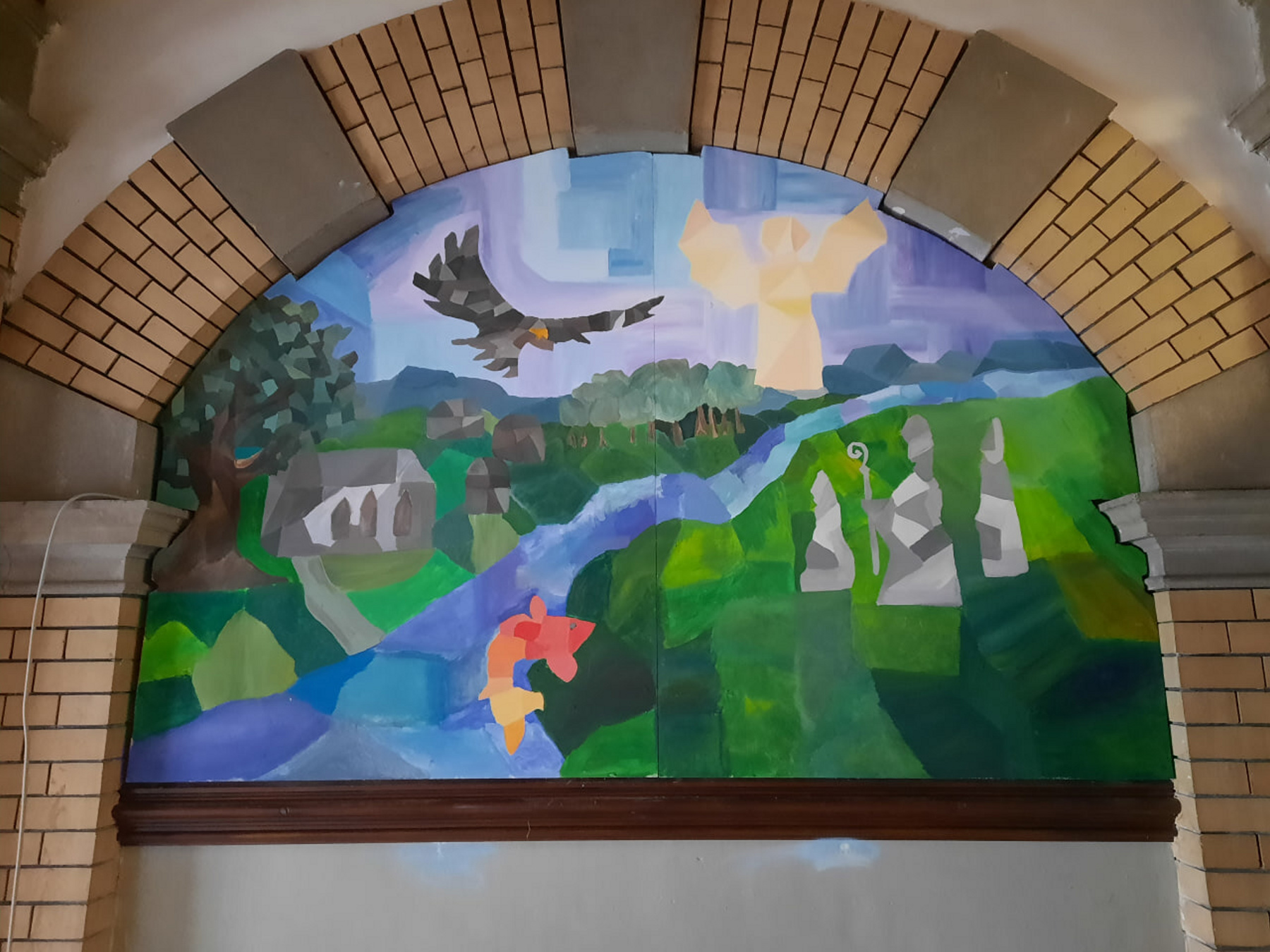 Da mit Bonifatius und der ältesten nachweislichen Klostergründung Thüringens 1300 Jahre Schulgeschichte in Ohrdruf begannen, sind die lokalen Legenden – zitiert mit Adler, Fisch, Kirche, Mönchen, verortet mit Ohra-Fluss und grün leuchtender Thüringer Landschaft – Motive des in kubistischem Stil umgesetzten Acryl-Gemäldes auf einer großen Spanplatte. Die Malplatte in spezieller Form verdankt die Projektgruppe dem Berufsschulzentrum Gotha über den Schulleiter Dr. Uwe Kirschberg. Schulhausmeister Marco Triebel löste mehrere diffizile Probleme rund um dieses Bild, beginnend mit einem Schnittmuster in Originalgröße aus Wellpappe für die Werkstatt in Gotha, denn die Form des Aufhängungsortes beinhaltete einen speziellen Bogen mit „Zacken“ – siehe Fotos.