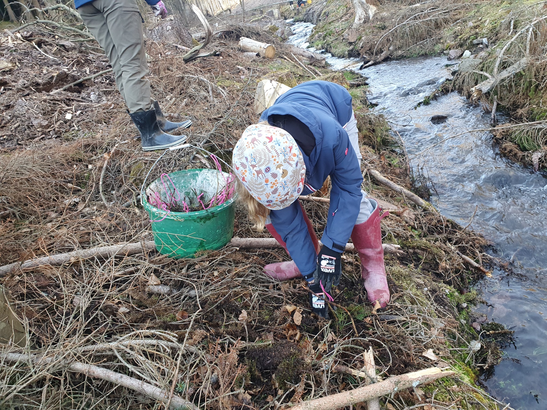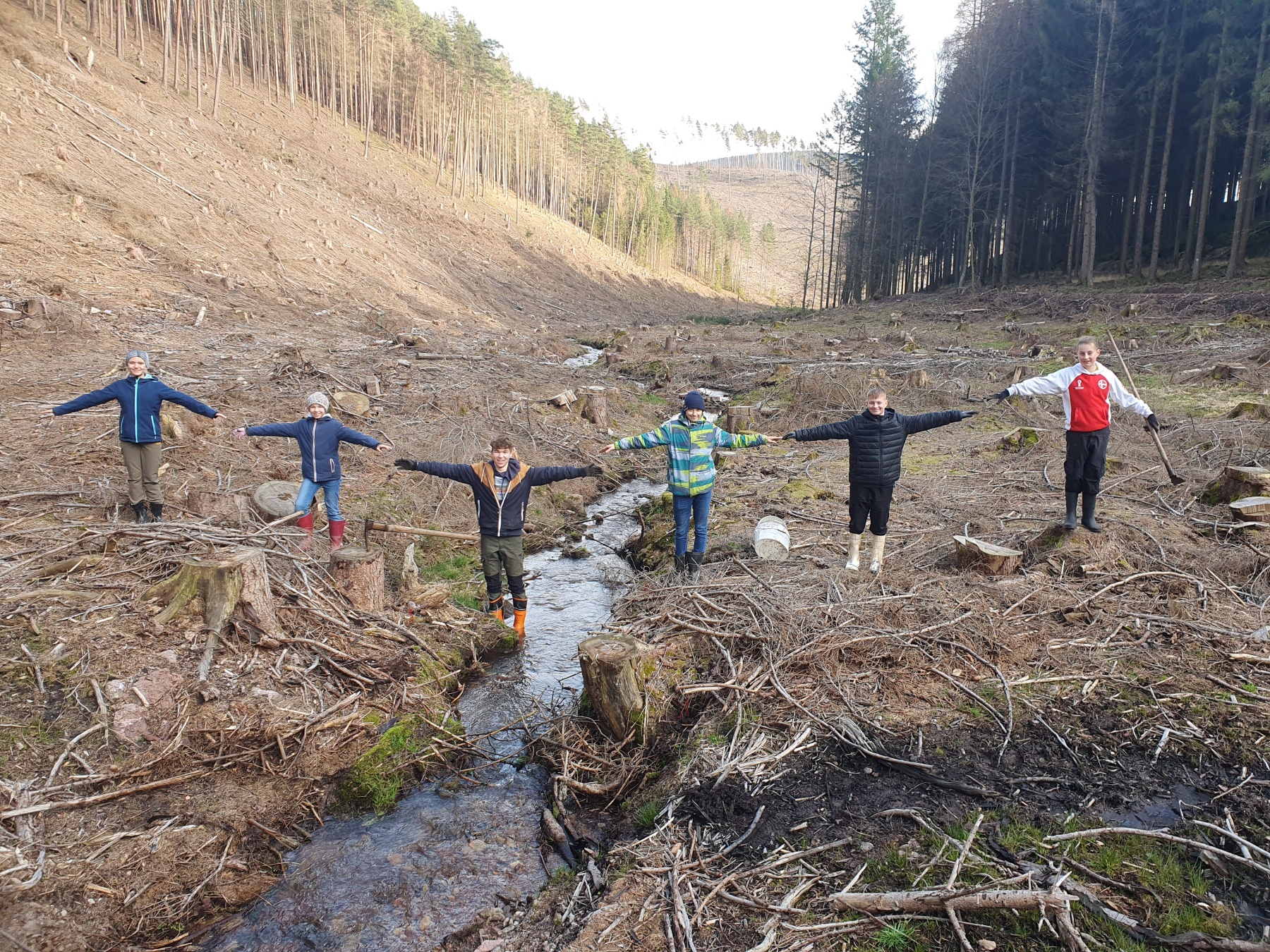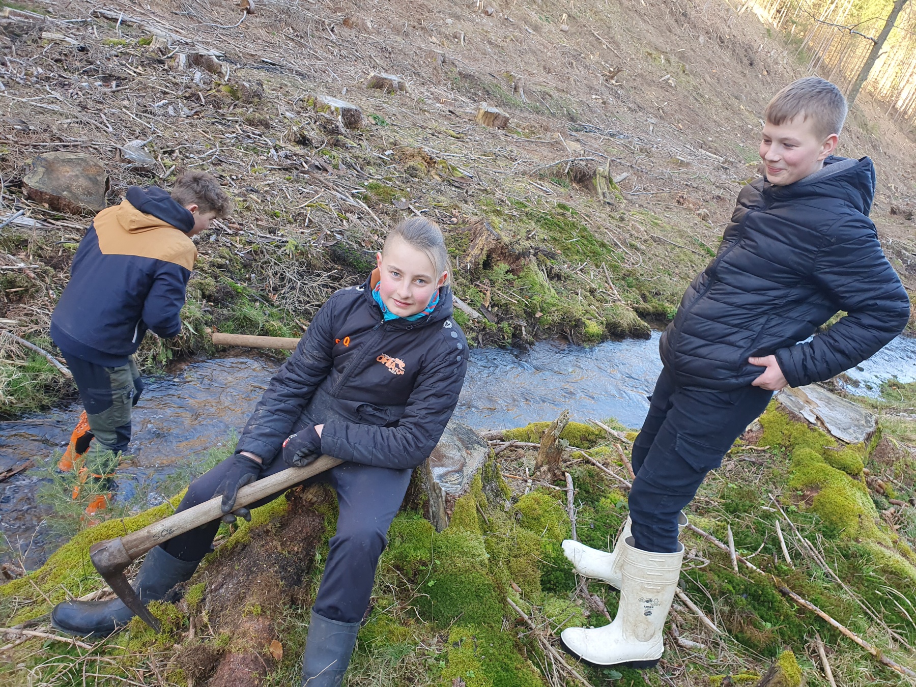 Mittlerweile kann man die ECO Aktiven des Gymnasium Gleichense schon bald erfahrene Pflanzer nennen, denn ihre Aufgabe der Erlenumbettung beherrschen sie aus dem FF. Auch bei der vorerst finalen Aktion im Lehmgrund zu Luisenthal wusste jede/r was, wann und wie zu tun war. So brachten die acht Kinder Anfang März schon einmal 222 Setzlinge an den Bachlauf und wiederholten abschließend das Ganze nochmals mit 100 Bäumchen, so das sich fortan nahe des Vorfluters kleine, gesunde Erlen dem Himmel empor strecken und bei etwas Glück und keinen super trockenen Sommern zu großen Bäumen heranwachsen können. Diese binden dann Wasser, halten Erdreich, bieten Schatten und bremsen die Fließgeschwindigkeit des Bächleins. Kurzum, sie helfen dem Tal ökologisch zu gesunden. Und so wurden die Aktiven zu kleinen Erlkönigen, die der eigentlichen Ballade von Goethe, mit ihrem tödlichen Ausgang, eine ganz andere Bedeutung einhauchten. Nämlich die des Lebenspendens.