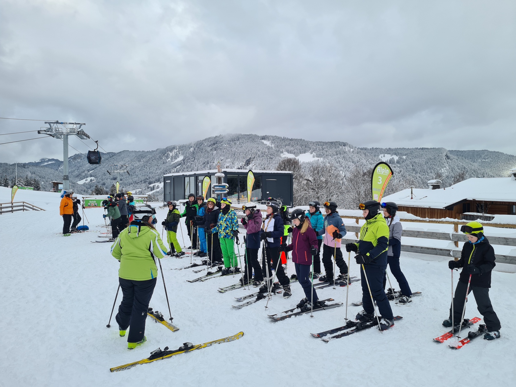 Bei 7°C sind wir, die Schüler*innen der Klassenstufe 7, zwei Eltfklässler und das Lehrerteam, am 09.01.2023 nach Kempten gestartet. Die Aussichten auf ausreichend Schnee waren schlecht und mit mehr als Kunstschnee war nicht zu rechnen. Die Ankunft im Skigebiet Fellhorn bestätigte leider unsere Vermutung. Zudem kam das lange Warten an der ersten Skiausleihe dazu, an der wir unsere Skiausrüstung nicht bekamen. Wir wurden zum Skigebiet Nebelhorn weitergeleitet und durften dort unsere Ski entgegennehmen. Anschließend fuhren wir zu unserer Unterkunft „JUFA“ in Kempten. Das Familienresort überraschte mit schönen Zimmern, gutem Essen und einem breitgefächerten Freizeitangebot (Tischtennisplatten, Kino, Billiard, Tischkicker und Kletterräume). Von da an versüßten uns die Spezialitätenbuffets die Abende. Am nächsten Morgen ging es endlich im Skigebiet Söllereck los. Leckeres Frühstück und frischer Pulverschnee ab 900m bescherten uns gute Voraussetzungen für den ersten Skitag. Der ein oder andere vergaß zwar Handschuh, Helm oder Liftkarte, aber irgendwann ging es dann doch in Gruppen, entsprechend unseres Leistungsvermögens (ROOKIES und FORERUNNERS), los. Durch die nette Aufmerksamkeit anderer Gäste wurden unsere „Spezialisten“ doch noch mit Handschuhen versorgt. Nach ein paar technischen Einführungen ins Material ging es für die ROOKIES auf den Zauberteppich. Die FORERUNNERS erkundeten die Pisten. Diese waren gut präpariert und sorgten für weiche Stürze. Zum Mittag besuchten wir die Berggaststätte „Schönblick“, in der das Essen ebenso lecker schmeckte wie in der Unterkunft. Nach einem anstrengenden Skitag ging es zur Entspannung ins Schwimmbad CamboMare, wo die Zeit mit Reifenrutsche und Strömungskanal viel zu schnell verging. Anschließend wurde die erste von vielen Werwolf-Runden absolviert.
