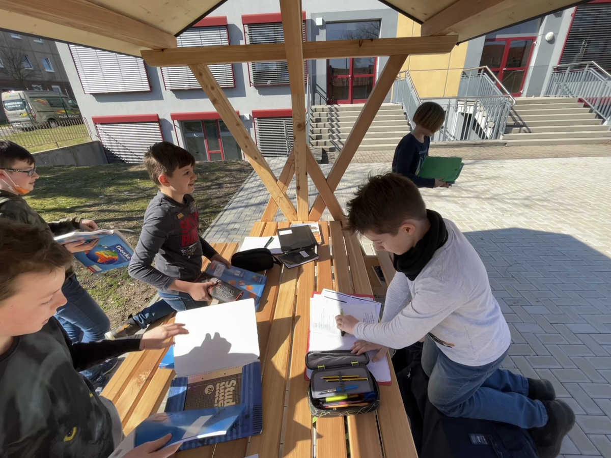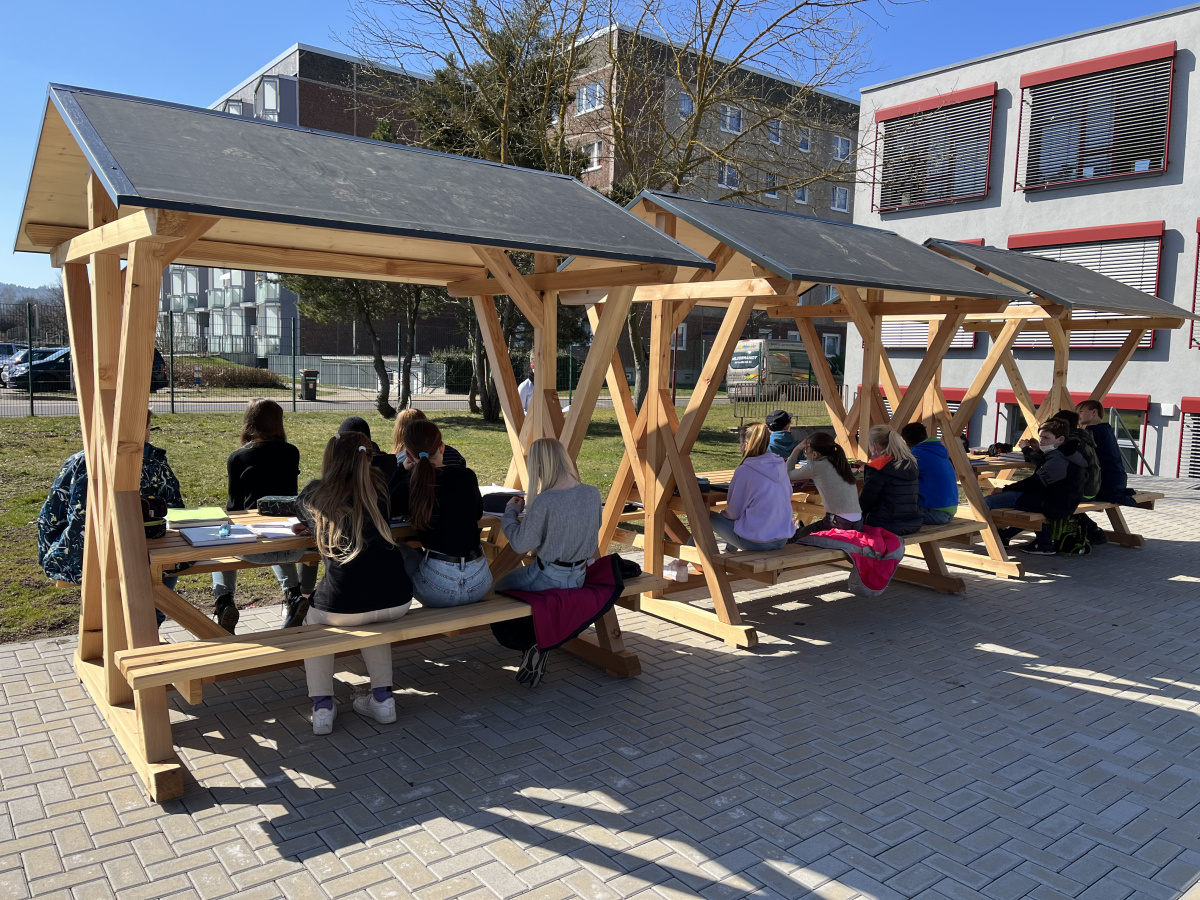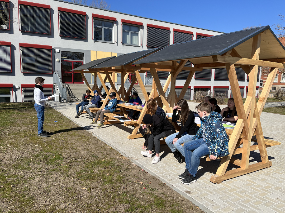 Endlich ist es wieder so weit. Der Frühling ist da und das bedeutet Sonne, Frühjahrsblüher und auch Unterricht im Freien. Letzte Woche bekam unser Gymnasium für das Projekt: „Grünes Klassenzimmer“ drei Waldschänken geliefert. Nun gibt es auch einmal die Möglichkeit eine Unterrichtsstunde in der Natur durchzuführen. Unser Geographielehrer Herr Scheidemann nutzte gleich am nächsten Tag die Gelegenheit und so nahmen wir unsere Atlanten und eroberten die neuen Sitzgelegenheiten. Wir hatten eine sehr interessante Unterrichtsstunde bei schönem Sonnenschein und hoffen auf eine baldige Wiederholung. Inzwischen haben auch schon einige andere Lehrer mit ihren Klassen diese Unterrichtsform genutzt und sehen das als echte Bereicherung im Schulalltag. An dieser Stelle sagen wir DANKE der Stadt Ohrdruf, insbesondere Frau Kaufmann und der Tischlerei Jakobi. Das „Grüne Klassenzimmer“ ist Teil des Projekts „Biodiversitäts-Lehrpfad“ und es gibt noch einige Ideen, die verwirklicht werden sollen. Wir sind gespannt und freuen uns auf kommende Erweiterungen.