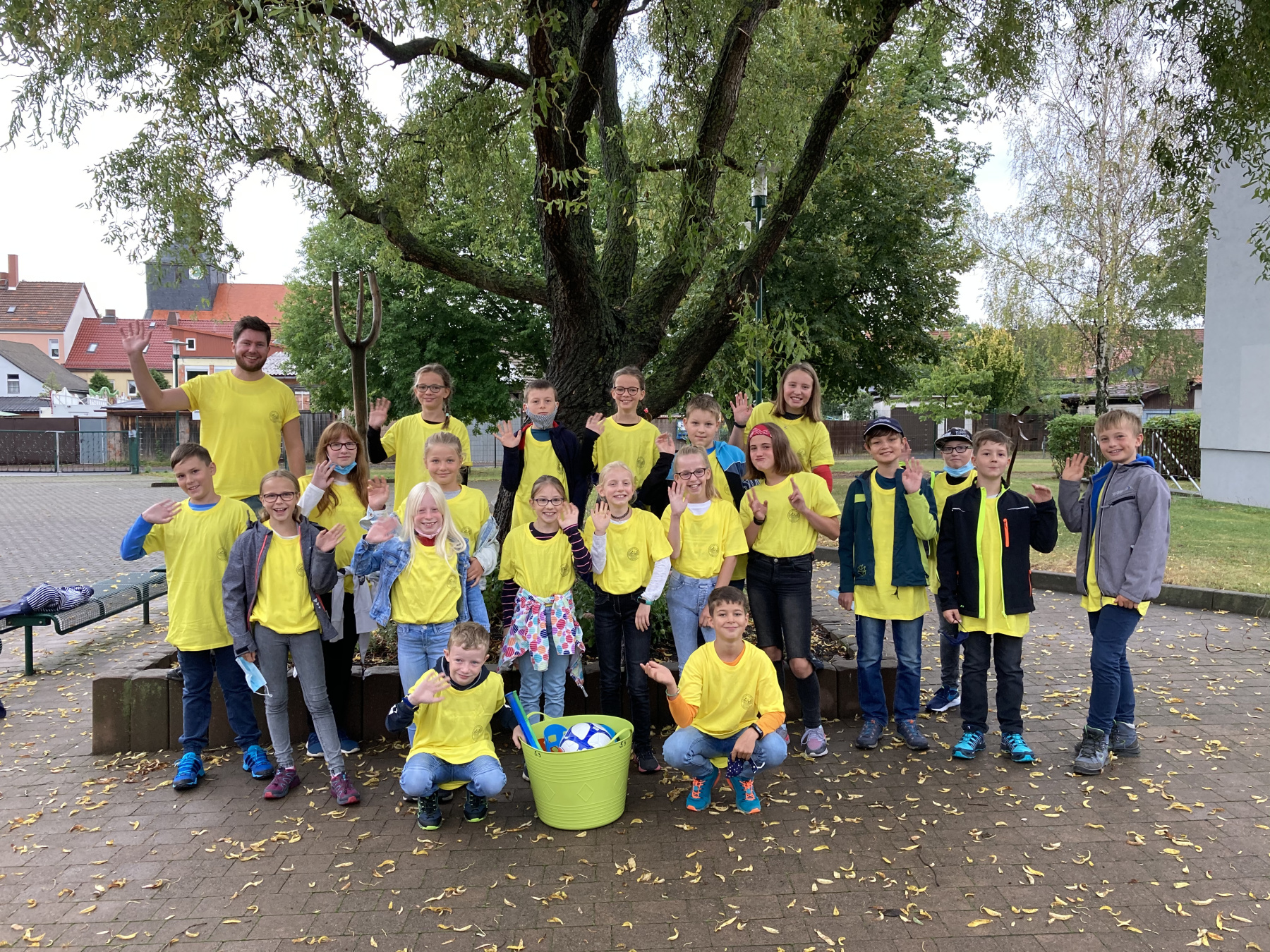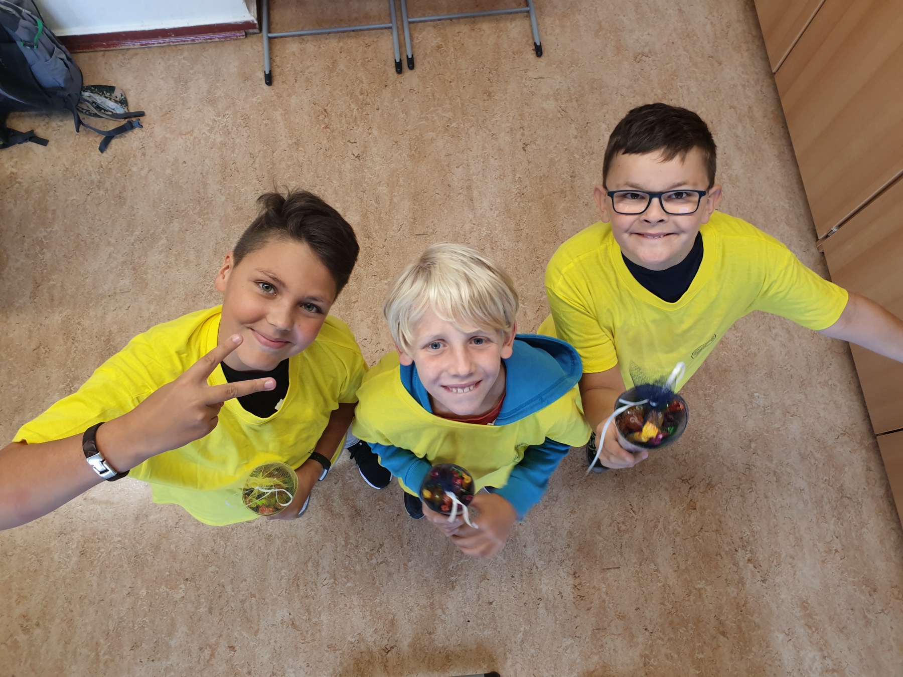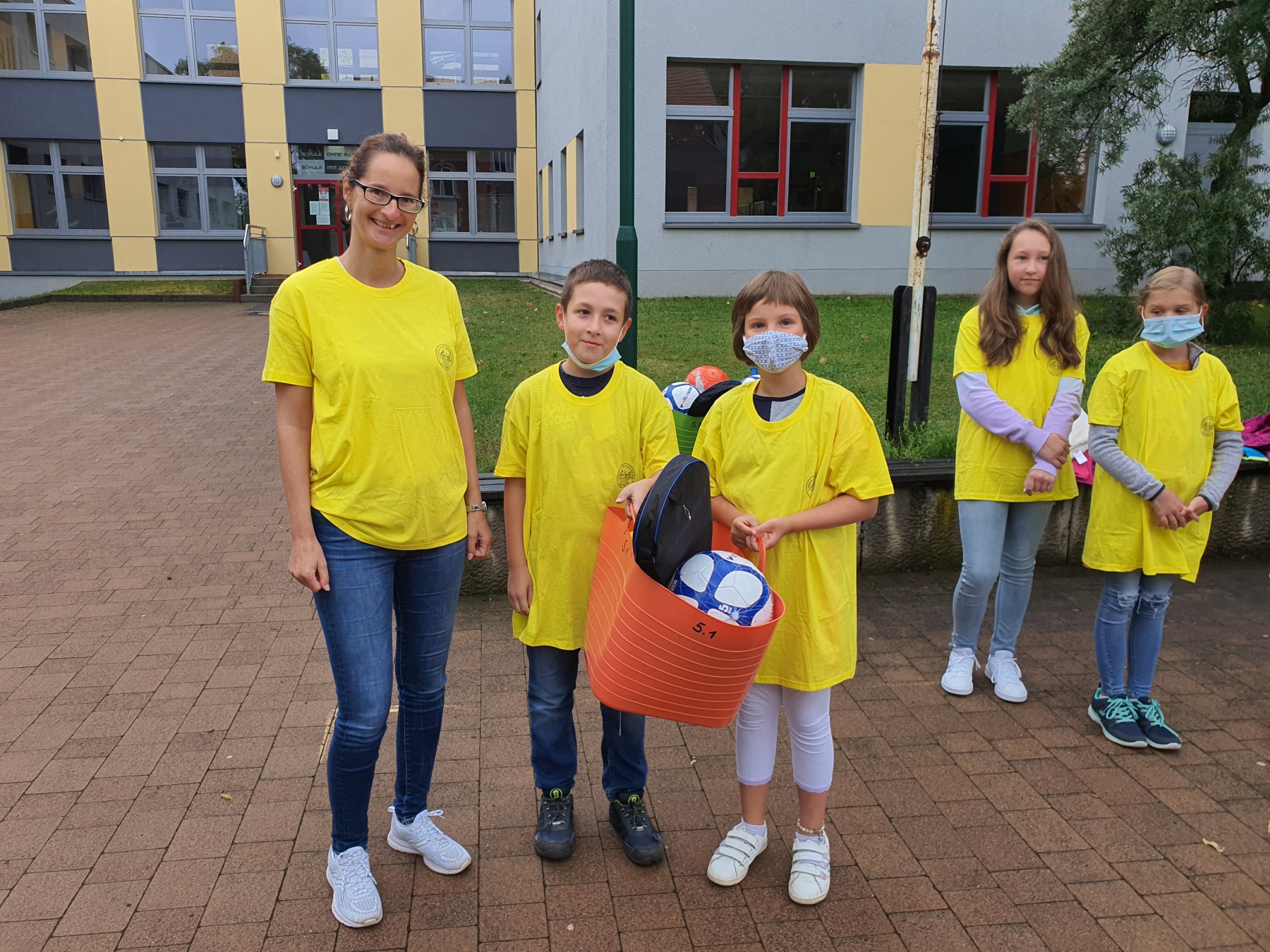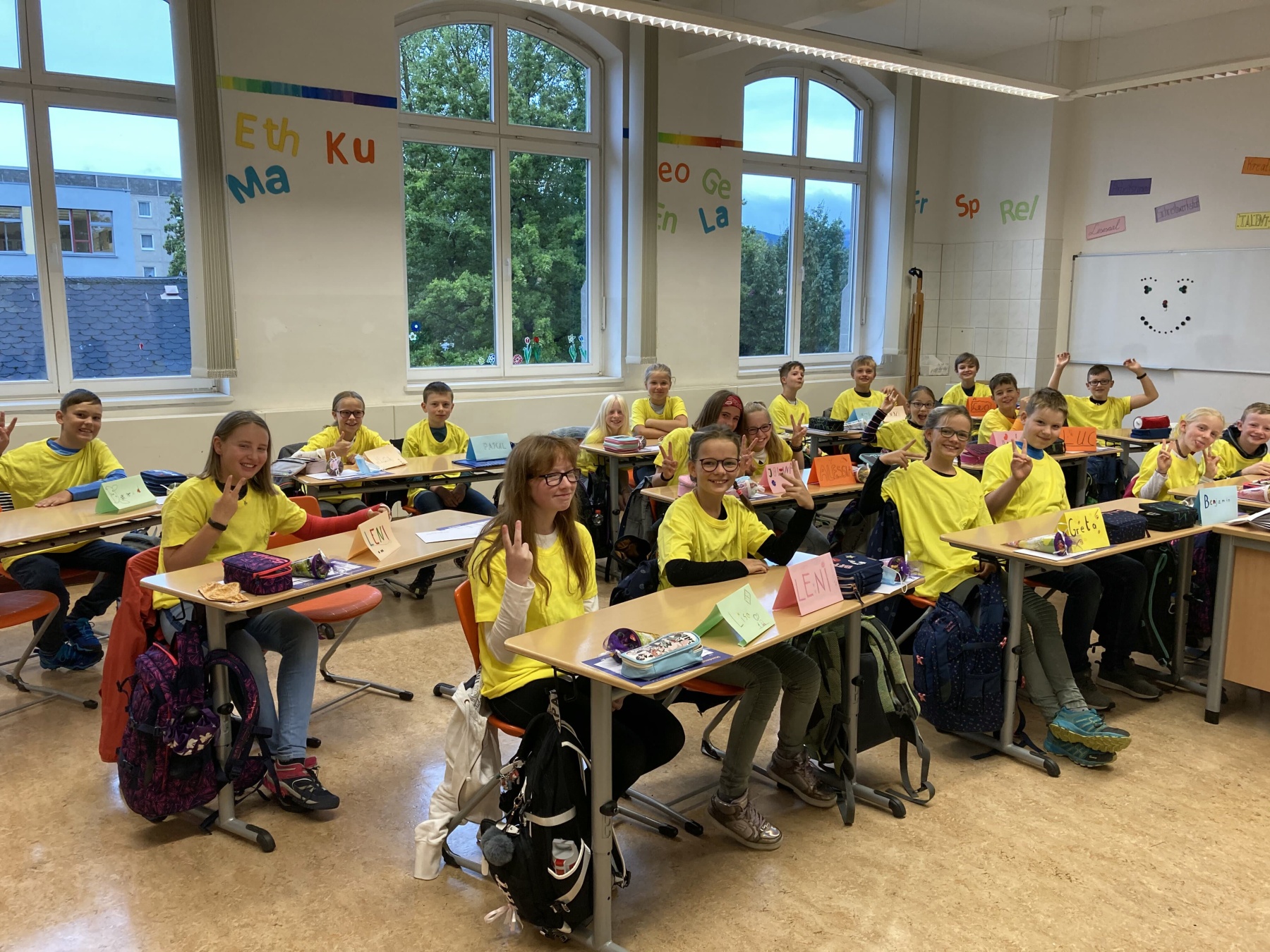 Aber auch Spaß und Spiel durften an den ersten beiden Schultagen nicht fehlen. Von unserem Direktor Herrn Dr. Rühl bekam jede Klasse eine Spielkiste für die aktive Pausengestaltung überreicht. Zum abschließenden Fototermin mit den neuen Schulshirts winkten alle fröhlich in die Kamera.
