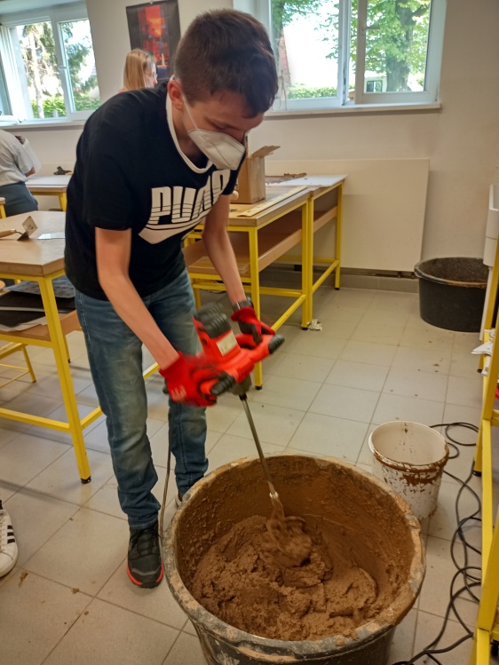 Die Schüler der 10. Klassen wurden für Materialien und deren Nachhaltigkeit sensibilisiert und erfuhren deren Vorteile für ein gesundes Wohnen in einem Workshop mit Tobias Schönemann, Lehmbaumeister und Zimmermann aus Bad Tabarz. Im Anschluss konnten sie die Arbeit mit Lehmputz an einem Werkstück erproben. Sie brachten sowohl einen Grob- als auch einen Feinputz auf eine Trägerplatte auf und glätteten diese. Hier konnten die Schüler unterschiedliche Putzeigenschaften erproben und Sumpfkalk und Pigmente beimischen sowie die Eigenschaften der Kellen testen.