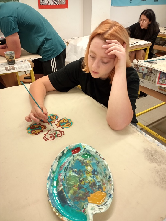Nun folgte eine konzentrierte und stille Phase im Projekt. Dekormaler Stefan Klein aus Friedrichroda zeigte die Arbeit eines Kunstmalers, wie sie in Jugendstil Gebäuden in Form von Decken- oder Wandmalereien Anwendung fand. Schließlich schufen sie selbst mit Hilfe ihrer Lehrerin S. Benger- Neumann eine ornamentale Malvorlage, die in gelernter Technik auf die Platten übertragen wurde, um sie dann mit selbst angerührten Farben auszugestalten. Das praktische Projekt ermöglichte ihnen eigene künstlerische Ideen einzubringen. Schließlich erfuhren sie wie man mit Ölen und Seifen diese Flächen nicht nur veredeln kann, sondern auch widerstandsfähiger für die Anwendung am Baudenkmal macht.