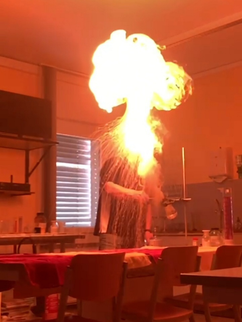 So einfach sind Brände aber nicht immer zu löschen. Als Herr Gentzen versuchte, das brennende, glühende Magnesiumhäufchen mit Wasser zu löschen, explodierte der Brandherd förmlich und glühende Metallstückchen flogen durch die Luft. Magnesium ist so unedel, dass es in der Hitze in der Lage ist, Wasser den Wasserstoff zu entreißen und dieser brennt bekanntlich sehr gut.