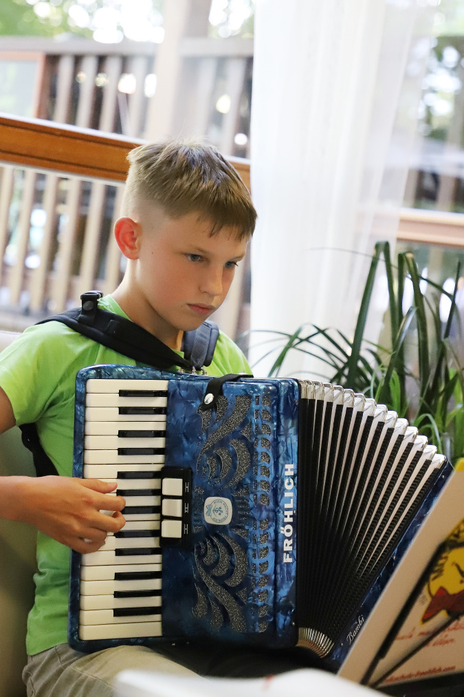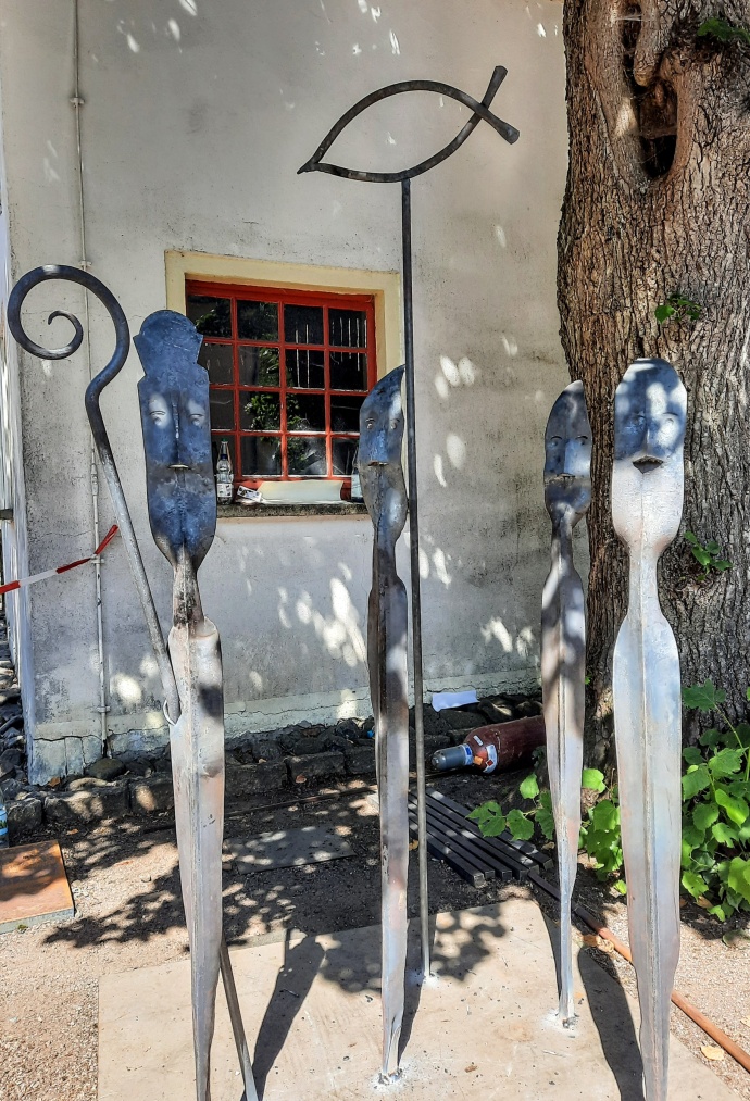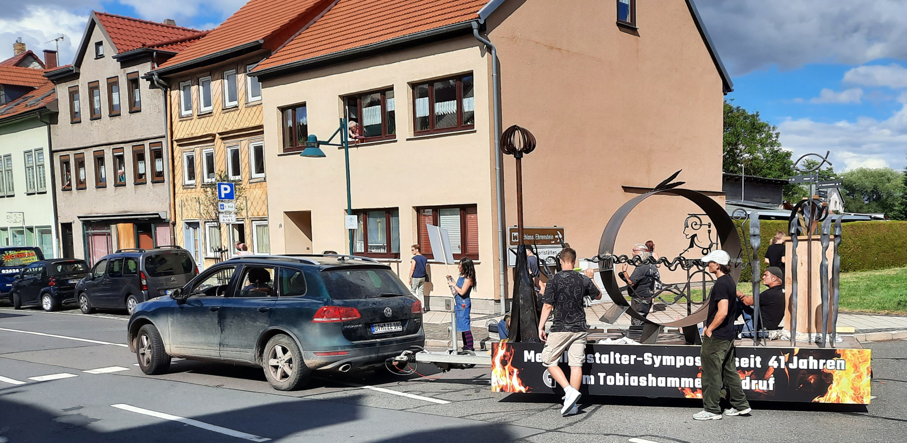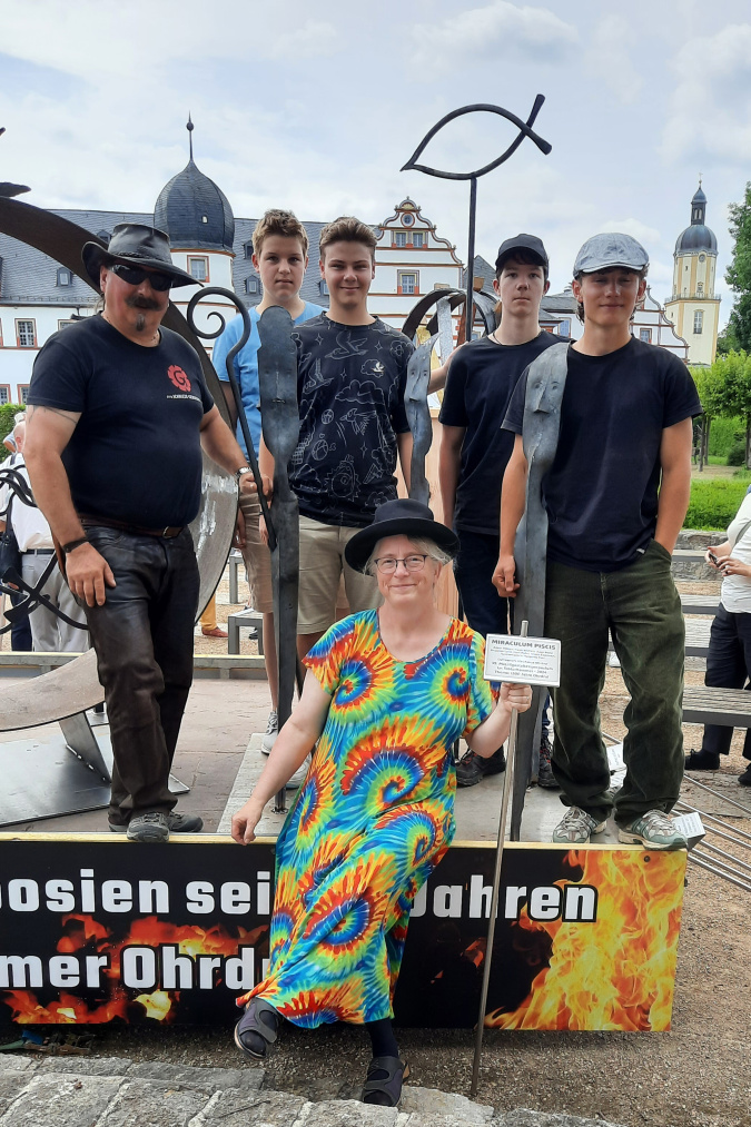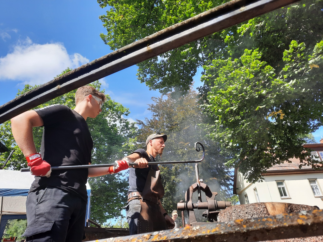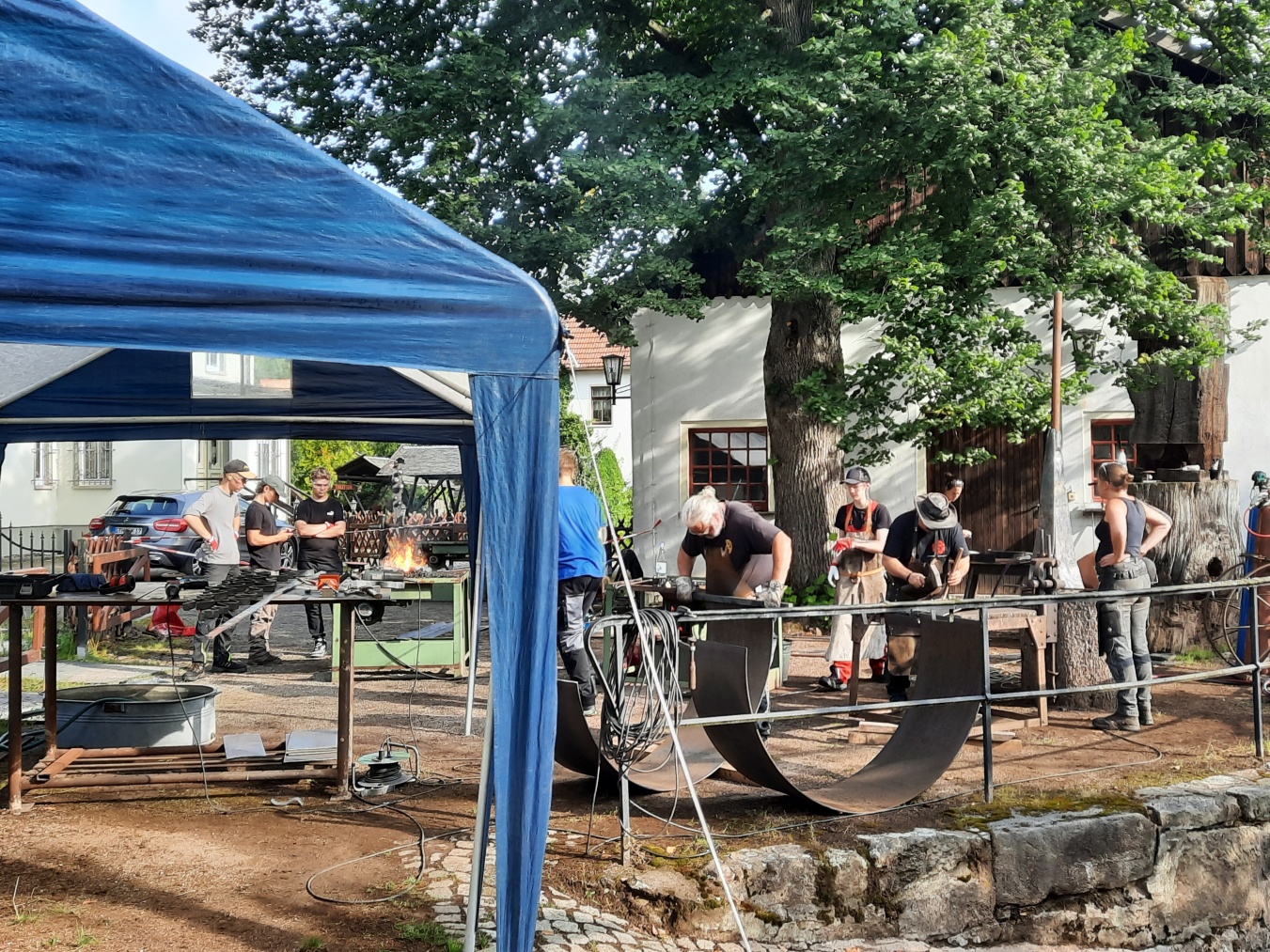 Montag 12.8. – Auftakt in der Schlossgartenpassage – Arnold stellt in einer gut vorbereiteten Rede die Idee des Teams für 2024 vor; Frau Herger und ihre Mitstreiter Linda Böhm, Alexander Kühn (beide Akkordeon), Elias Schimmeräugl (Gesang) umrahmen das Programm musikalisch; den Schmiedekünstlern und ihren Ideen hören wir interessiert zu; die ersten Gespräche mit den Profis folgen im Anschluss des Programms