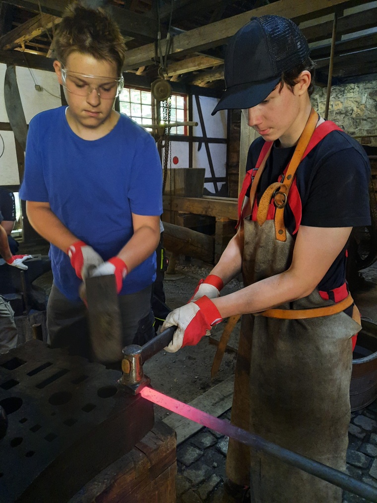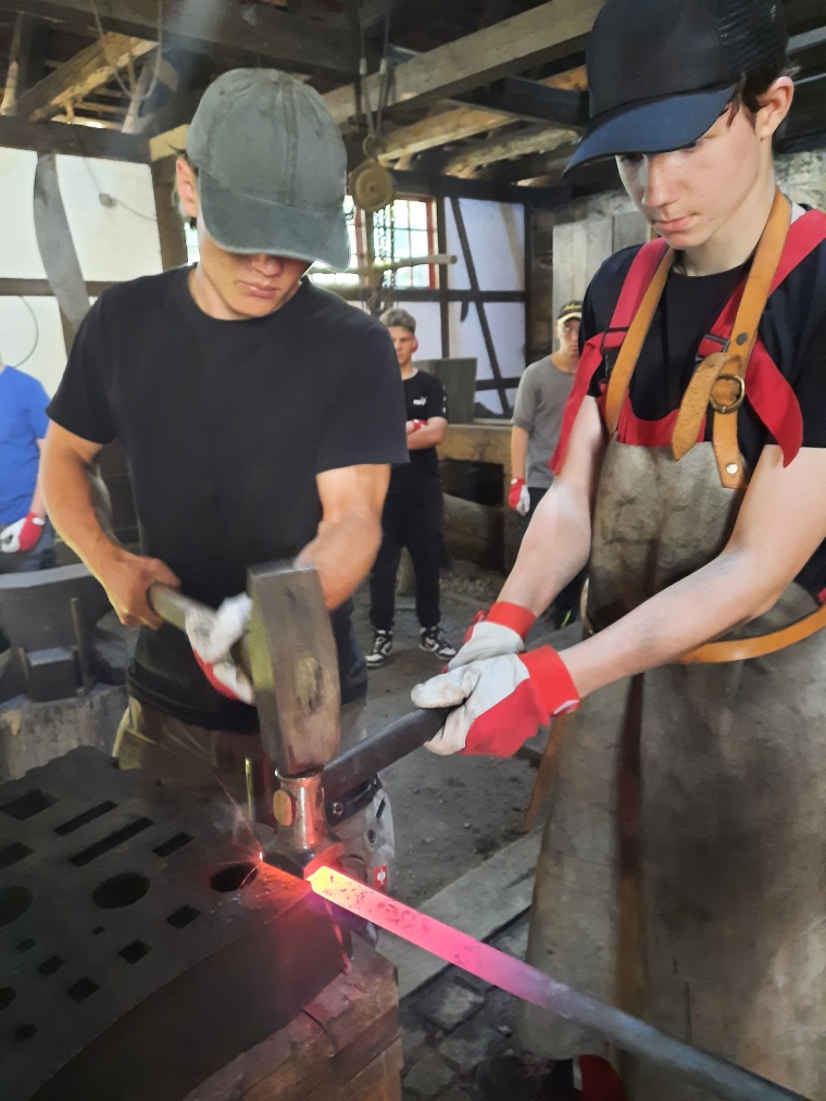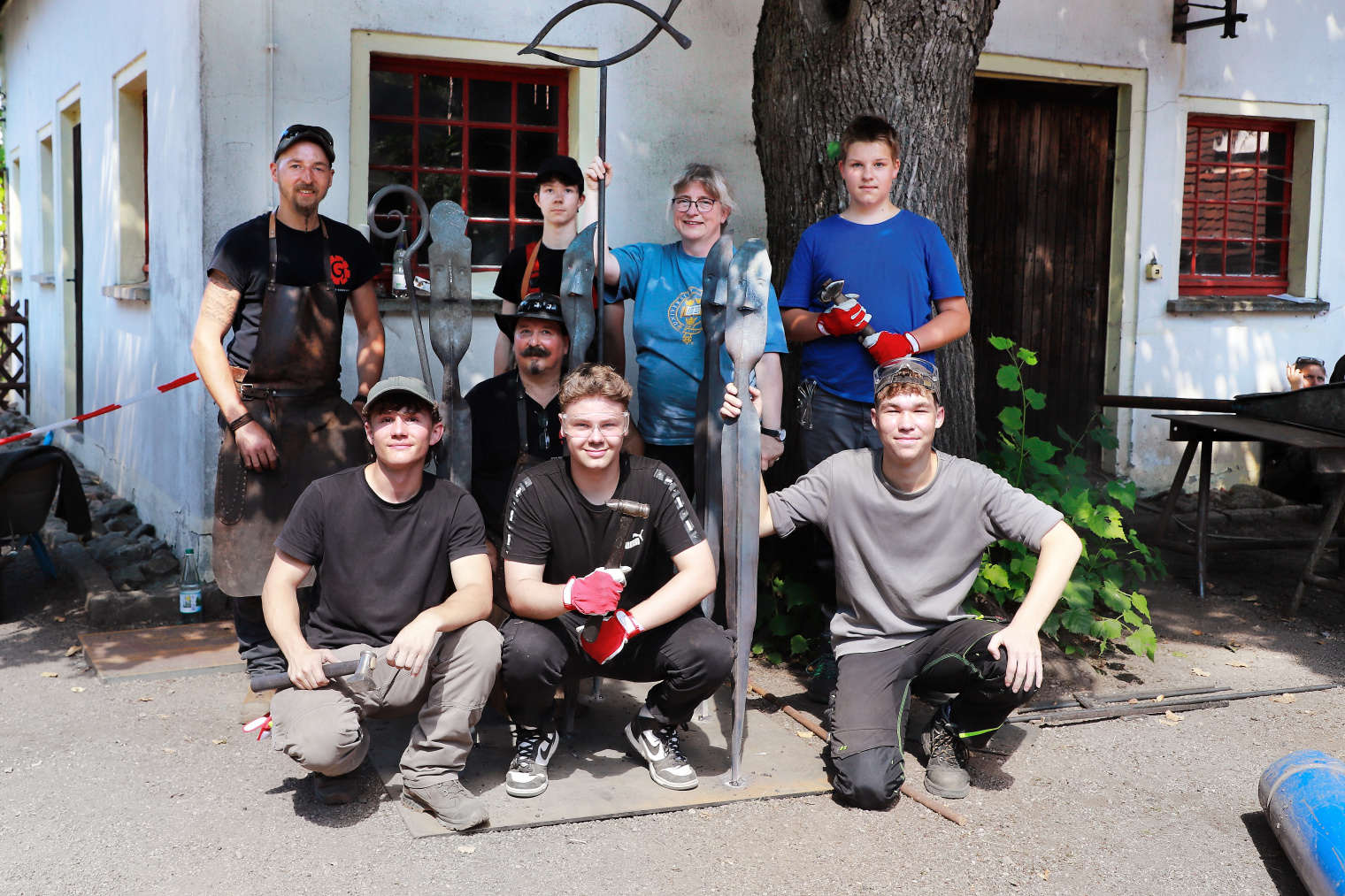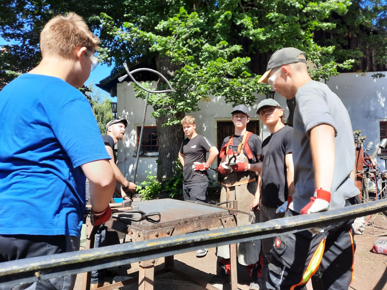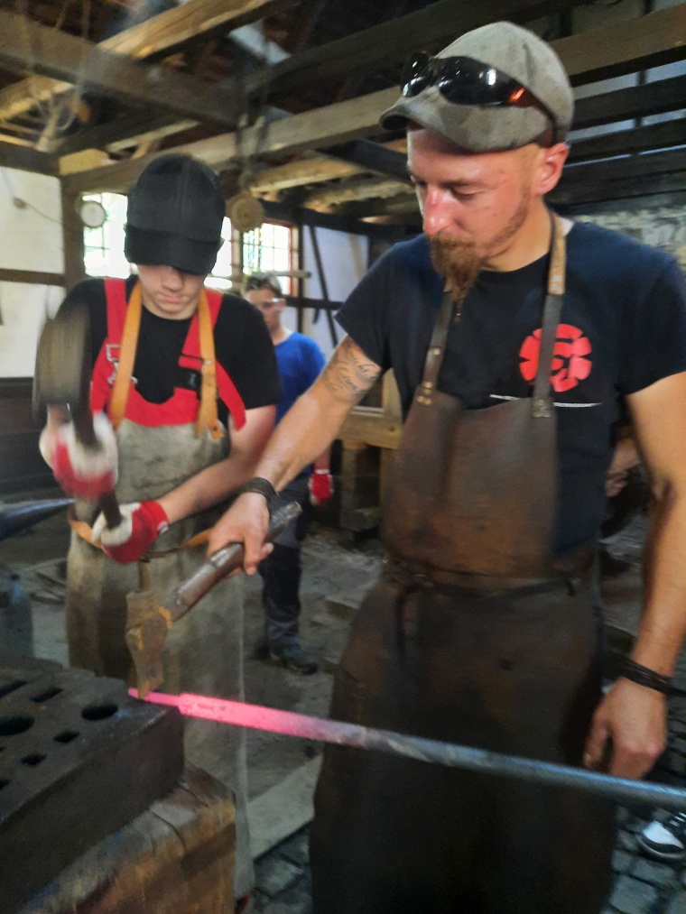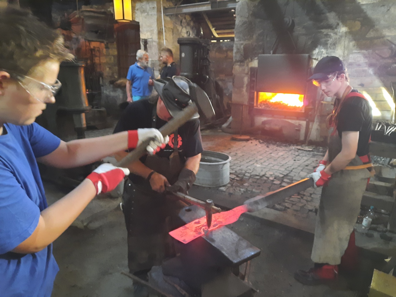 Donnerstag 15.8. – „Tag der Schüler“ – alle holen sich schwarze Hände, Arme, Nasen … zwischen Feuer, Kohlen, Hämmern usw. – siehe Fotos – am Ende unseres Tages ca. 15 Uhr (der Rest der Schule hatte Turbo-Unterricht wegen Sommertemperaturen) war das Team zufrieden mit dem Ergebnis – betreut durch unsere Schmiedemeister Ralf und Philip Greiner aus Gebersdorf