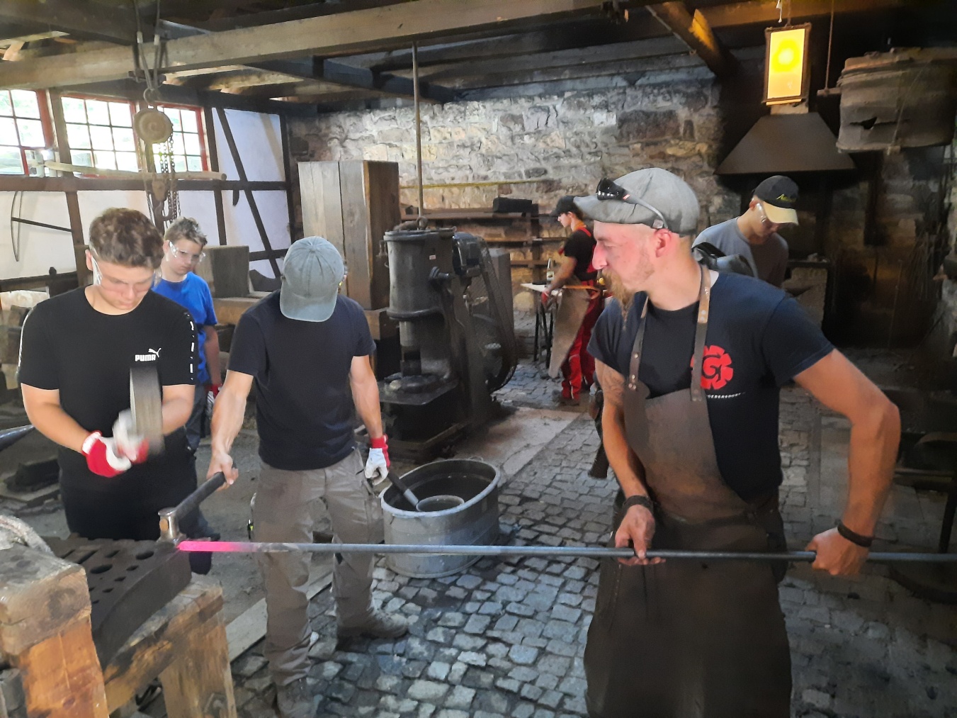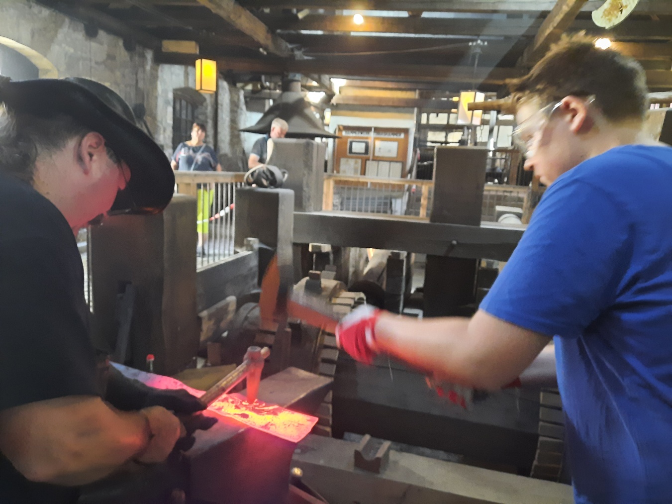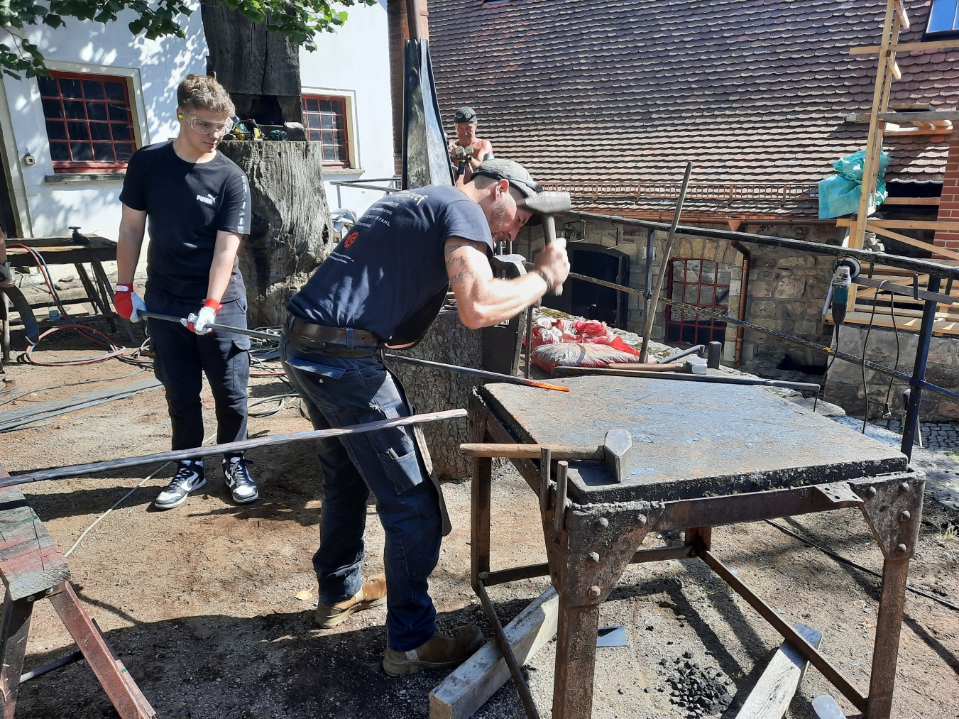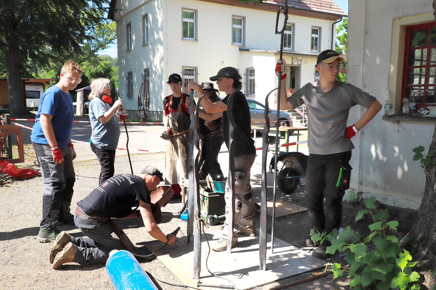 Donnerstag 15.8. – „Tag der Schüler“ – alle holen sich schwarze Hände, Arme, Nasen … zwischen Feuer, Kohlen, Hämmern usw. – siehe Fotos – am Ende unseres Tages ca. 15 Uhr (der Rest der Schule hatte Turbo-Unterricht wegen Sommertemperaturen) war das Team zufrieden mit dem Ergebnis – betreut durch unsere Schmiedemeister Ralf und Philip Greiner aus Gebersdorf