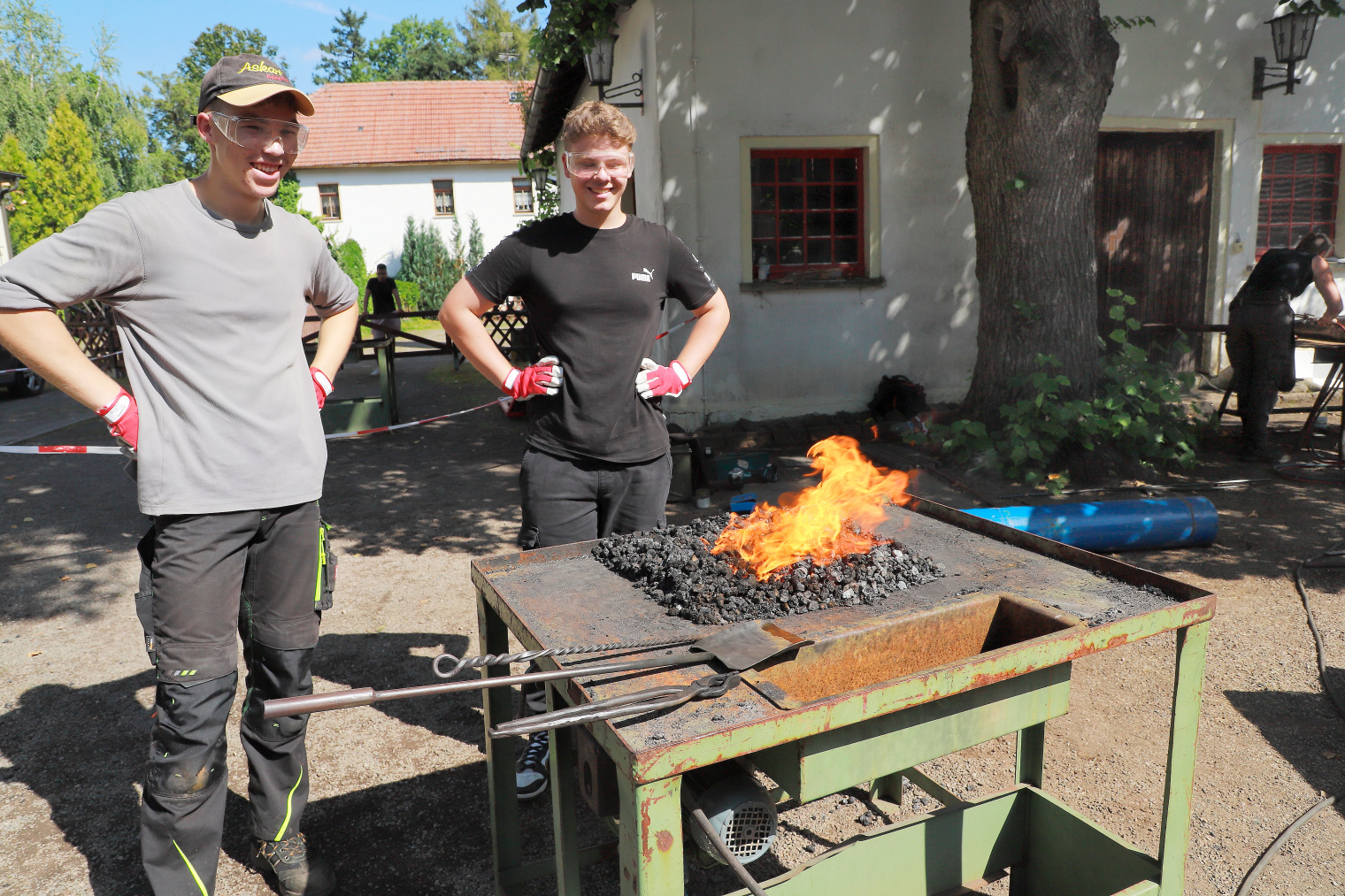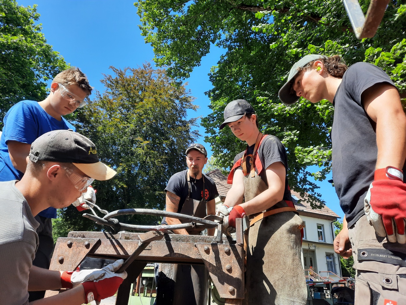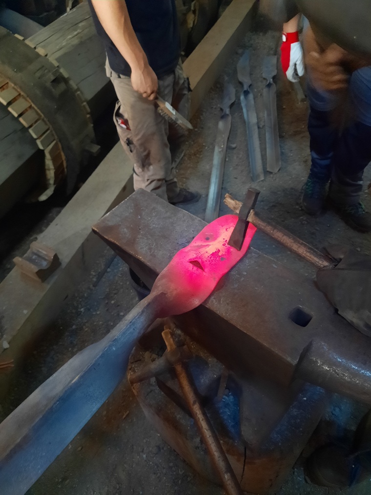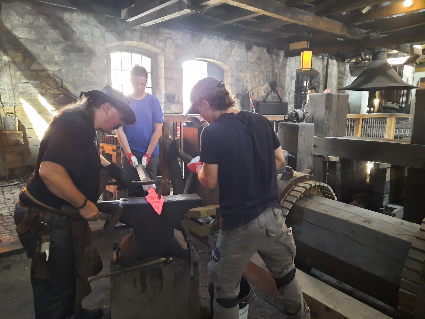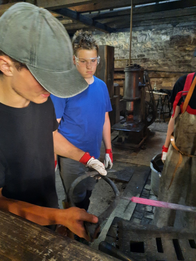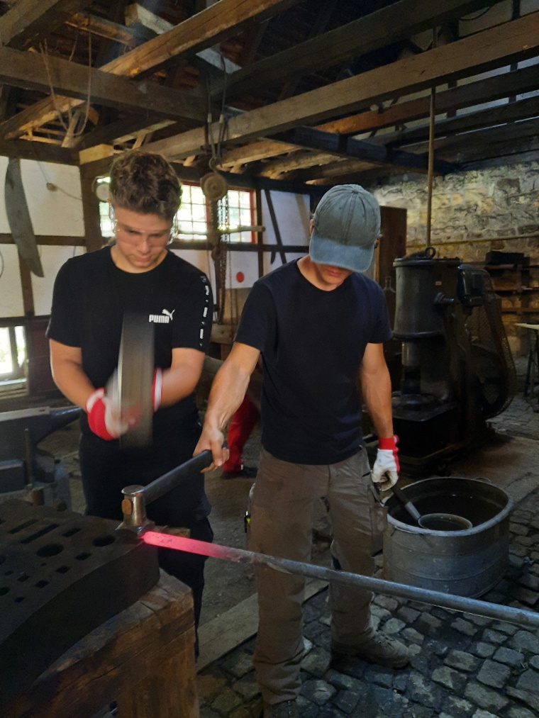 Donnerstag 15.8. – „Tag der Schüler“ – alle holen sich schwarze Hände, Arme, Nasen … zwischen Feuer, Kohlen, Hämmern usw. – siehe Fotos – am Ende unseres Tages ca. 15 Uhr (der Rest der Schule hatte Turbo-Unterricht wegen Sommertemperaturen) war das Team zufrieden mit dem Ergebnis – betreut durch unsere Schmiedemeister Ralf und Philip Greiner aus Gebersdorf