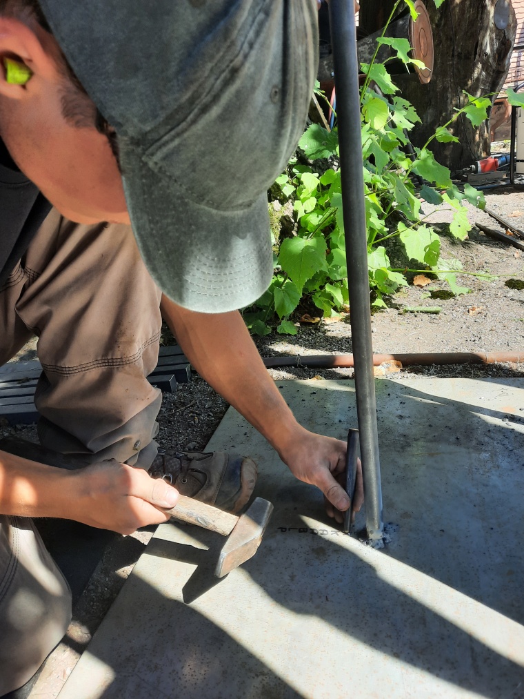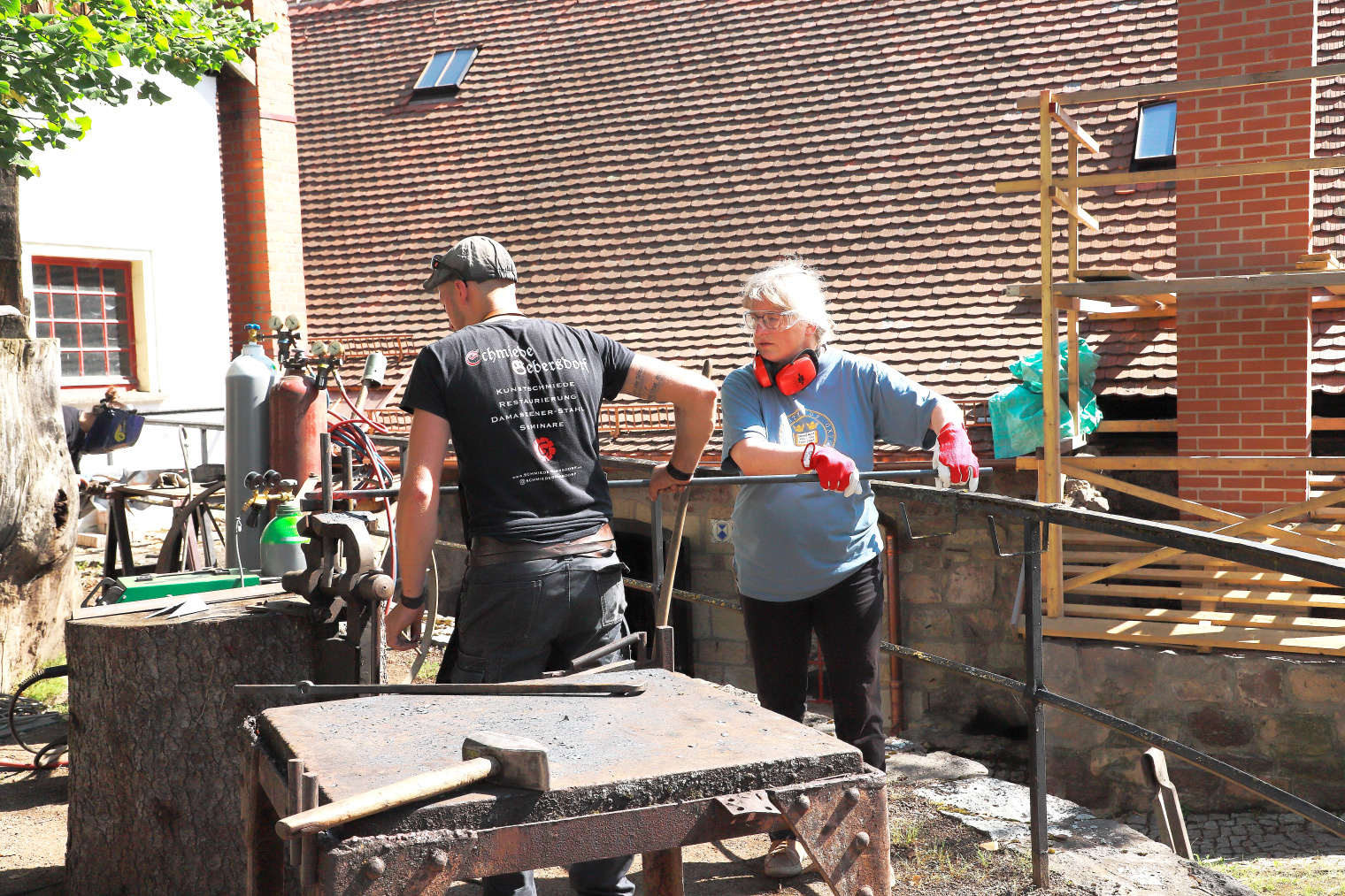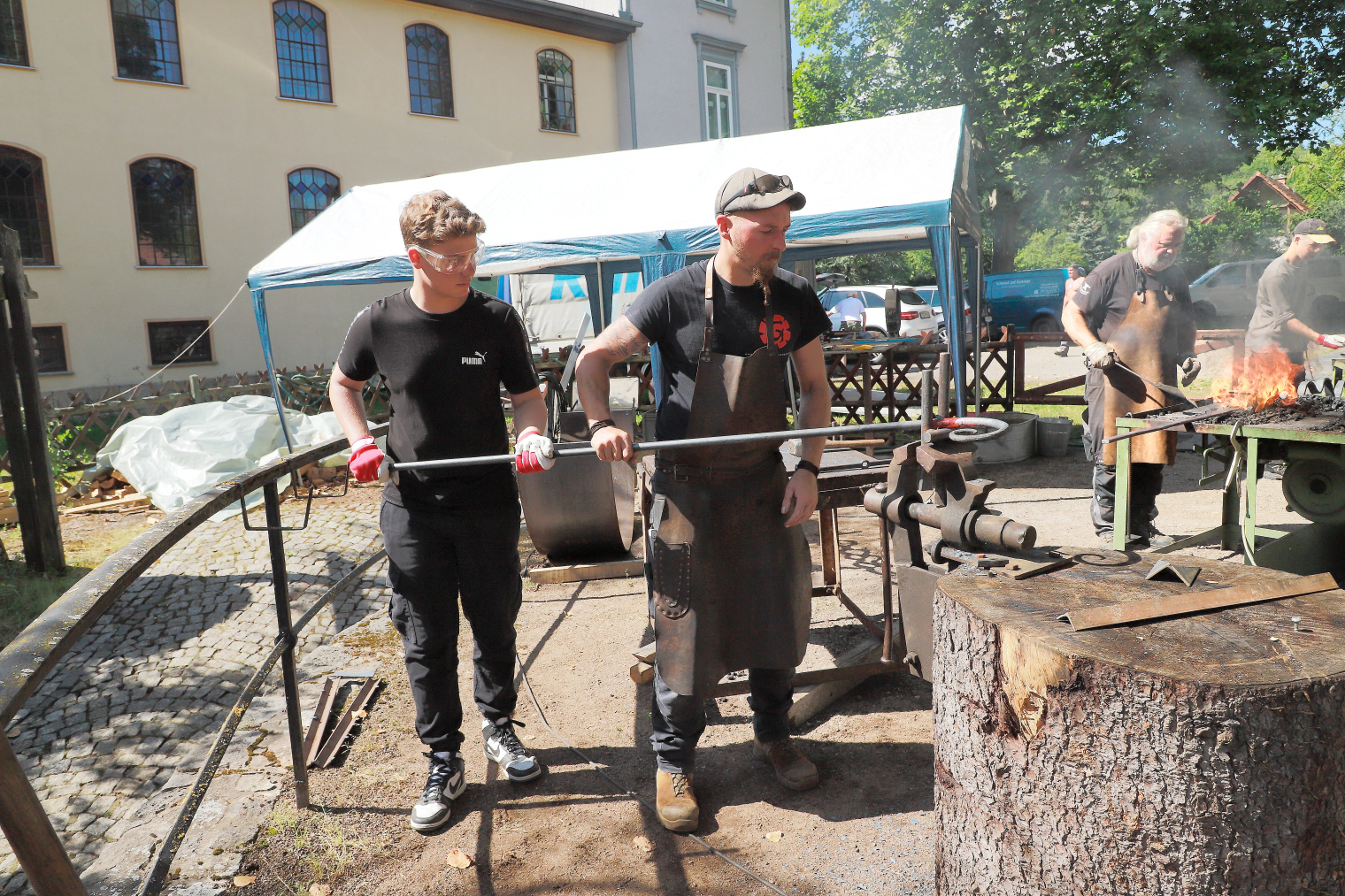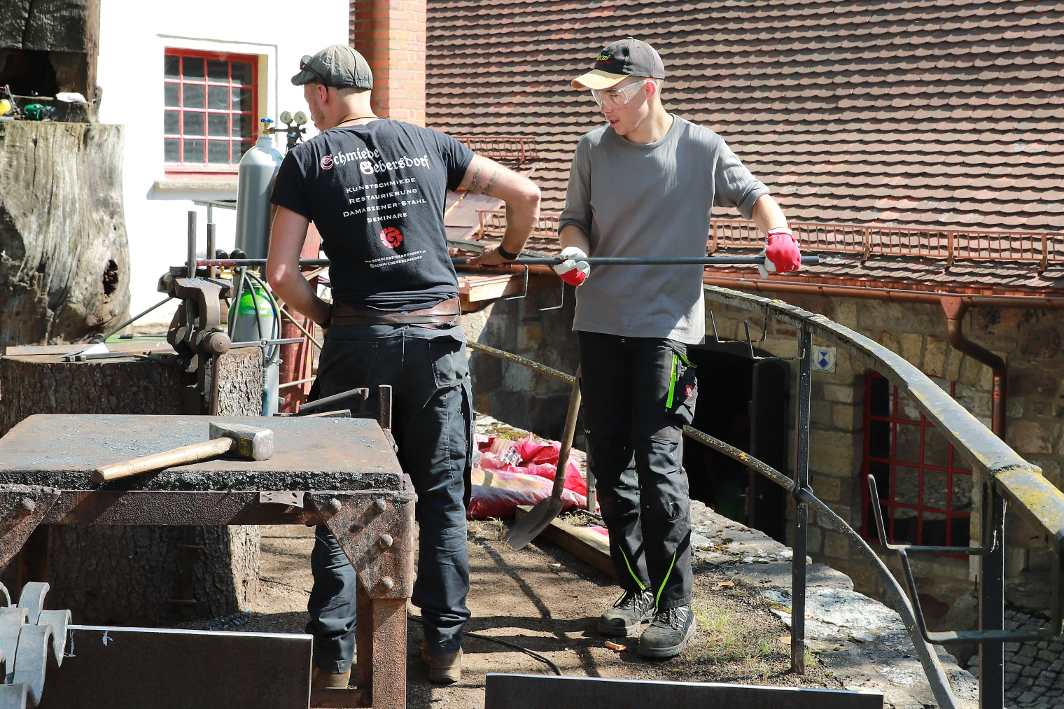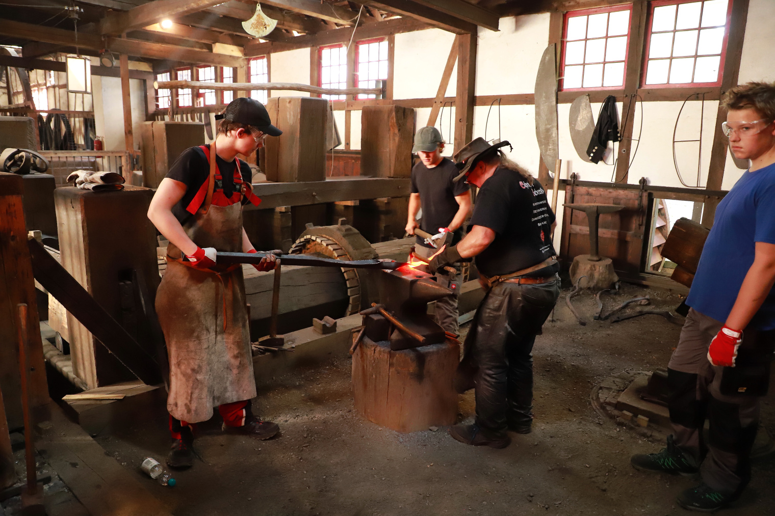 Donnerstag 15.8. – „Tag der Schüler“ – alle holen sich schwarze Hände, Arme, Nasen … zwischen Feuer, Kohlen, Hämmern usw. – siehe Fotos – am Ende unseres Tages ca. 15 Uhr (der Rest der Schule hatte Turbo-Unterricht wegen Sommertemperaturen) war das Team zufrieden mit dem Ergebnis – betreut durch unsere Schmiedemeister Ralf und Philip Greiner aus Gebersdorf