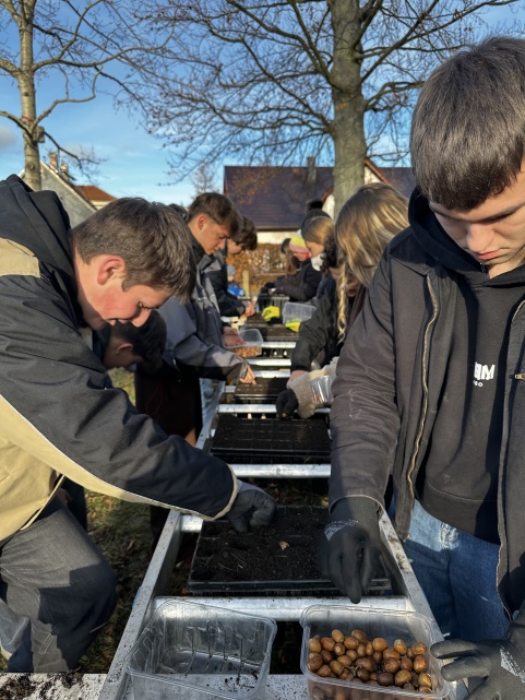 Über 30 Schüler*innen folgten dem Aufruf – und verwandelten einen Freitagnachmittag in eine engagierte Umweltaktion. Ausgestattet mit Eimern, Erde und reichlich Eicheln und Bucheckern füllten sie in nur zwei Stunden mehrere tausend Sammelpflanzbehälter. Nach einer Stärkung am Grill ging es weiter, sodass am Ende beeindruckende 6.300 Samen in die Erde gebracht wurden.