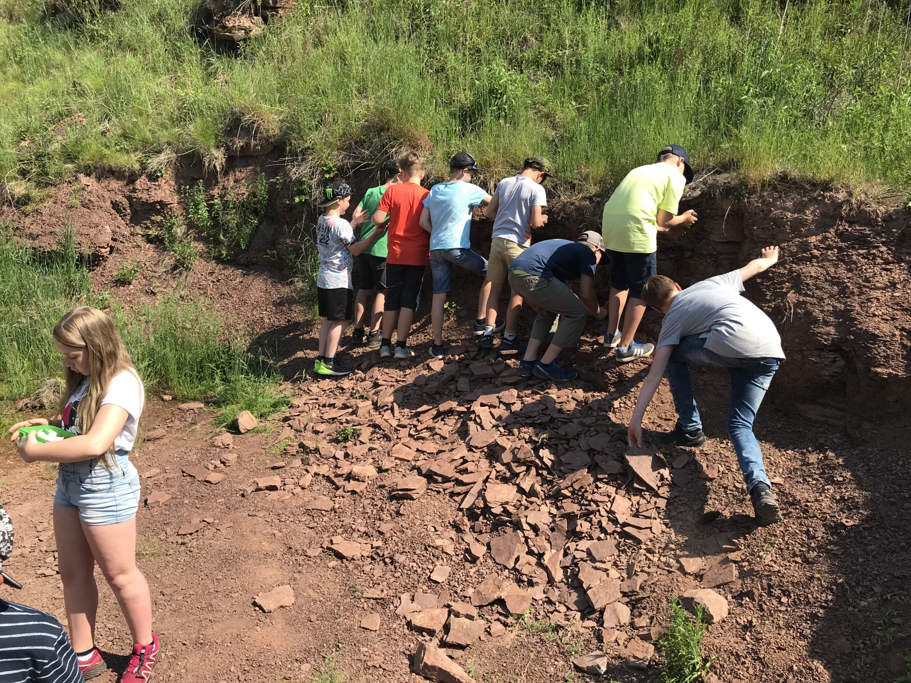 Nach einem letzten theoretischen Input durften die SchülerInnen selbst aktiv werden. Nun ging es ans Ausgraben. Die zuvor im Unterricht hergestellten Fossilien wurden im Vorfeld der Exkursion auf dem Gelände in Rücksprache mit Herrn Brauner versteckt. Bereits nach einigen Minuten wurden die ersten Fossilien gefunden und in der ehemaligen Ausgrabungsstätte wurde wieder gegraben. Die kleinen Hobbypaläontologen fanden alle ihre Fossilien mit großer Begeisterung wieder. Einem Schüler gelang sogar eine kleine Sensation. Kevin fand während der Mini-Ausgrabung eine Platte mit einer Versteinerung aus dem unteren Perm! Nach fachmännischer Betrachtung durch Herrn Brauner, stellte sich heraus, dass es sich dabei um einen frühen Conchostraken (Lioestheria monticula) handelte. Das waren einfache Muschelschaler, die man in ihren heutigen Formen zu den lebenden Fossilien zählt.