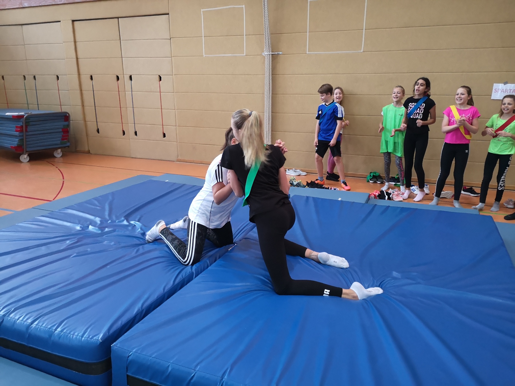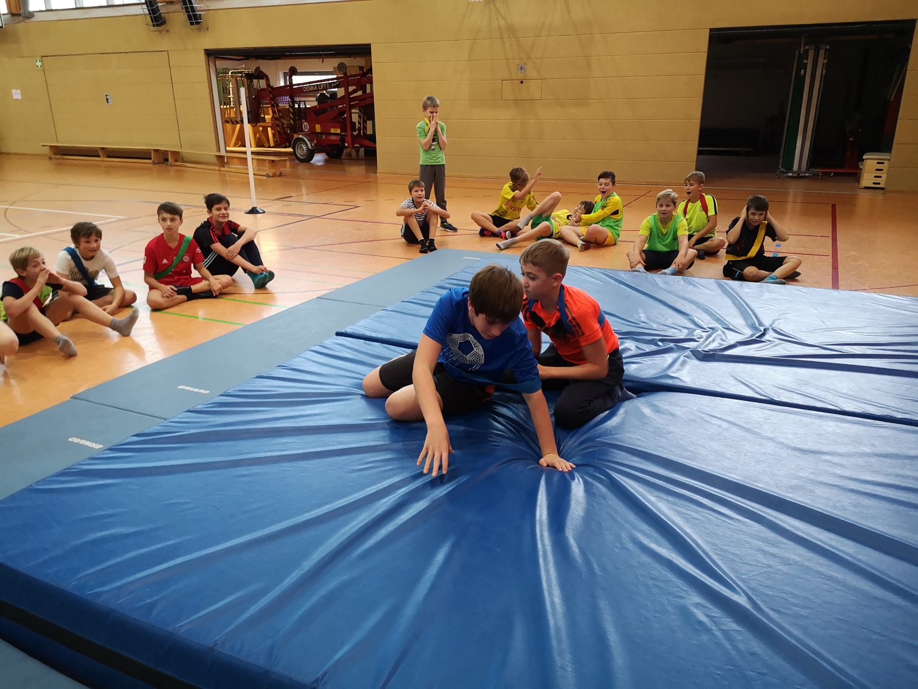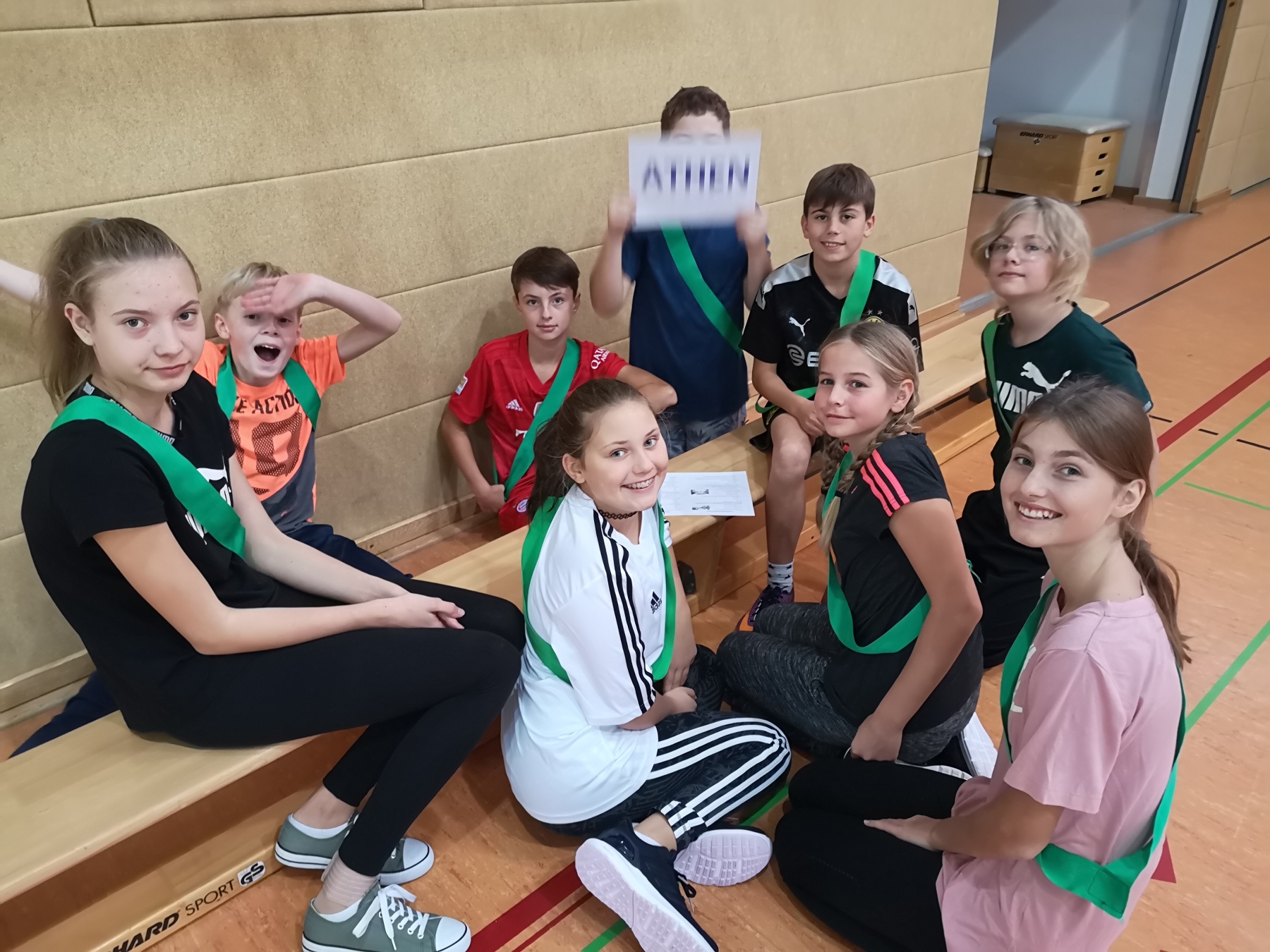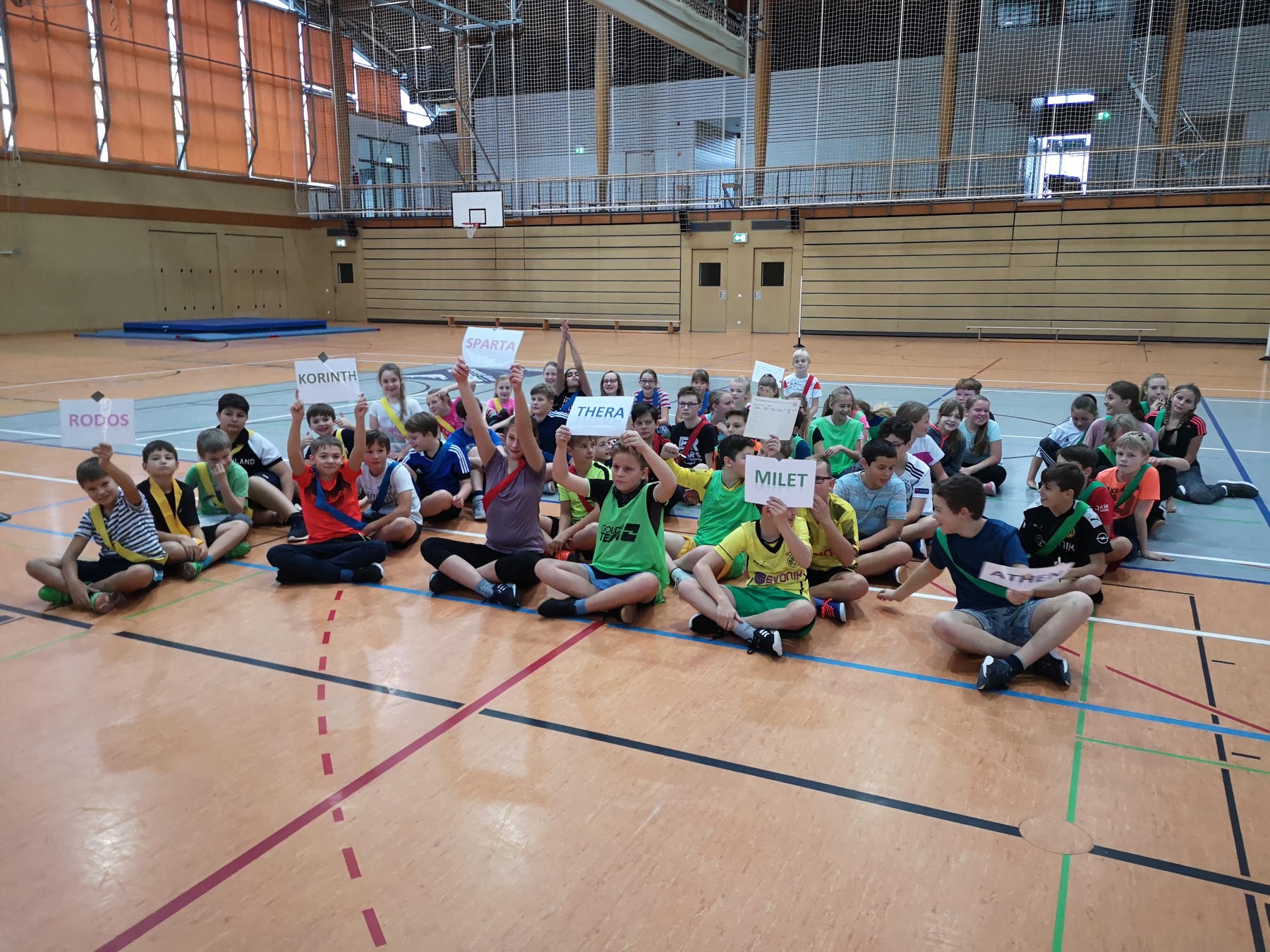 Zunächst wurden die Spiele feierlich eröffnet, der Olympische Eid gesprochen und das Olympische Feuer entzündet. Wie zu Zeiten der alten Griechen traten unsere AthletInnen dann in fünf verschiedenen sportlichen Disziplinen gegeneinander an: Speerwurf, Stadionlauf, Ringen, Diskuswurf und Standweitsprung. Im Zeichen des Teamgeistes vertraten unsere SportlerInnen zudem jeweils eine unterschiedliche griechische Stadt (Rhodos, Korinth, Athen, Sparta, Milet oder Thera) und versuchten für diese im Wettkampf Punkte zu ergattern. Da schon für die Griechen Körper und Geist zusammengehörten, gab es neben den sportlichen Disziplinen auch ein Quiz über die Spiele damals/ heute zu lösen. Während unseres Projekttages gab es tolle sportliche Leistungen zu bestaunen und es wurden Teamgeist, Fairness, und Toleranz gelebt – ganz nach dem olympischen Gedanken. Besonderes Highlight für die AthletInnen war wohl unser Ringkampf, bei dem die Stimmung in der Goldberghalle zum Kochen gebracht wurde.