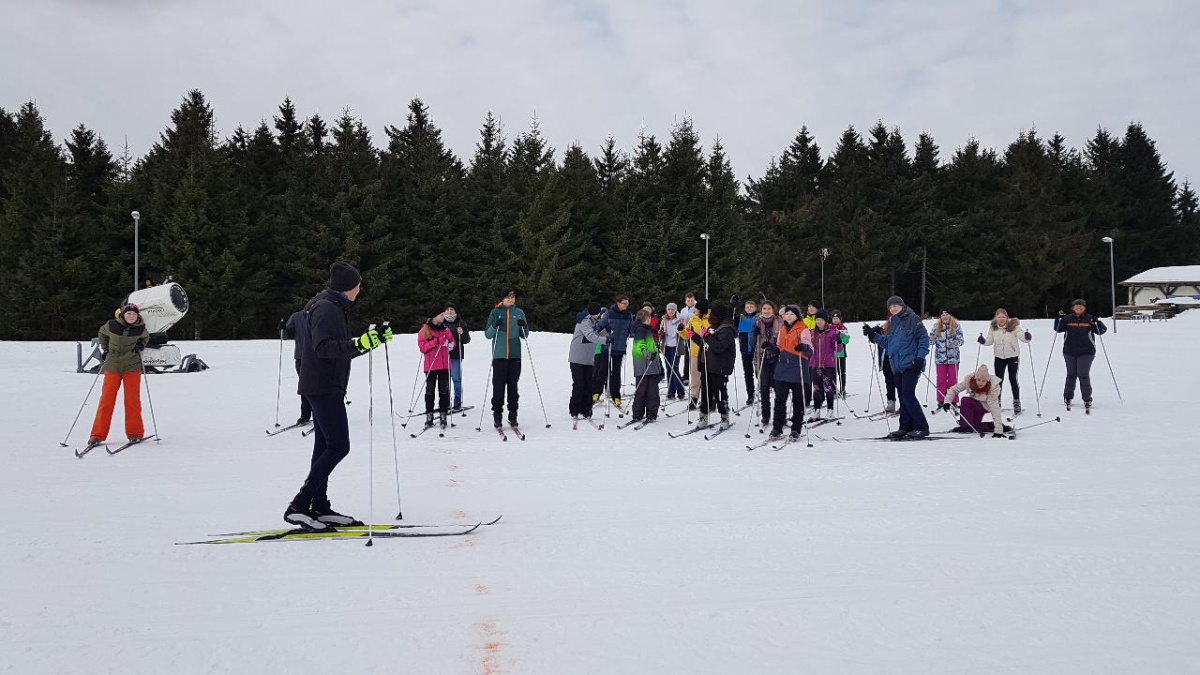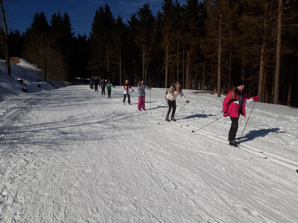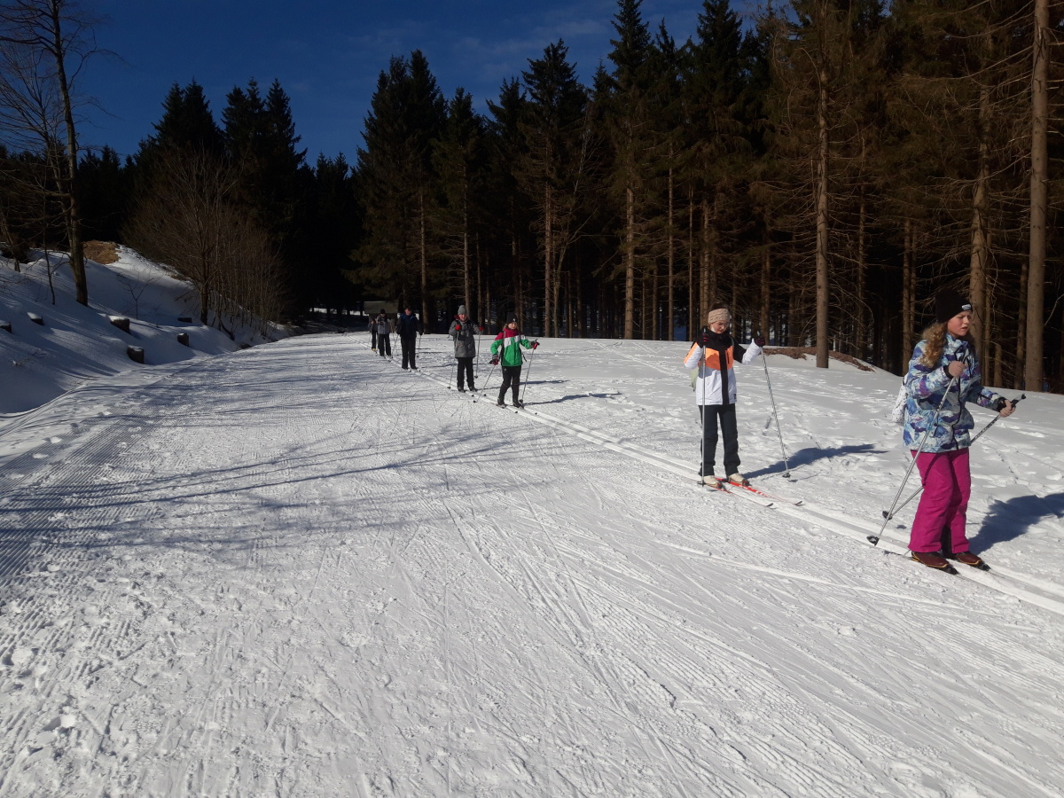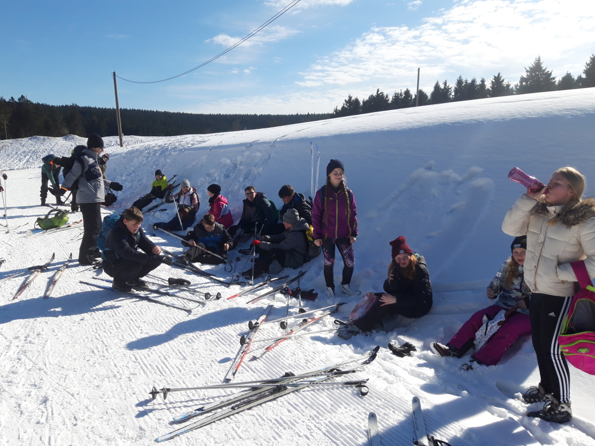 Während die fortgeschrittenen FahrerInnen ihre Ski anschnallten und zum Grenzadler fuhren, nahmen unsere ungeübten SkifahrerInnen den Bus. Strahlender Sonnenschein und optimale Pistenverhältnisse ließen die Skifahrerherzen höherschlagen. Die SchülerInnen, die das erste Mal Langlauf fuhren, sammelten unter Anleitung von Fr. Wittek und Hr. Walter schnell neue Bewegungserfahrungen auf den Brettern und zogen nach nur einer Stunde ihre ersten Bahnen in der Loipe. Die fortgeschrittenen FahrerInnen feilten fleißig gemeinsam mit Fr. Bruder und Hr. Oelsner an ihren Techniken und sammelten Pistenkilometer um Pistenkilometer. Die Mittagspause an der Thüringer Hütte hatten sich alle anschließend redlich verdient. Bratwurst, Brot, Limonade und Tee schmeckten bei herrlichem Sonnenschein nochmal besser. Gestärkt und etwas ausgeruht starteten alle Gruppen wieder in Richtung Skispur. Auch wenn manche SchülerInnen im zweiten Teil motivierende Worte brauchten, gaben alle ihr Bestes und sammelten weiter viele neue Erfahrungen und Eindrücke. Gemeinsam ging es abschließend vom Grenzadler zurück nach Oberhof – diesmal alle mit Skiern. Die ein oder andere tückische Abfahrt sowie der ein oder andere steile Anstieg forderten nochmal alles von unseren AthletInnen. Abgekämpft aber happy kamen alle gesund und unverletzt am Busbahnhof Oberhof an. Die Rückfahrt war ruhig – die viele Bewegung und frische Luft hatten ihr übriges getan. Ein abwechslungsreicher Tag mit vielen gewonnenen Erfahrungen ging zu Ende.