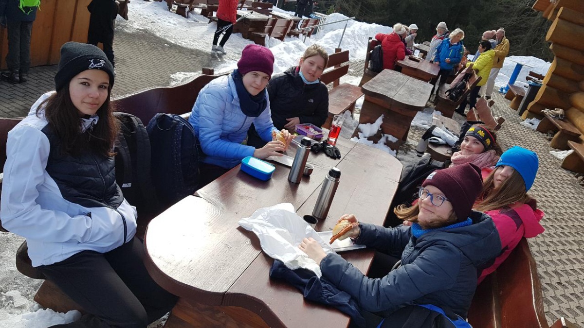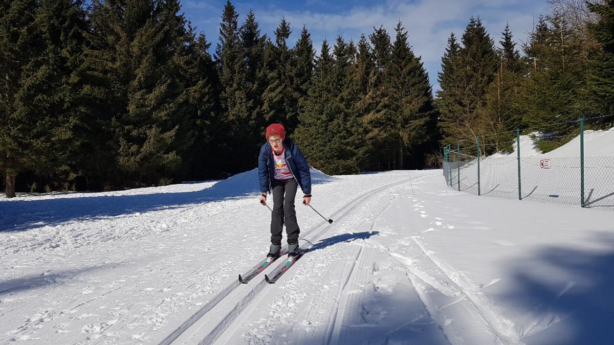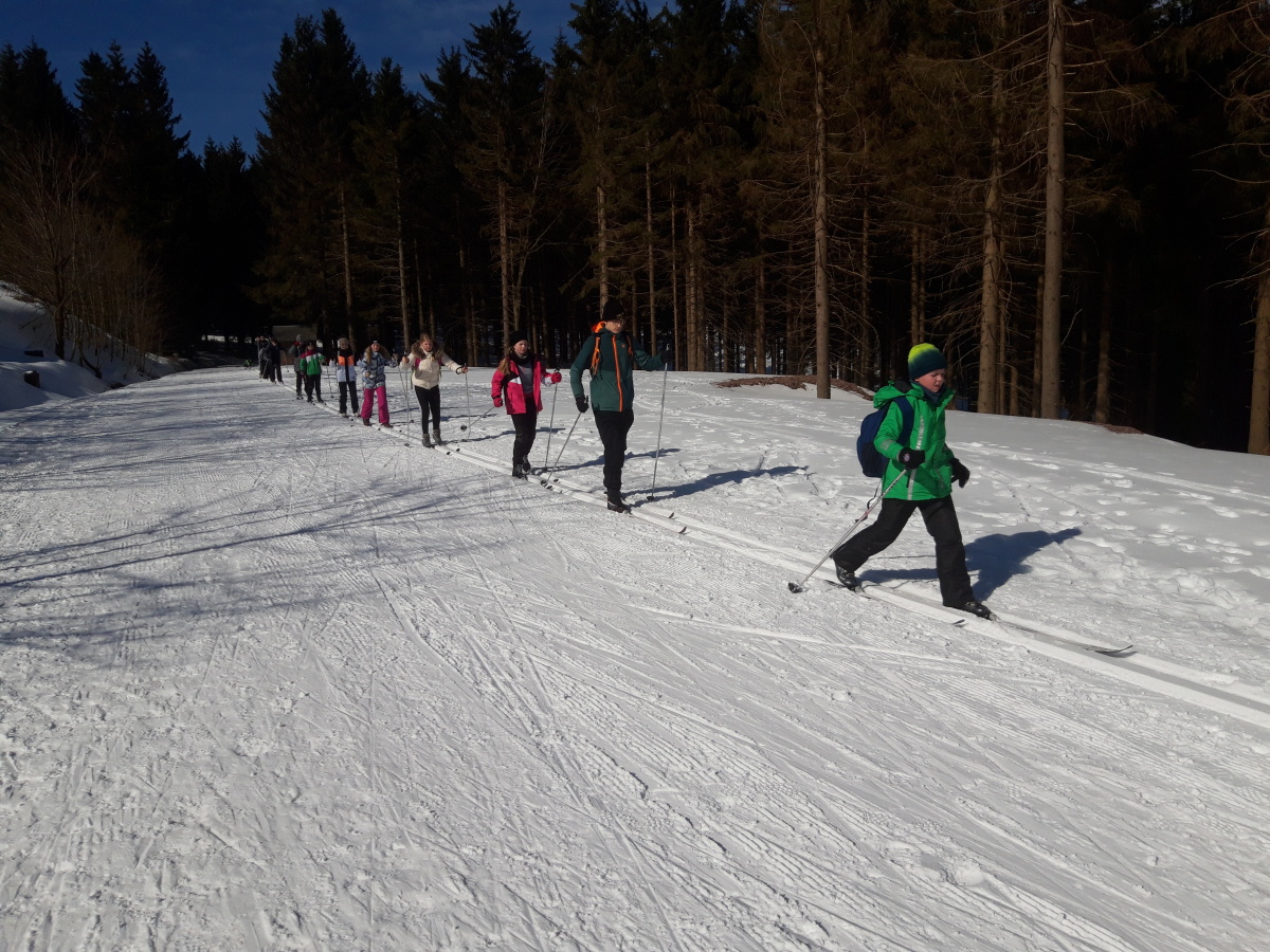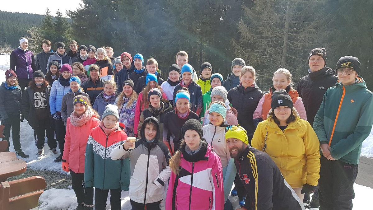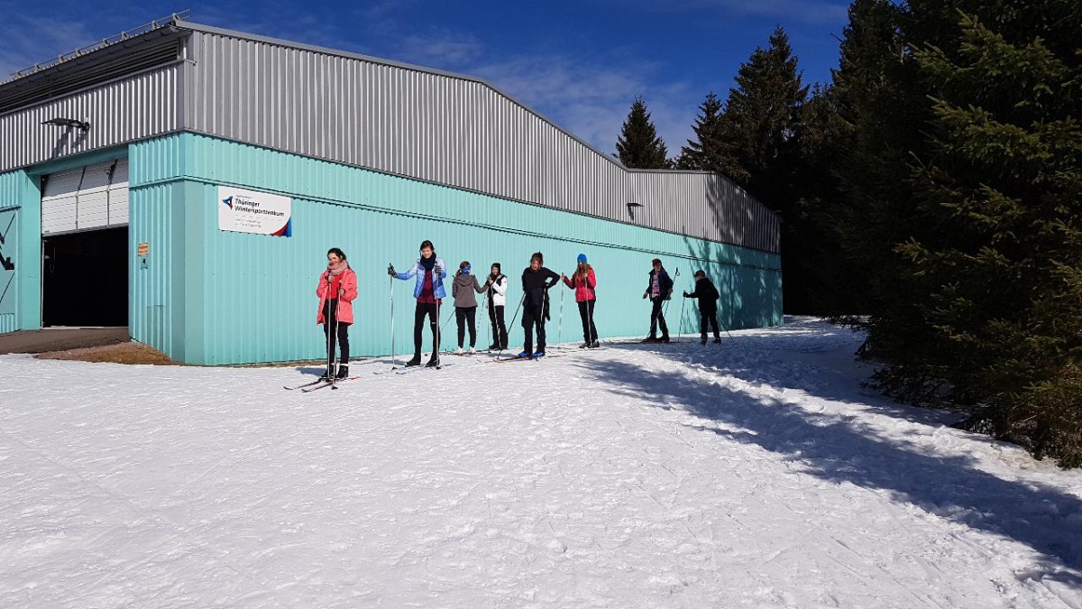 Während die fortgeschrittenen FahrerInnen ihre Ski anschnallten und zum Grenzadler fuhren, nahmen unsere ungeübten SkifahrerInnen den Bus. Strahlender Sonnenschein und optimale Pistenverhältnisse ließen die Skifahrerherzen höherschlagen. Die SchülerInnen, die das erste Mal Langlauf fuhren, sammelten unter Anleitung von Fr. Wittek und Hr. Walter schnell neue Bewegungserfahrungen auf den Brettern und zogen nach nur einer Stunde ihre ersten Bahnen in der Loipe. Die fortgeschrittenen FahrerInnen feilten fleißig gemeinsam mit Fr. Bruder und Hr. Oelsner an ihren Techniken und sammelten Pistenkilometer um Pistenkilometer. Die Mittagspause an der Thüringer Hütte hatten sich alle anschließend redlich verdient. Bratwurst, Brot, Limonade und Tee schmeckten bei herrlichem Sonnenschein nochmal besser. Gestärkt und etwas ausgeruht starteten alle Gruppen wieder in Richtung Skispur. Auch wenn manche SchülerInnen im zweiten Teil motivierende Worte brauchten, gaben alle ihr Bestes und sammelten weiter viele neue Erfahrungen und Eindrücke. Gemeinsam ging es abschließend vom Grenzadler zurück nach Oberhof – diesmal alle mit Skiern. Die ein oder andere tückische Abfahrt sowie der ein oder andere steile Anstieg forderten nochmal alles von unseren AthletInnen. Abgekämpft aber happy kamen alle gesund und unverletzt am Busbahnhof Oberhof an. Die Rückfahrt war ruhig – die viele Bewegung und frische Luft hatten ihr übriges getan. Ein abwechslungsreicher Tag mit vielen gewonnenen Erfahrungen ging zu Ende.