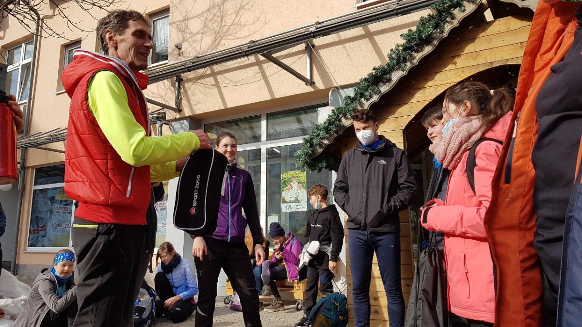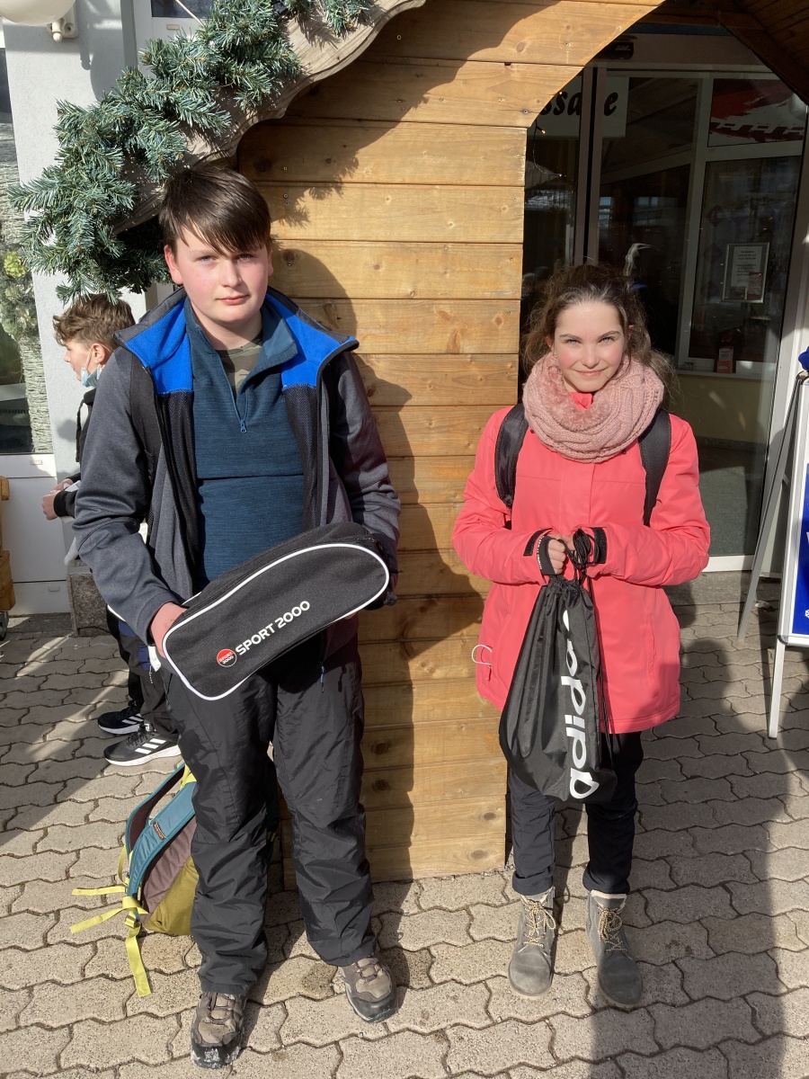 Mit dem Linienbus fuhren wir von Ohrdruf zum Busbahnhof Oberhof, um dort Skischuhe, Stöcke und Langlaufski im Sport 2000 auszuleihen. An dieser Stelle möchten wir uns herzlich beim Sport 2000 und Roberto Kirchner für das hervorragende Material und den freundlichen Service bedanken. Wie nach „Wetten, Dass“-Manier erhielten innerhalb von nur 15 Minuten 43 SchülerInnen ihre Ausrüstung und waren abfahrbereit – rekordverdächtig!