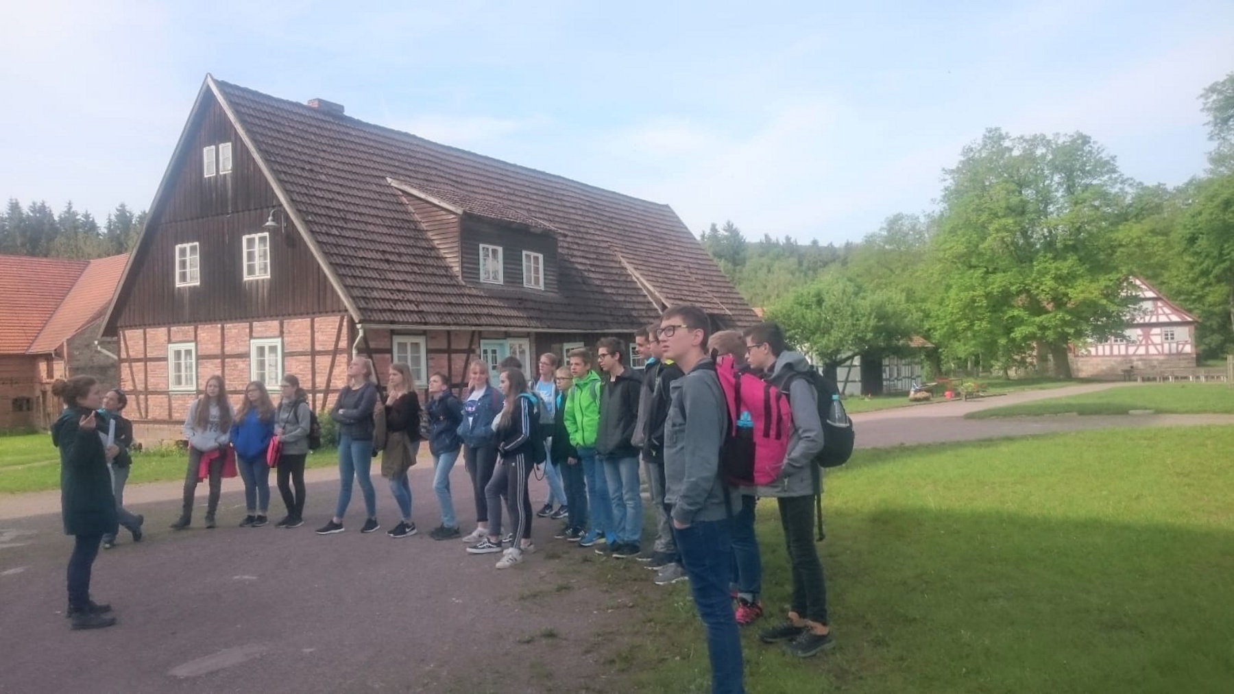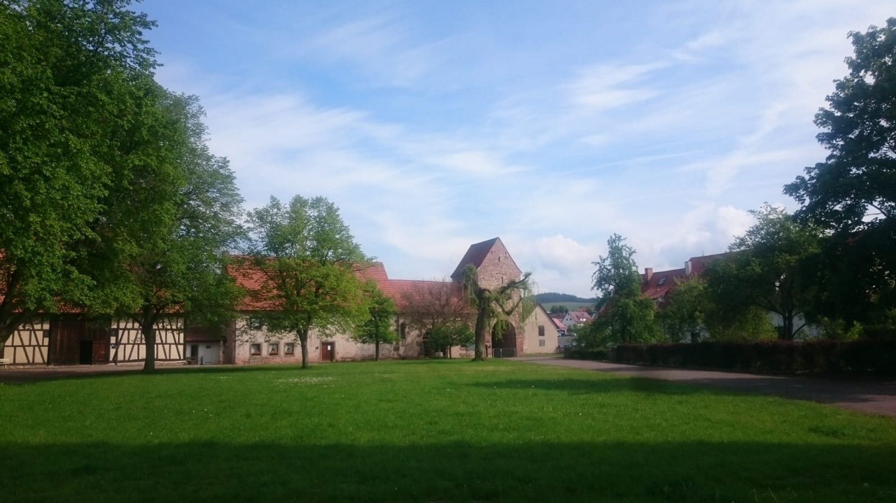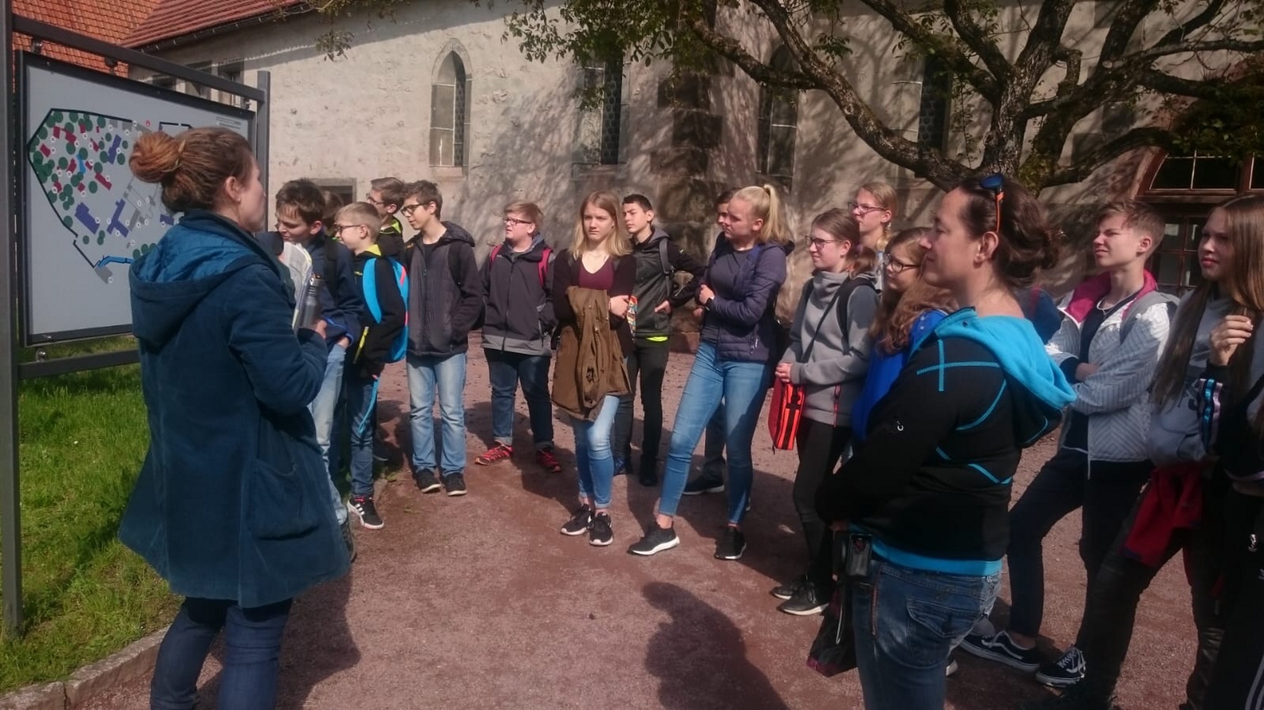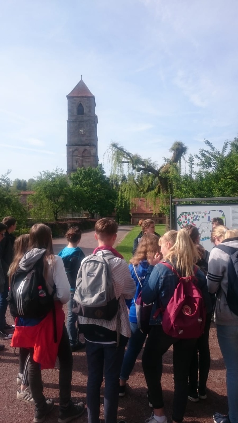 Am 23.05.2019 waren die Klassen 7/1 und 7/2 im Kloster Veßra. Bei herrlichem Sonnenschein starteten wir 8:00 Uhr von der Schule mit einem Bus der Firma „Gessert-Reisen“. Unser Thema lautete: „Wie ein Mönch schreiben“. Nach ca. einer Stunde kamen wir am Kloster an. Diese Klosteranlage war ungefähr so groß wie acht Fußballfelder. Als Erstes machten wir eine Führung durch die Klosteranlage und lernten dabei, wie die Mönche und Nonnen früher lebten. Die Museumspädagogin erklärte uns, wie das Kloster früher aufgebaut war, welcher Epoche es angehörte und wofür sie genutzt wurden. Die Klosterkirche „Sankt Marien“ haben wir uns ganz genau angeschaut. Sie ist heute nur noch eine Ruine, da sie im 20. Jahrhundert abgebrannt ist. Darin befinden sich die Bibraische Kapelle sowie die Südkapelle. In der Bibraischen Kapelle schauten wir uns die Erbbegräbnisstätten zweier Linien der Familie Bibra an. Dann ging unser Rundgang weiter zur Südkapelle. Sie wurde im 13. Jahrhundert errichtet und weist eine bemerkenswerte Baustruktur auf. In der Apsiswand befinden sich drei Lichtöffnungen, durch die zu bestimmten Zeiten das Sonnenlicht fiel und möglicherweise eine Marienfigur anstrahlte. Die Kapelle war ein besonderer Ort der Marienverehrung. An die Kirche schließen sich die Klausurgebäude an. Dort befanden sich unter anderem Schlafräume sowie der Speisen- und Versammlungsraum. Im westlichen Klausurgebäude lebten zur Klosterzeit die Laienbrüder. Später wurde es zu den Wohn- und Wirtschaftsgebäuden umgebaut. Die einzelnen Klausurgebäude waren mit einem Kreuzgang verbunden. Danach gingen wir in das Refektorium in der Südklausur. Dies ist heute ein Museum. Darin befinden sich unter anderem ein Messbuch mit liturgischer Handschrift sowie eine Glocke und das Modell der Klosteranlage. Als wir alles erkundet hatten, durften wir in der Schreibwerkstatt mit Feder und Tinte schreiben. Genauso wie es früher die Mönche getan haben. Wir konnten ausprobieren, wie es sich mit einer Feder schreibt. Zum Gestalten bekamen wir vier verschiedene Farben. Wir lernten auch, woraus früher die Farben hergestellt wurden. Bevor wir die Rückkehr antraten, durften wir die Anlage selbst erkunden. Wir konnten in verschiedene Fachwerkhäuser hinein und sahen, wie die Menschen früher gelebt haben. Nach einem erlebnisreichen Tag ging es wieder zurück zu unserer Schule.