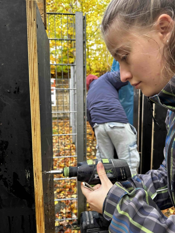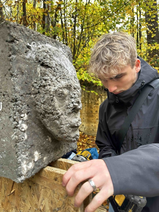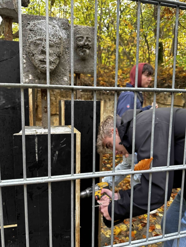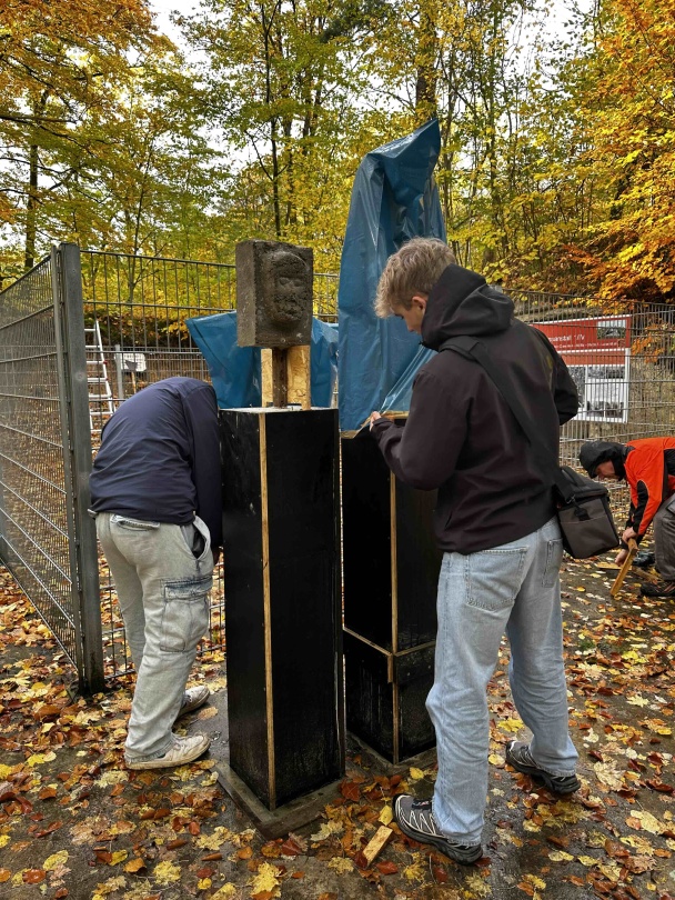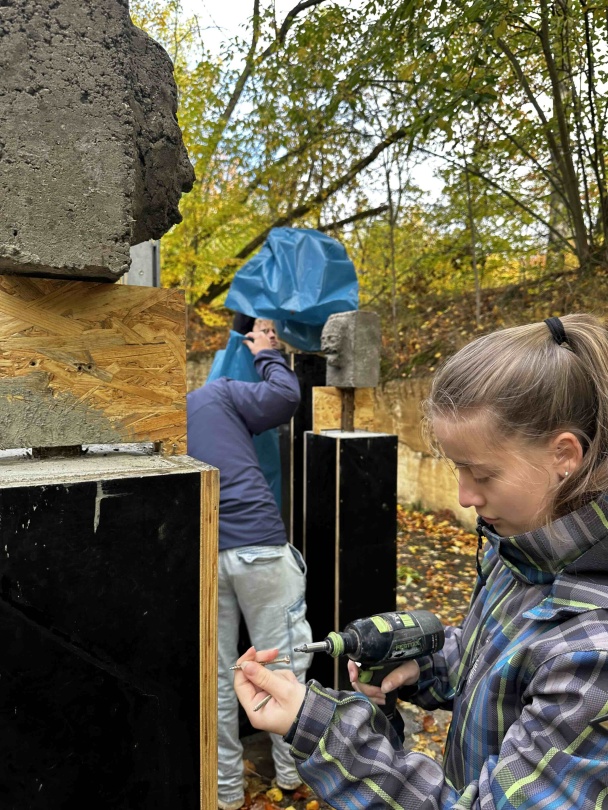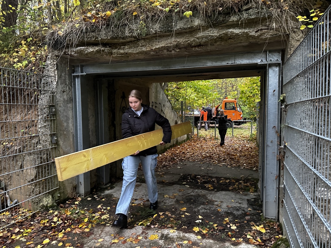 Dank der großen Unterstützung und Vorarbeit des Bauhofs konnten die vorbereiteten Metallkörbe für die Skulpturen aufgestellt, Schalungen gebaut und anschließend mit Beton gefüllt werden. Die Schülerinnen und Schüler halfen tatkräftig beim Errichten der Sockel, die die Skulpturen künftig tragen. Gleichzeitig nutzten sie die Gelegenheit, gemeinsam mit Klaus-Peter Schambach, Vandalismusschäden und Graffiti-Schmierereien an den Wänden der MUNA zu entfernen und den Ort wieder würdevoll zu gestalten.