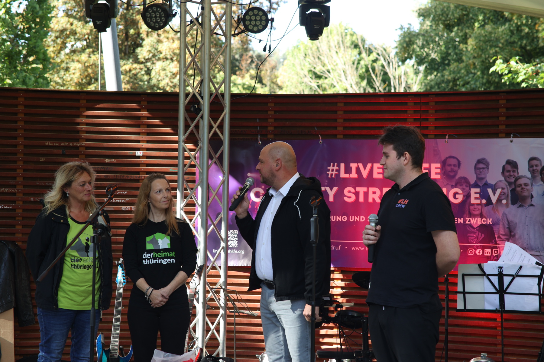 Ein besonderes Highlight folgte direkt nach dem Auftritt der Schulband: Adrian Weber, zweiter Beigeordneter des Landkreises Gotha, übergab einen riesigen Sack Hundefutter an den Vereinsvorstand der Tierheimat Thüringen. Die Freude über diese Sachspende war sehr groß. Weber dankte zudem der Schulband für ihren starken Auftritt und zeigte sich beeindruckt vom musikalischen Engagement der Jugendlichen – nicht zuletzt, da er selbst aktiver Musiker ist.