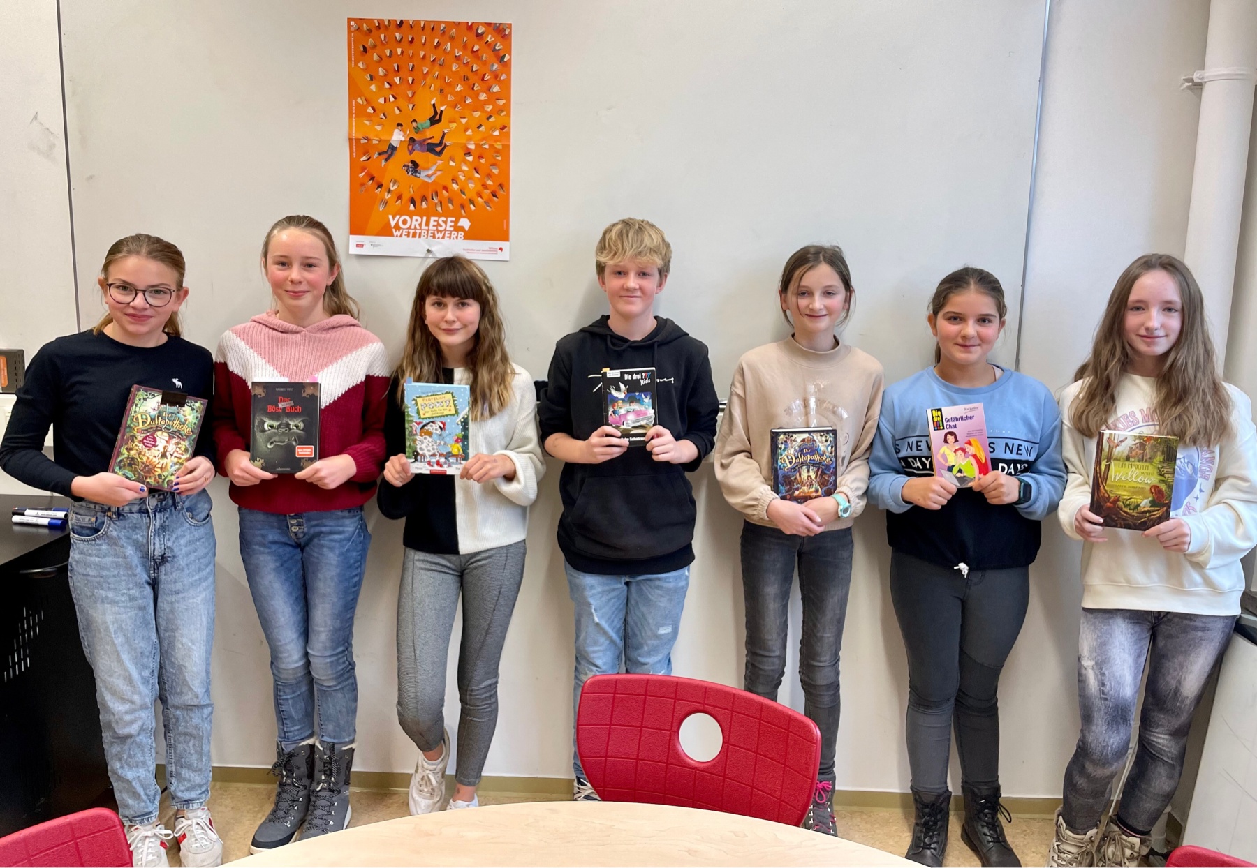 Vanessa John las aus „Die Duftapotheke“, Nele Oelsner präsentierte einen Textauszug aus „Das kleine Böse Buch“, Emma Brünn hat ebenfalls „Die Duftapotheke“ ausgewählt, Leni Niedermeier stellte der Jury und den anderen Teilnehmern das Buch „Plötzlich Pony“ vor, Lena Reimann hat einen Auszug aus dem Buch „Die drei !!!“ gelesen, Hanna Ziegler konnte mit einer Textstelle aus dem Jugendbuch „Ein Mädchen namens Willow“ überzeugen und Jakob Heyn beendete die erste Runde mit seinem Lesevortrag aus dem Buch „Die drei ???“.