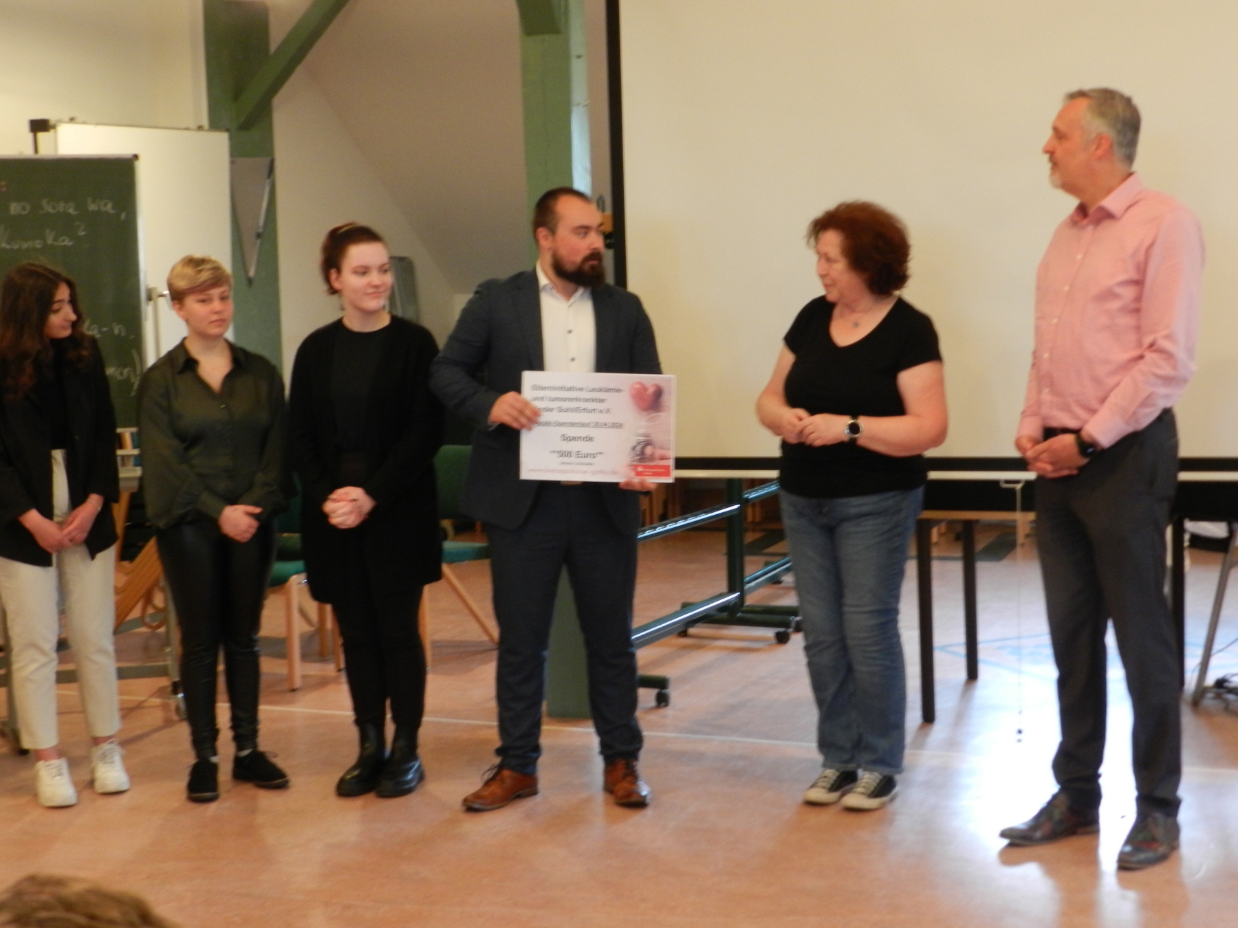 Die Spendenübergabe fand in einer feierlichen Zeremonie in der Aula des Gymnasiums statt. Unser Schulleiter Herr Marschner würdigte das Engagement der Schulgemeinschaft und bedankte sich bei allen Beteiligten. „Dieser Sponsorenlauf zeigt, was wir gemeinsam erreichen können. Ich bin stolz auf unsere Schülerinnen und Schüler und dankbar für die großzügige Unterstützung der Kreissparkasse Gotha“, betonte er in seiner Ansprache.
