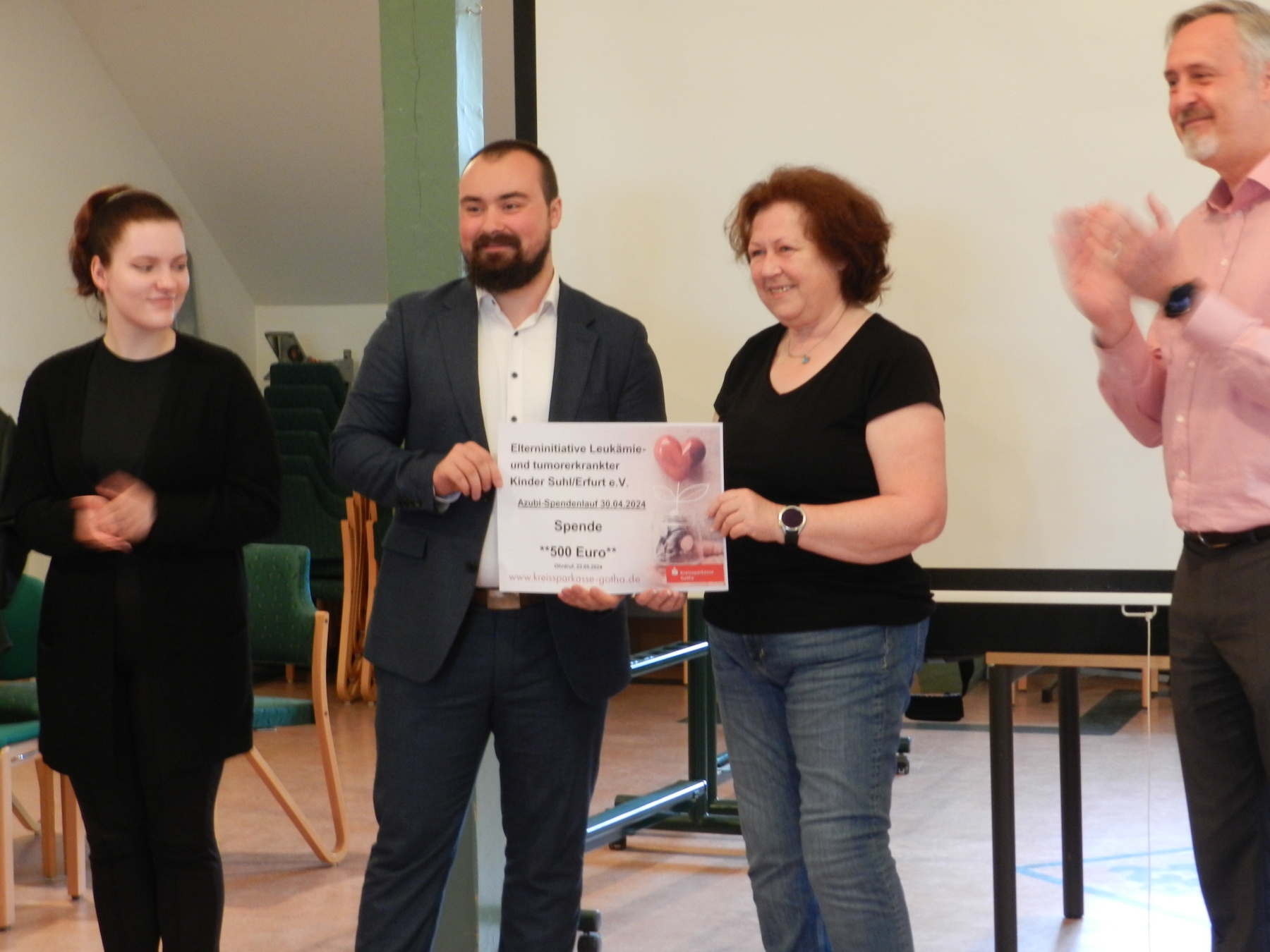 Die gesammelten Spenden wurden an die Elterninitiative leukämie- und tumorerkrankter Kinder Suhl/Erfurt e.V. übergeben. Diese Initiative unterstützt Familien mit erkrankten Kindern und bietet ihnen in dieser schwierigen Zeit wichtige Hilfe und Unterstützung. So brachte auch Frau Allstädt in Vertretung der Elterninitiative leukämie- und tumorerkrankter Kinder Suhl/Erfurt e.V. ihre Dankbarkeit und Hochachtung vor dieser überwältigenden Spendenaktion zum Ausdruck.