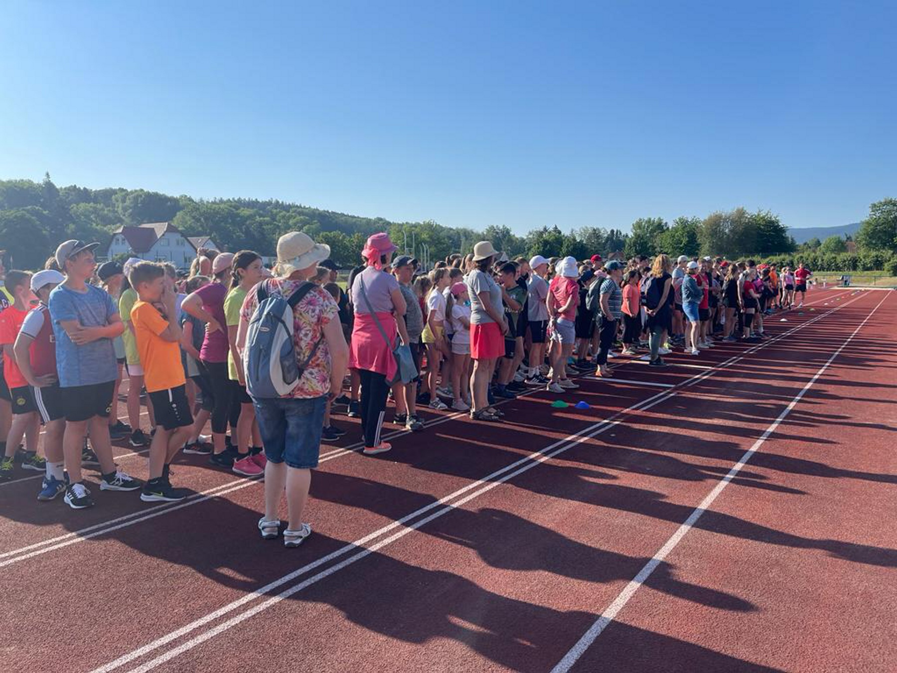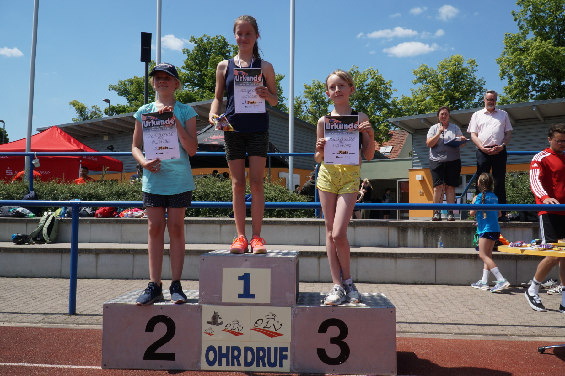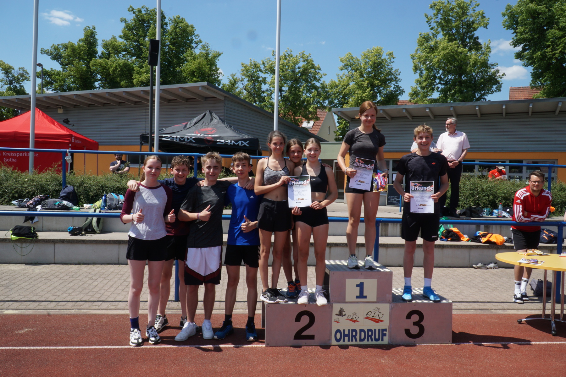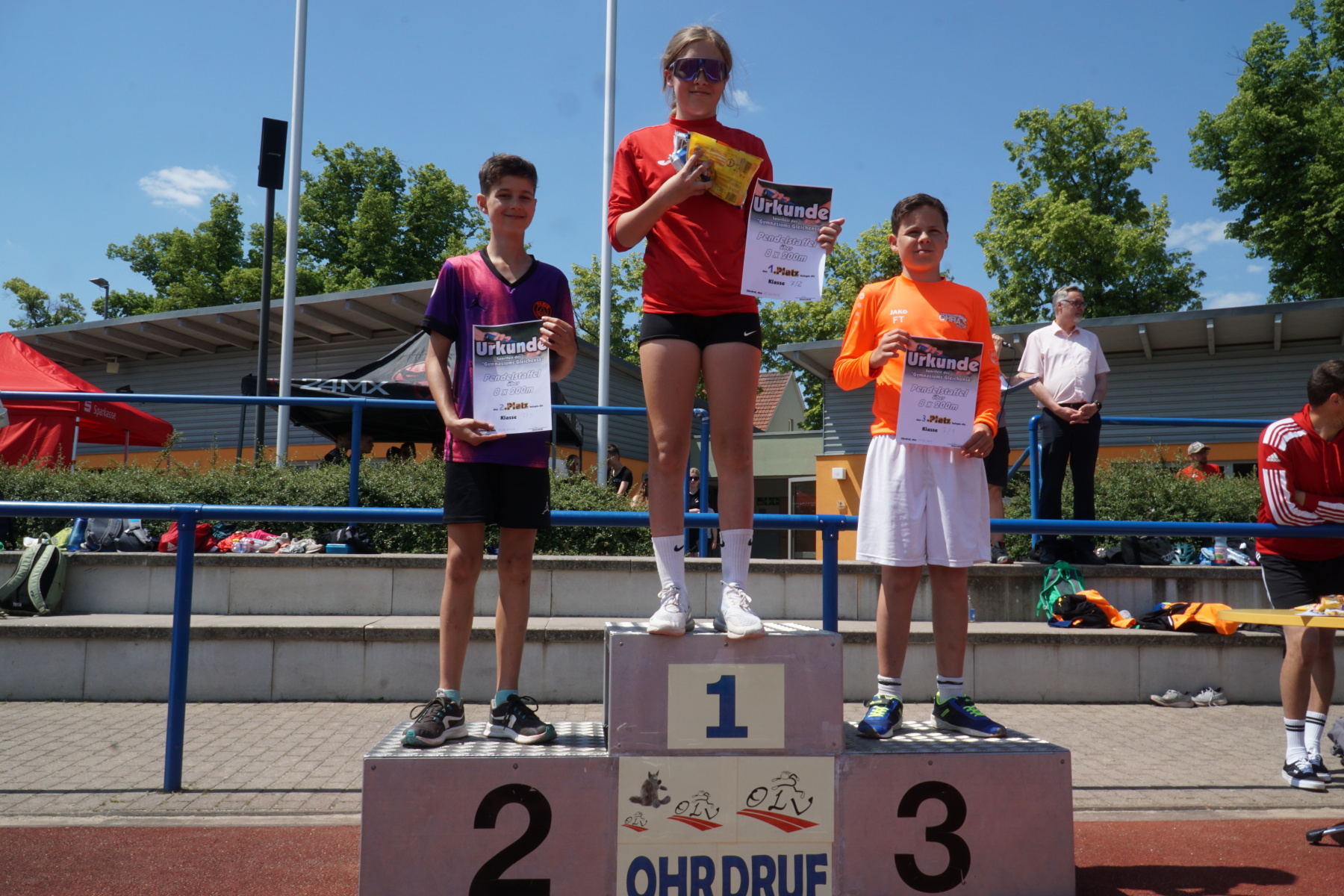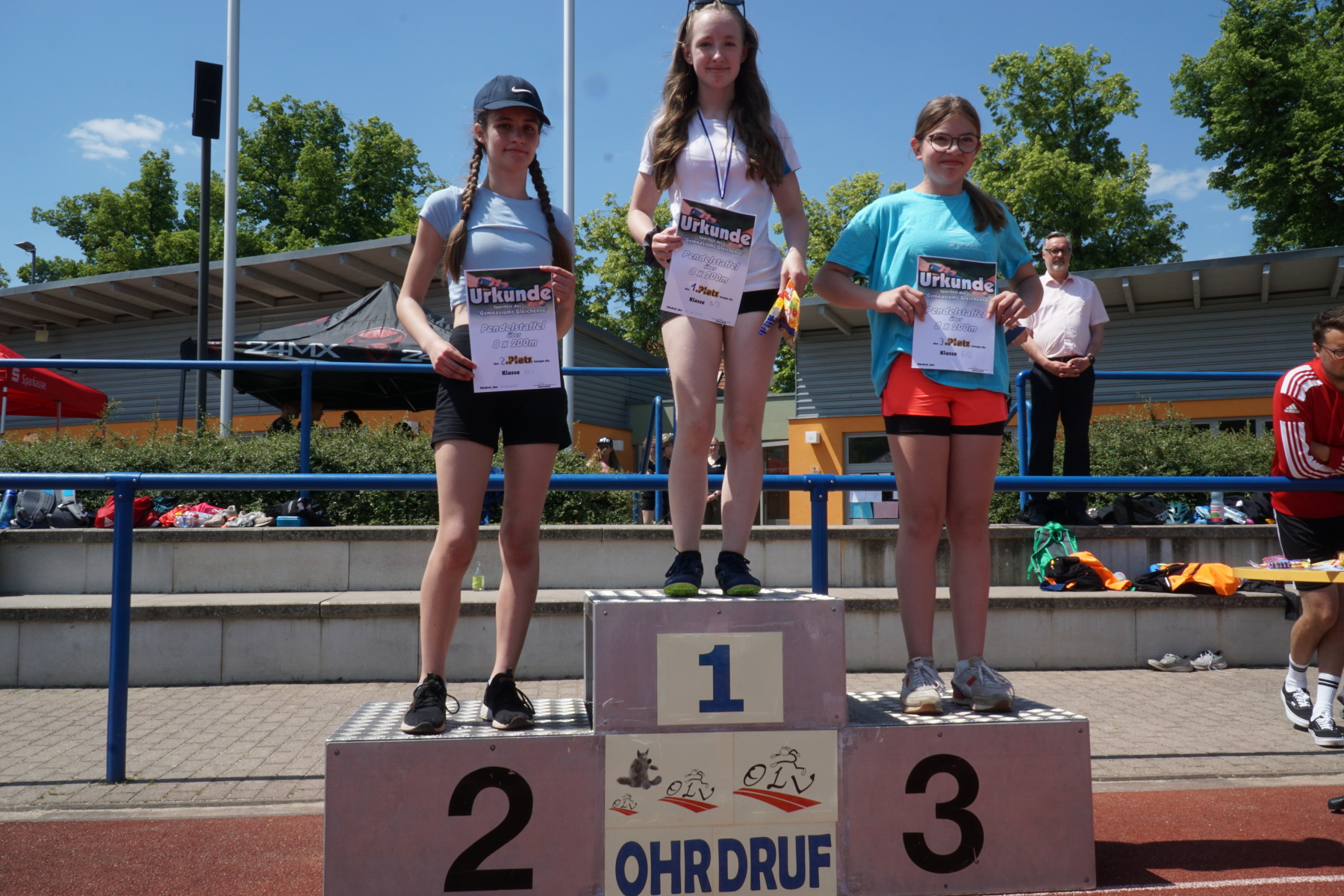 Bei strahlendem Sonnenschein veranstaltete das Gymnasium „Gleichense“ am 13. Juni 2023 das jährliche Sportfest in Ohrdruf. Unsere Sportler der Klassenstufen 5 – 10 konnten sich in den Disziplinen Ballwurf/Kugelstoßen, Sprint sowie Weitsprung messen und unter hervorragenden Bedingungen persönliche Bestleistungen erzielen. An den Dreikampf angeschlossen, bei dem die ersten drei Plätze aller Klassenstufen durch Medaillen und kleine Preise geehrt wurden, erfolgten die Pendelstaffeln. Der Förderverein stellte eine Fitnesstheke mit frischem Obst und Gemüse zur Verfügung, an der die Schüler nötige Vitamine sammeln konnten. Auch die Firma „Enjoy“ sorgte durch einen Imbiss für optimale Versorgung unserer Teilnehmer. Ein Teil der Einnahmen sowie der anschließende Spendenlauf, organisiert durch eine Seminarfachgruppe der 11. Klasse, gingen als Spende zu Gunsten des Bodelschwingh-Hofes ein.
