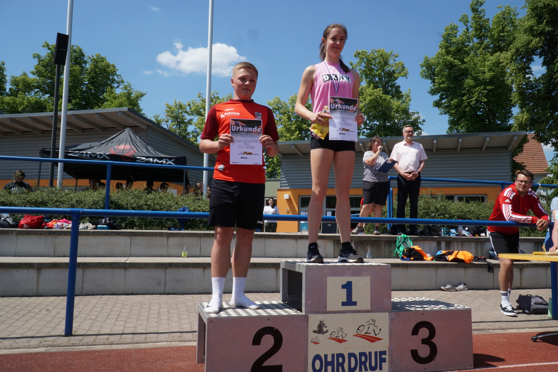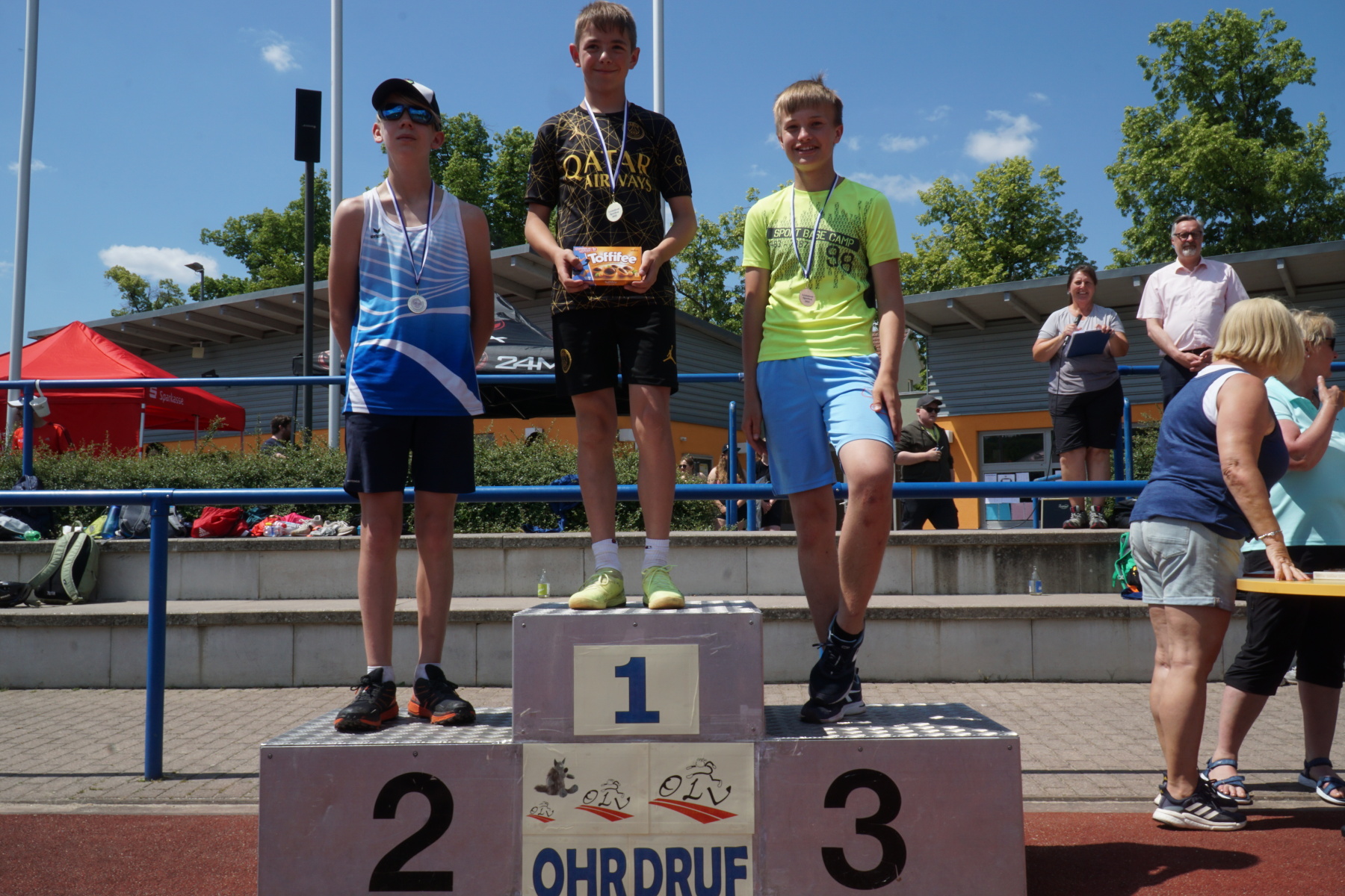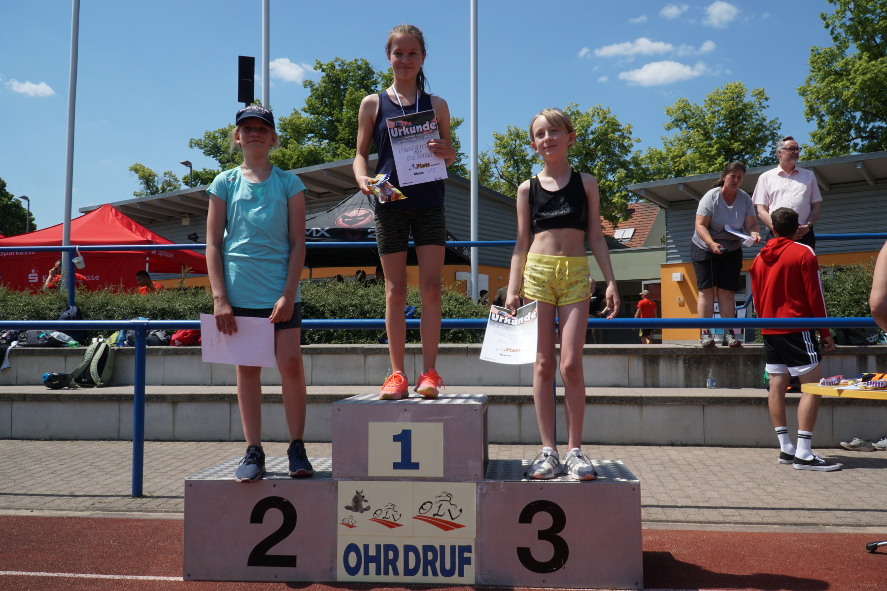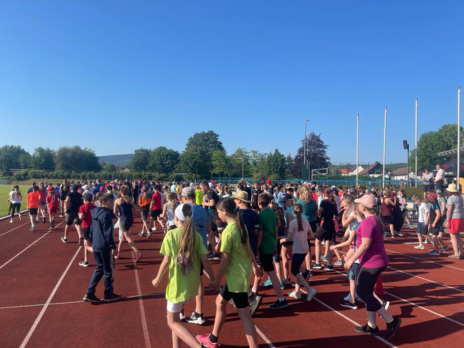 Bei strahlendem Sonnenschein veranstaltete das Gymnasium „Gleichense“ am 13. Juni 2023 das jährliche Sportfest in Ohrdruf. Unsere Sportler der Klassenstufen 5 – 10 konnten sich in den Disziplinen Ballwurf/Kugelstoßen, Sprint sowie Weitsprung messen und unter hervorragenden Bedingungen persönliche Bestleistungen erzielen. An den Dreikampf angeschlossen, bei dem die ersten drei Plätze aller Klassenstufen durch Medaillen und kleine Preise geehrt wurden, erfolgten die Pendelstaffeln. Der Förderverein stellte eine Fitnesstheke mit frischem Obst und Gemüse zur Verfügung, an der die Schüler nötige Vitamine sammeln konnten. Auch die Firma „Enjoy“ sorgte durch einen Imbiss für optimale Versorgung unserer Teilnehmer. Ein Teil der Einnahmen sowie der anschließende Spendenlauf, organisiert durch eine Seminarfachgruppe der 11. Klasse, gingen als Spende zu Gunsten des Bodelschwingh-Hofes ein.